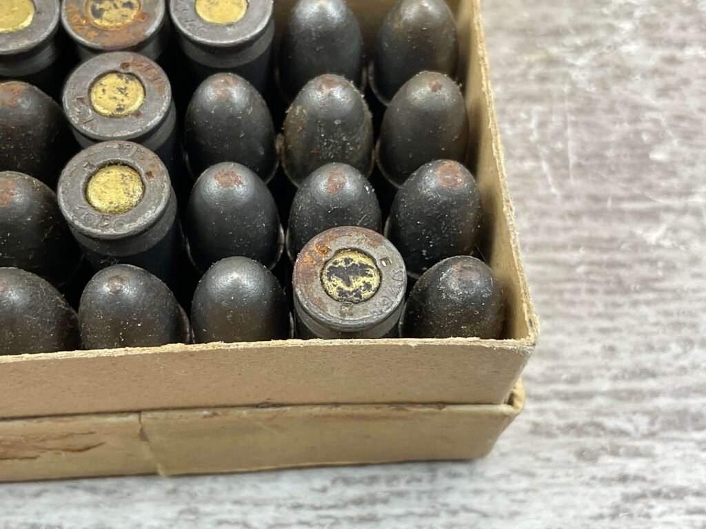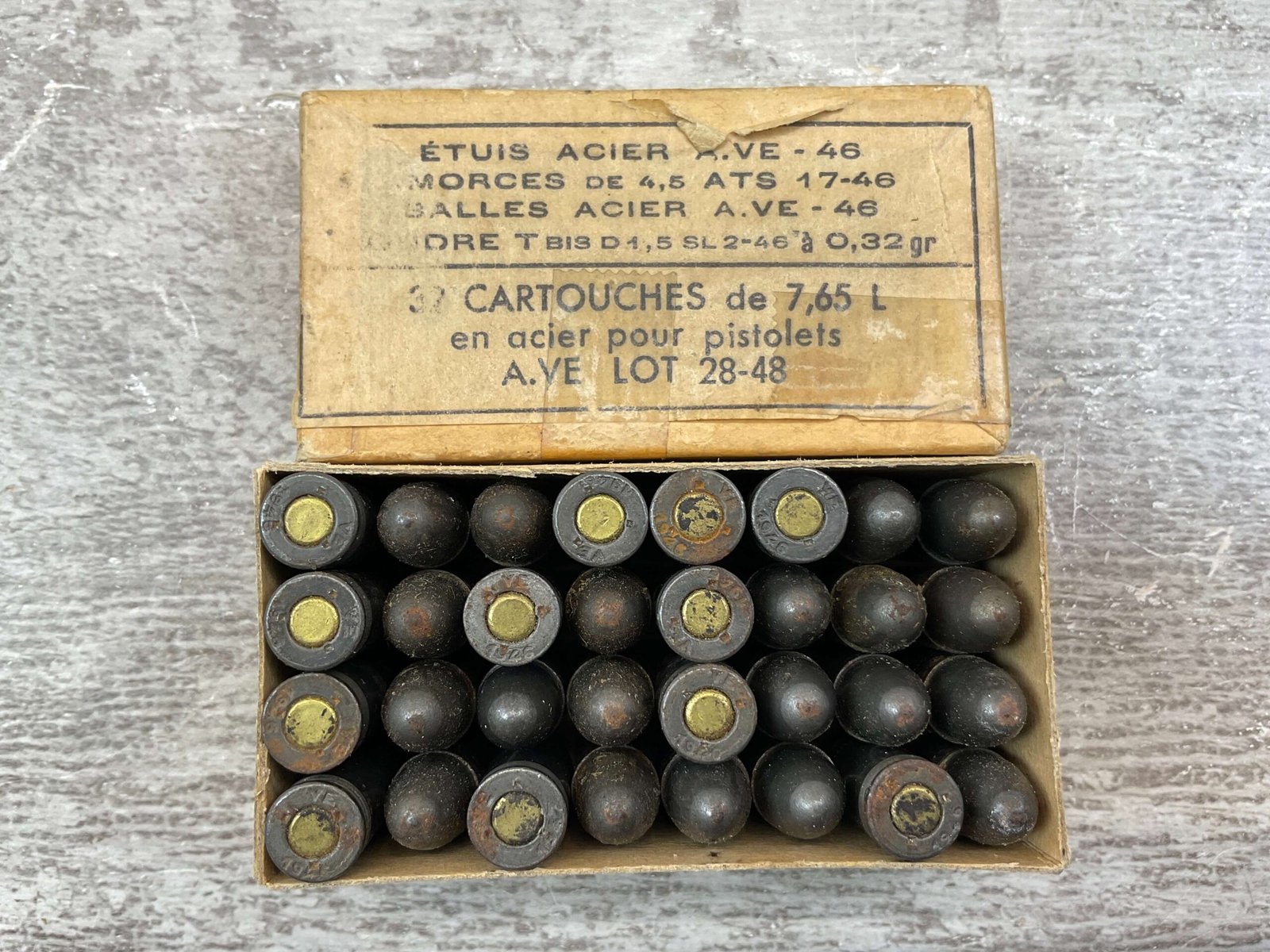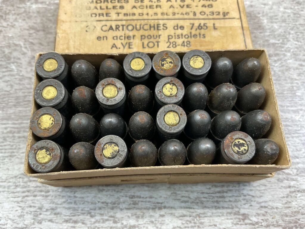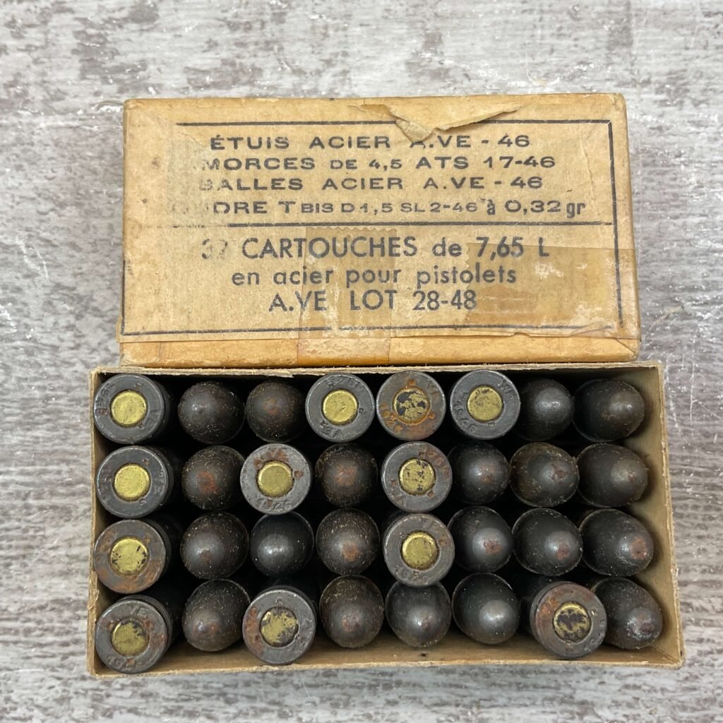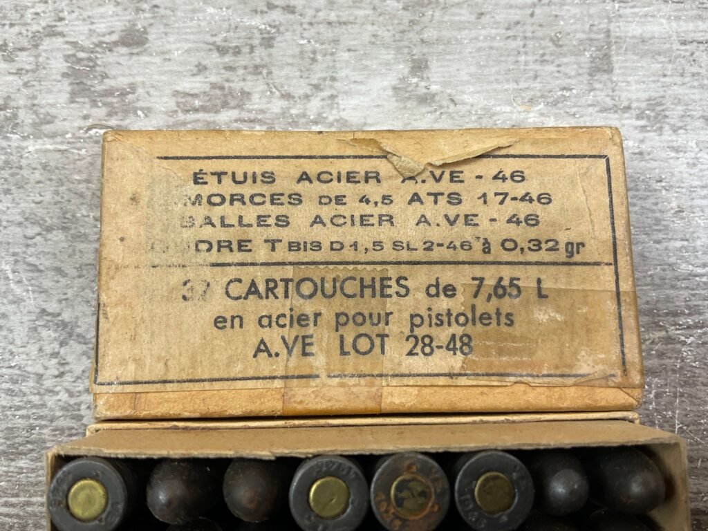 FRENCH 7.65 LONG AMMO, 1946 & 1947, 32 RNDS, VINTAGE, FULL BOX, BOX IS IN VG CONDITION FOR AGE AND DISPLAYS WELL!