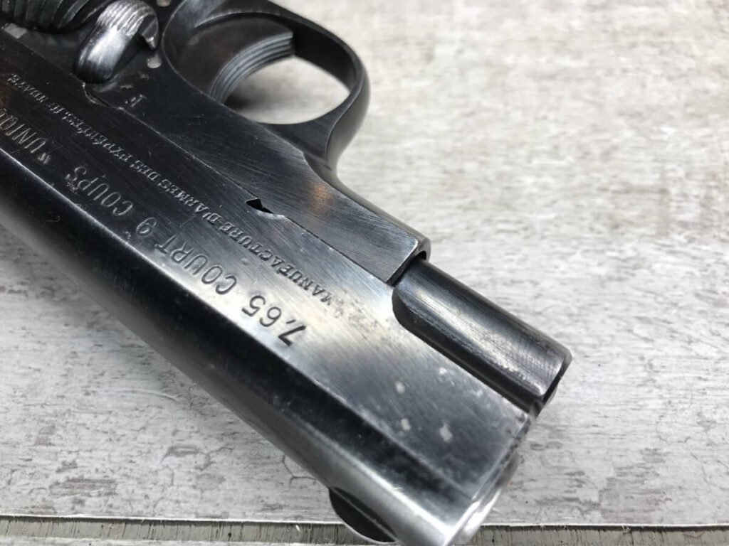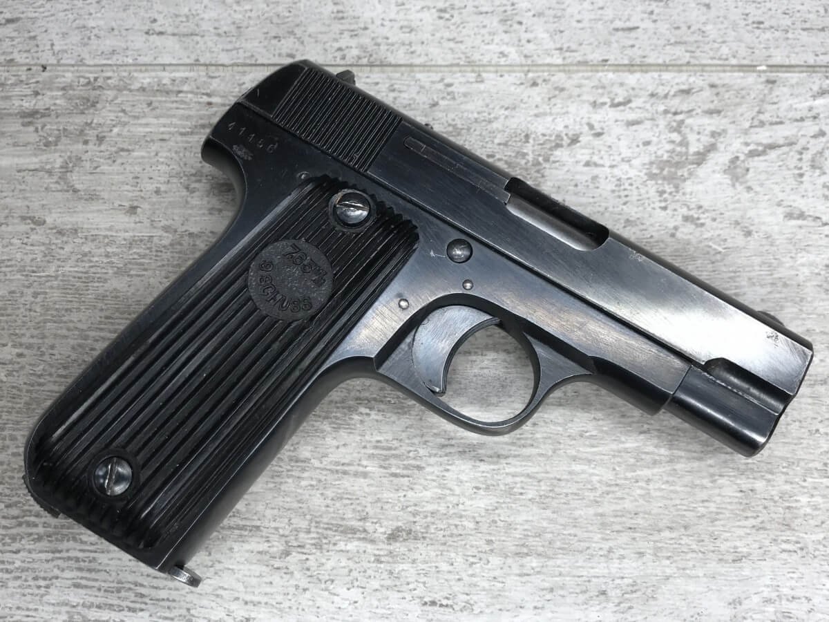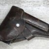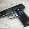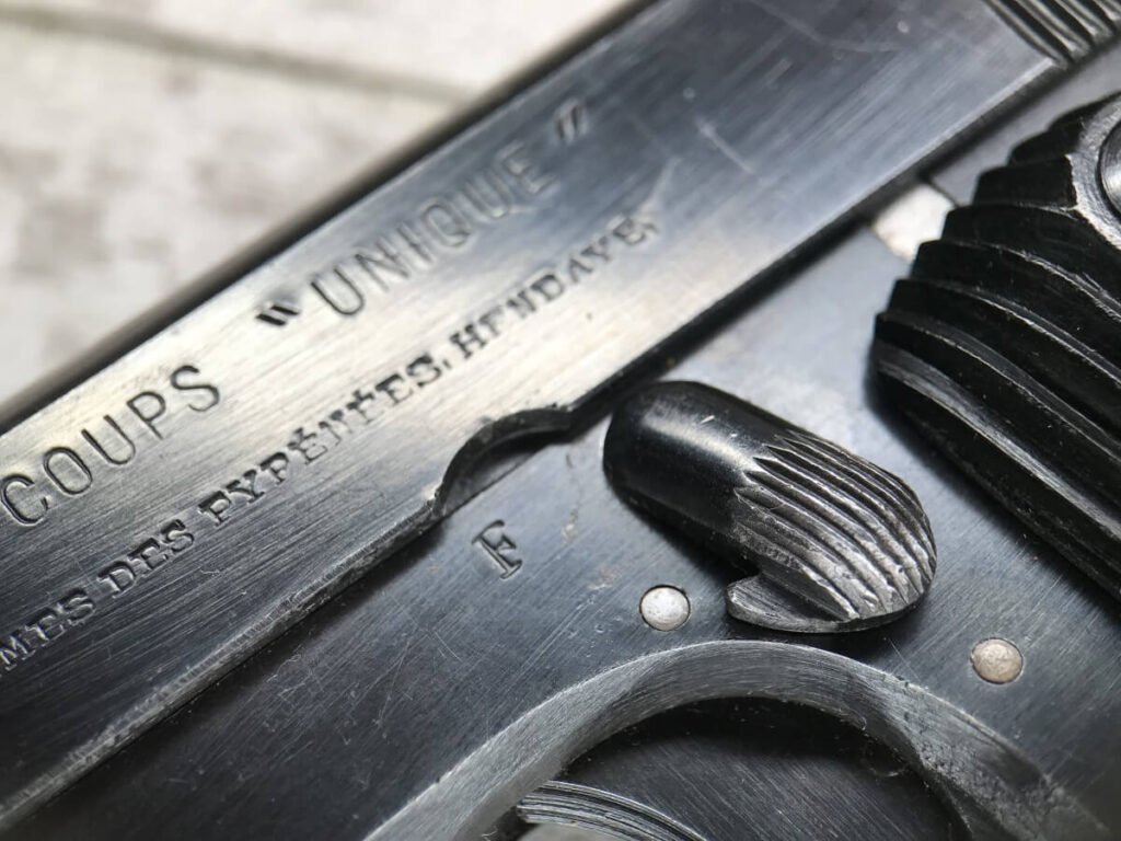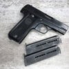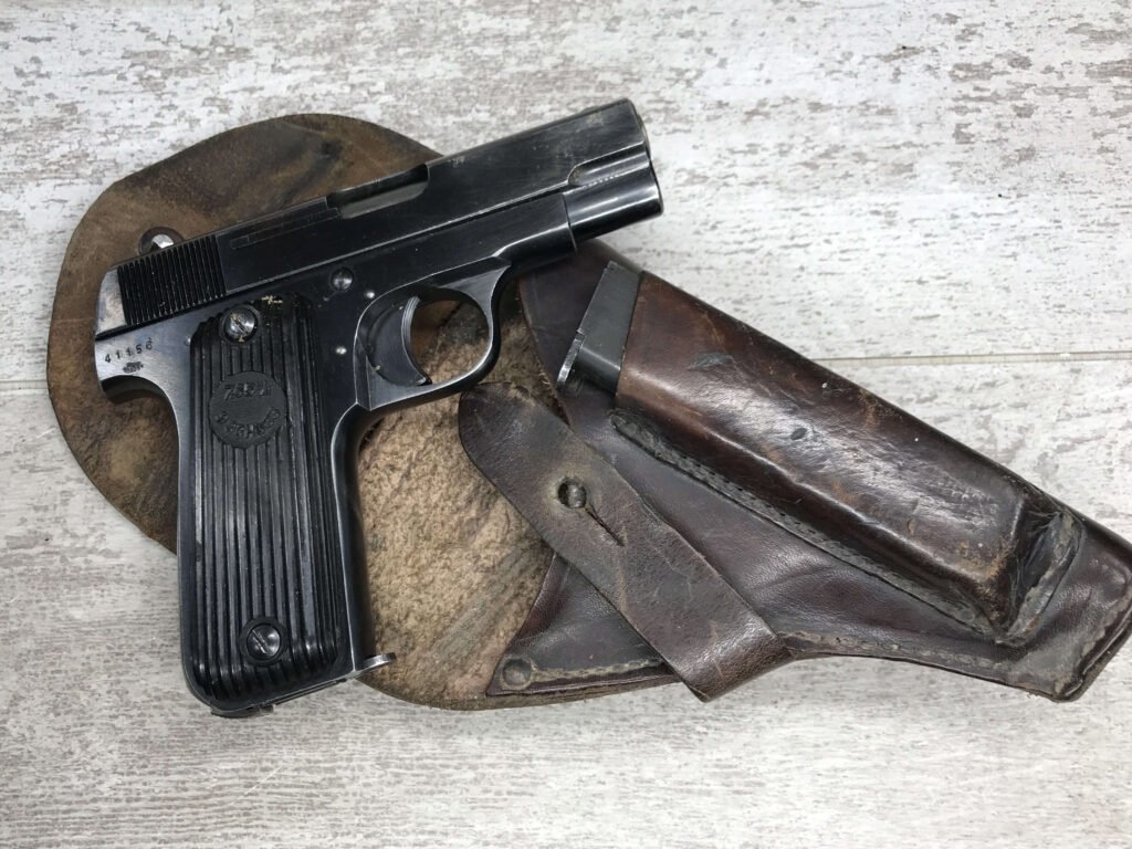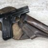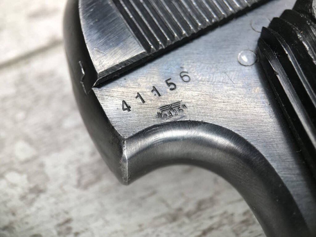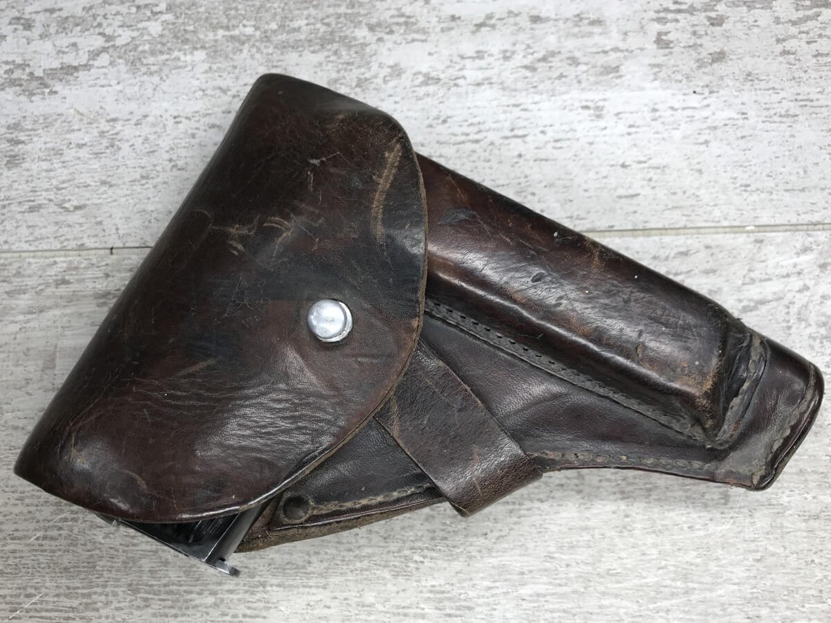 FRENCH M17 SEMI AUTO PISTOL NAZI MARKED RIG #41156, 7.65mm, 3.25″ BBL, BLUED FINISH, FIRE BLUED SMALL PARTS, MAZI EAGLE PROOF ON BBL, FRAME MARKED “EAGLE/WaA251”, LEFT SIDE OF SLIDE MARKED “7,65 COURT 9 COUPS “UNIQUE”/MANUFACTURE D’ARMES DES”, LANYARD LOOP, BOTTOM MAG RELEASE, EXC GROOVED GRIPS MARKED “7,65m/m 9 SCHUSS”, 80-90% BLUE FINISH REMAINING, BIRGHT BORE W/HINT OF FROSTING, BBL FINISHED IN THE WHITE AND MARKED “08” AND NAZI EAGLE PROOF, DARK BROWN GERMAN HOLSTER W/SINGLE BELT LOOP, TOP FLAP MARKED “EAGLE/WaAD20, FRONT MAG POUCH, BOTTOM CLOSURE STRAP, HARD TO FIND, SOME PITTING, VG CONDITION OVERALL