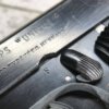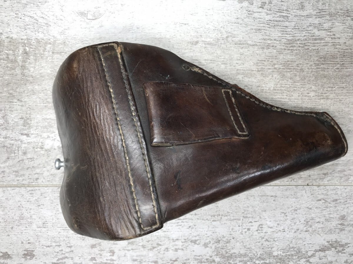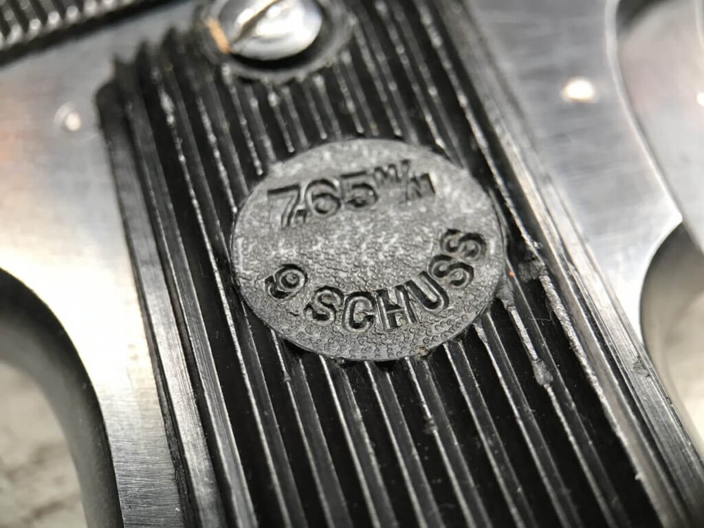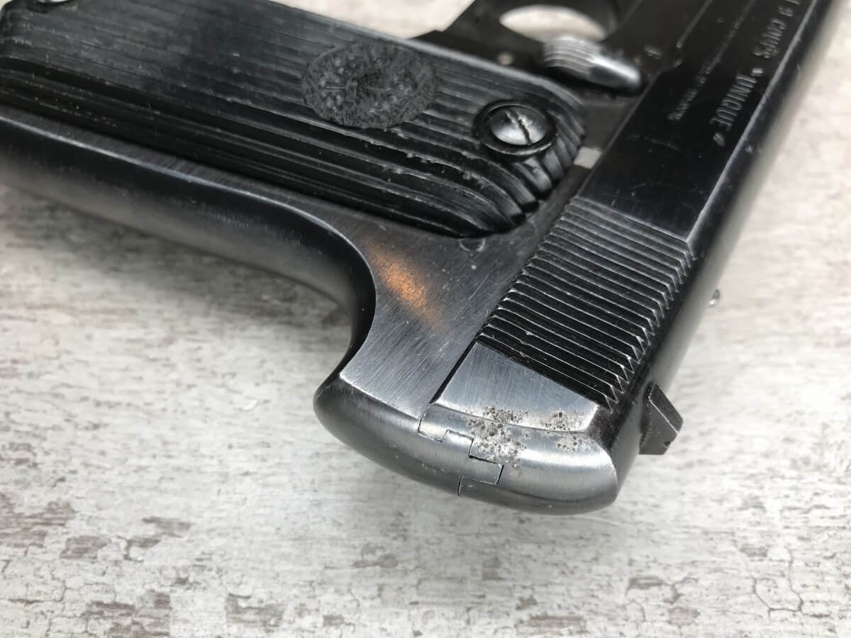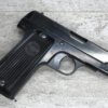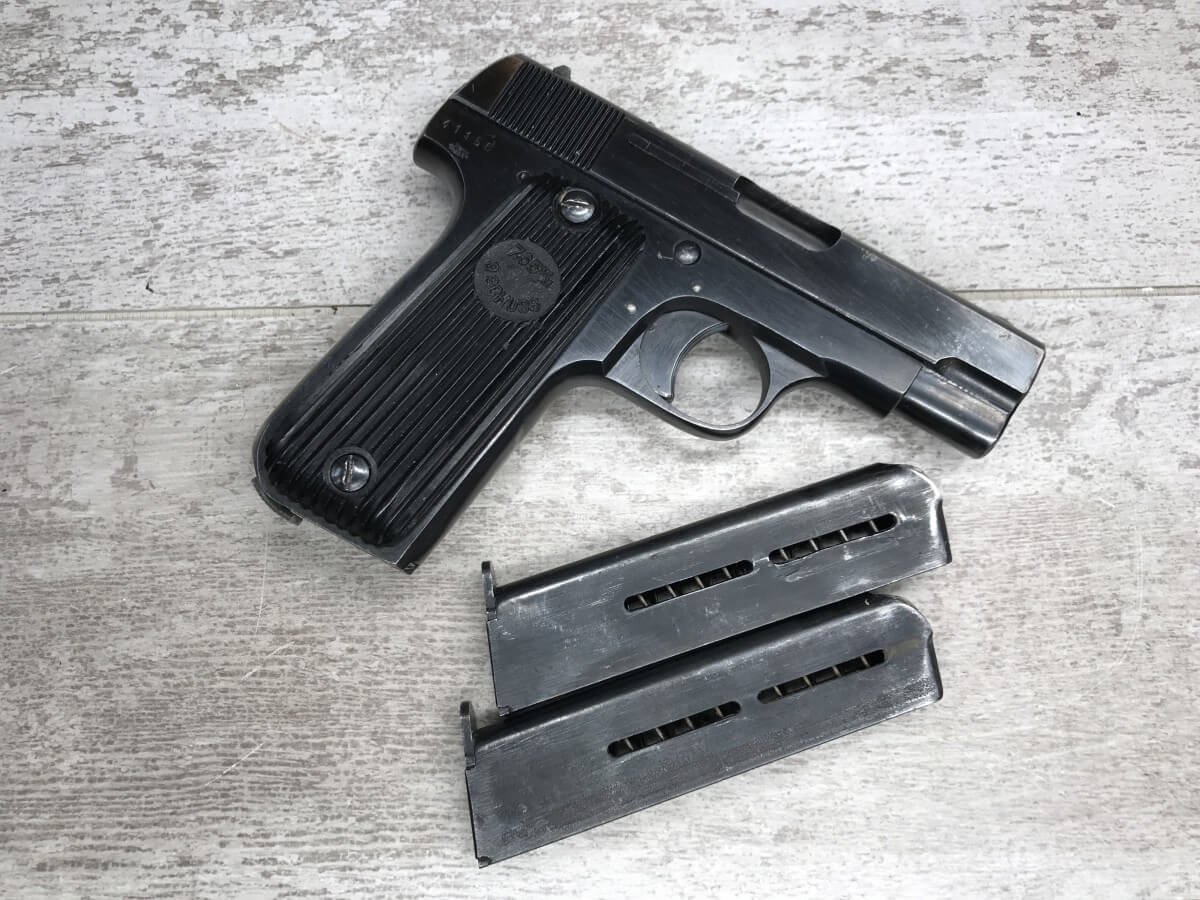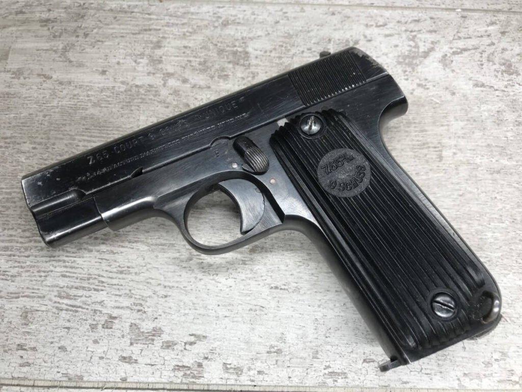 FRENCH M17 SEMI AUTO PISTOL NAZI MARKED RIG #41156, 7.65mm, 3.25″ BBL, BLUED FINISH, FIRE BLUED SMALL PARTS, MAZI EAGLE PROOF ON BBL, FRAME MARKED “EAGLE/WaA251”, LEFT SIDE OF SLIDE MARKED “7,65 COURT 9 COUPS “UNIQUE”/MANUFACTURE D’ARMES DES”, LANYARD LOOP, BOTTOM MAG RELEASE, EXC GROOVED GRIPS MARKED “7,65m/m 9 SCHUSS”, 80-90% BLUE FINISH REMAINING, BIRGHT BORE W/HINT OF FROSTING, BBL FINISHED IN THE WHITE AND MARKED “08” AND NAZI EAGLE PROOF, DARK BROWN GERMAN HOLSTER W/SINGLE BELT LOOP, TOP FLAP MARKED “EAGLE/WaAD20, FRONT MAG POUCH, BOTTOM CLOSURE STRAP, HARD TO FIND, SOME PITTING, VG CONDITION OVERALL