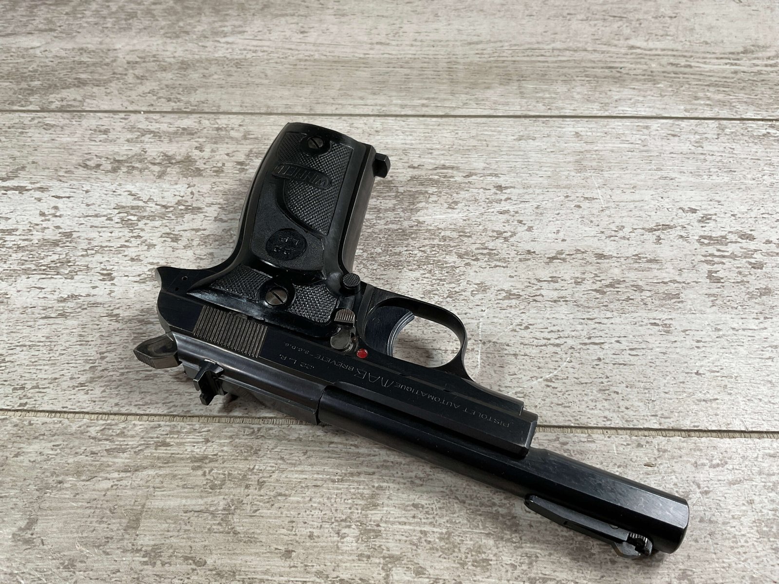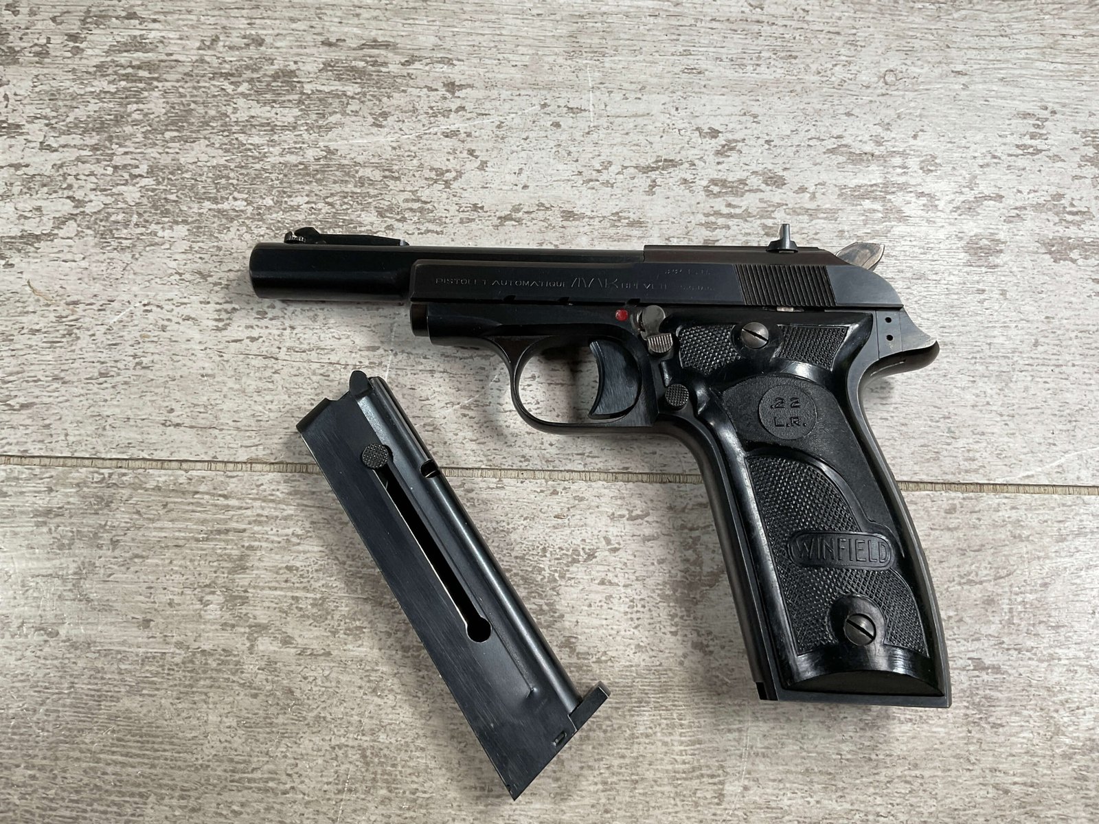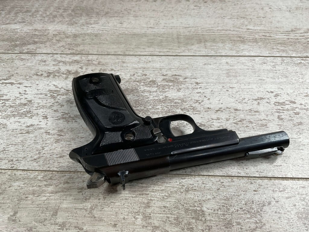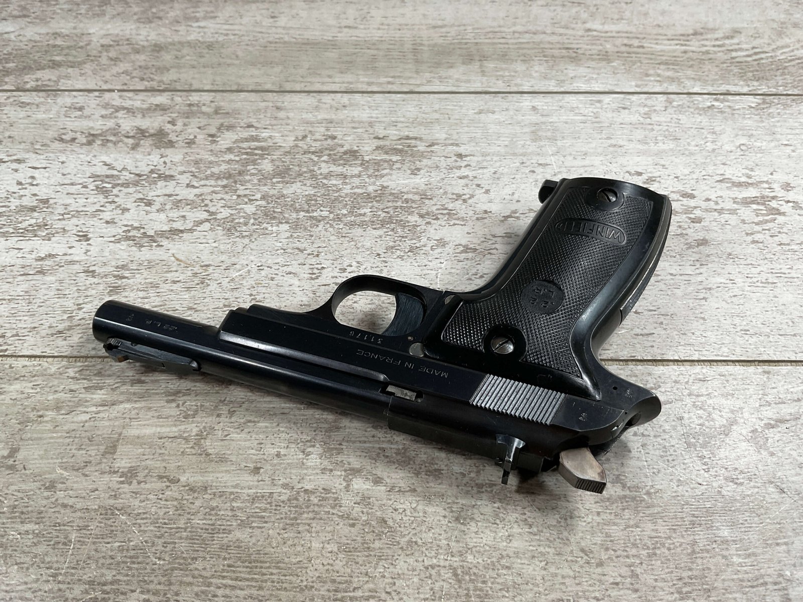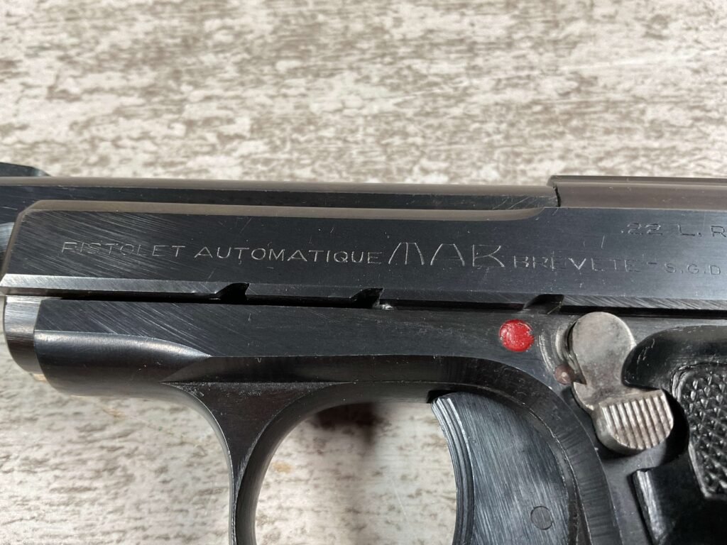 FRENCH MAB BREVETE .22LR SEMI AUTO PISTOL #31176, EXC MIRROR BORE & RIFLING, EXC BLACK CHECKERED GRIPS, EXC W/98+% BLUE, VERY LIGHT HANDLING MARKS, ONE ORIGIANL MAGAZINE, EXTERNAL HAMMER, INTERNAL STRIKER, NO IMPORT MARKS (IMPORTED TO THE US IN THE 50’S) 98+% OVERALL