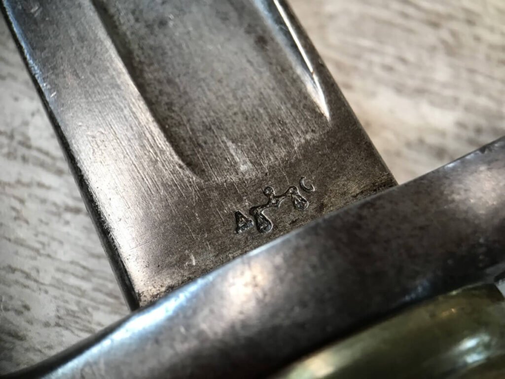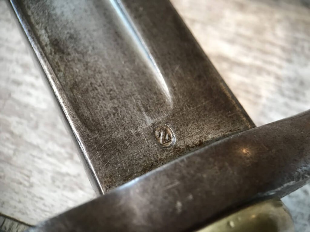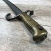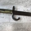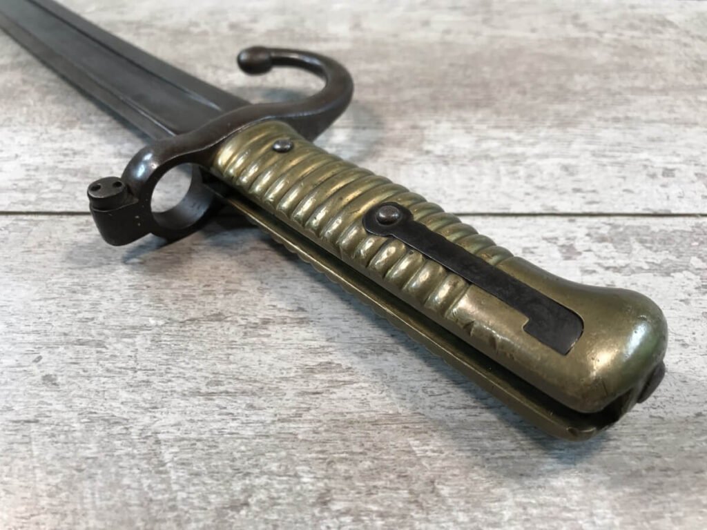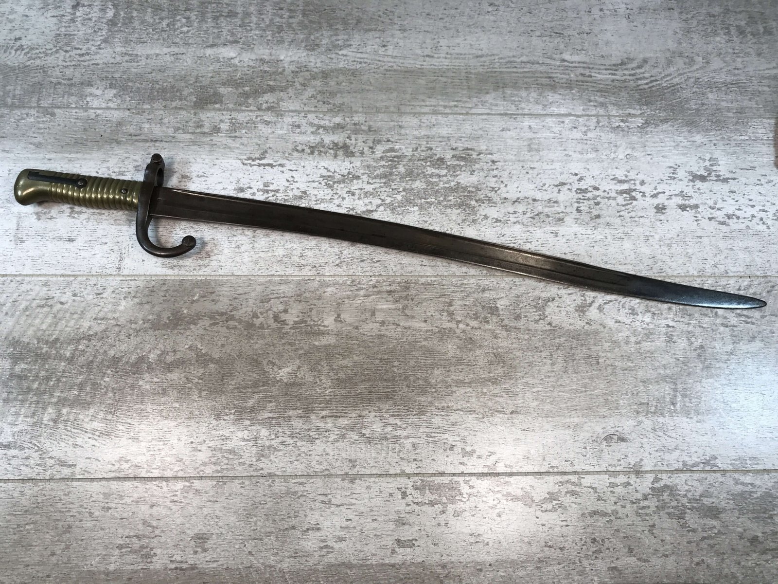SKU#826 FRENCH MODEL 1866 CHASSEPOT YATAGHAN SWORD BAYONET, NO SCABBARD, FOR THE M1866 CHASSEPOT NEEDLE-FIRE RIFLE, BRASS-HILTED, SPRING STEEL LATCH, DOUBLE CURVE SHAPE, 27 3/16″ OVERALL, 22 3/8″ BLADE, VG OVERALL CONDITION