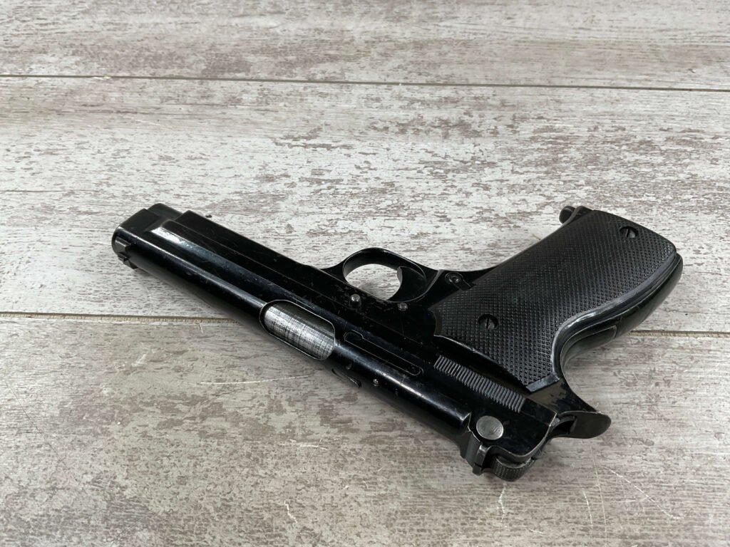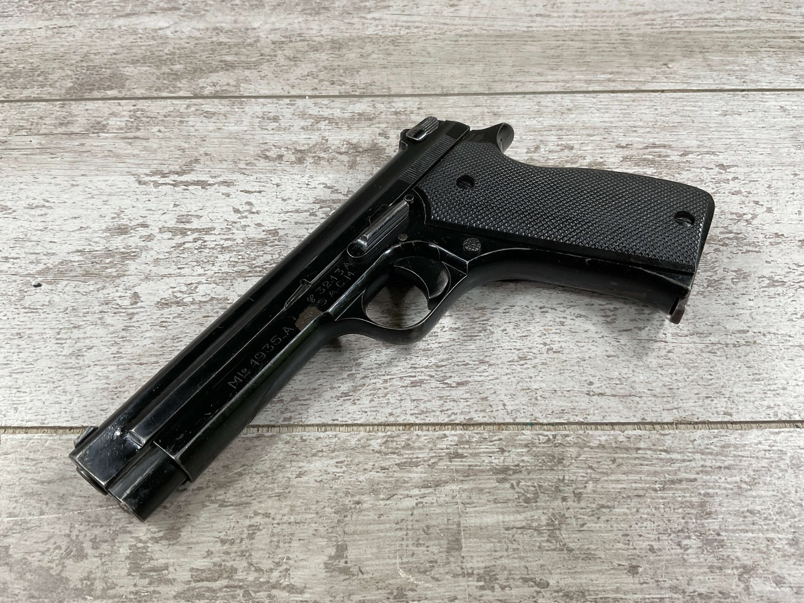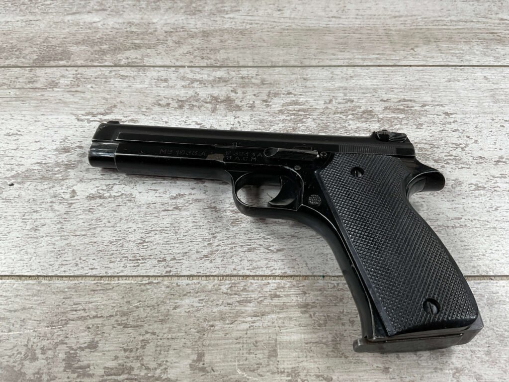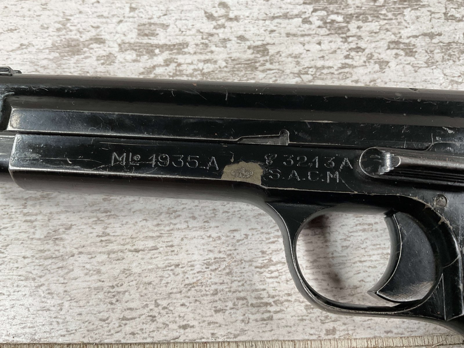 THE PISTOLET AUTOMATIQUE MODÈLE 1935A ALSO KNOWN AS THE FRENCH MODEL 1935A IS A SEMI-AUTOMATIC PISTOL DESIGNED BY CHARLES PETTER, CHAMBERED FOR THE 7.65MM LONGUE CARTRIDGE. IT WAS DEVELOPED TO COMPETE IN THE 1935–1937 FRENCH MILITARY TRIALS CONDUCTED BY THE COMMISSION D’EXPERIENCES TECHNIQUES DE VERSAILLES TO SELECT A NEW SIDEARM. THE PISTOL WON THE 1935–1937 COMPETITION TO PRODUCE THE NEW FRENCH MILITARY SIDEARM; A DIFFERENT PISTOL IN THE COMPETITION WAS THE SIMILARLY NAMED PISTOLET AUTOMATIQUE MODÈLE 1935S. INITIAL PRODUCTION OF THE 1935A BEGAN IN 1937, AND THE PISTOL BEGAN DELIVERY TO THE FRENCH ARMY IN LATE 1939, WITH A TOTAL OF ABOUT 10,700 PISTOLS BUILT BEFORE GERMAN FORCES OCCUPIED THE SACM FACTORY IN THE SUMMER OF 1940.
