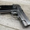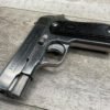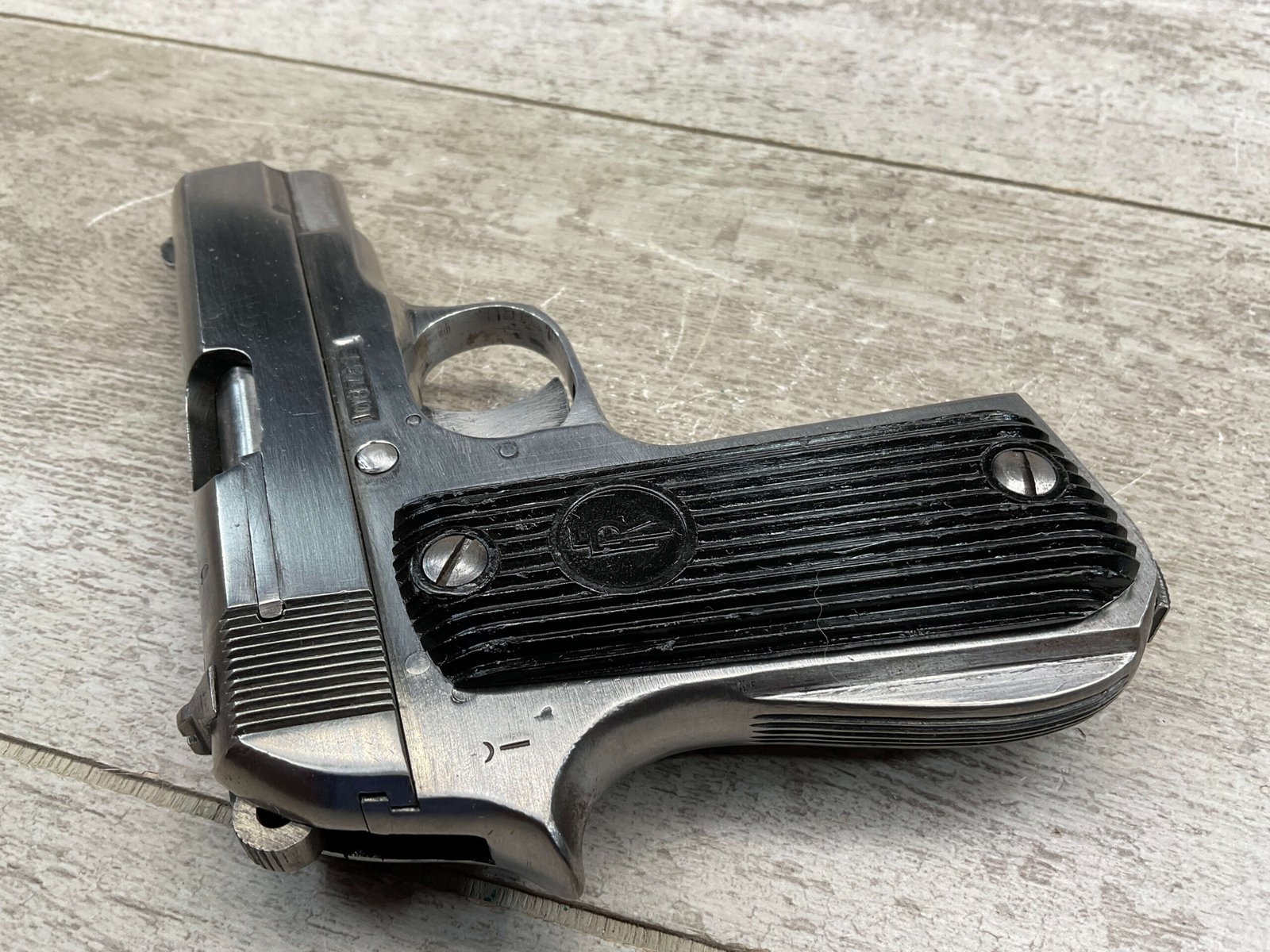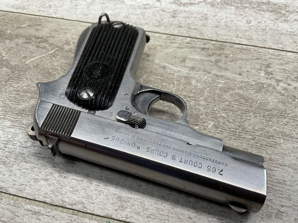 FRENCH UNIQUE Rr51 7.65mm (.32ACP) SEMI AUTO PISTOL #108757, MILLED SERIAL NUMBER, 3 3/16″ BARREL, SEEMS TO HAVE BEEN POLISHED (ALMOST ALL BLUE REMOVED), EXC VERTICAL SERRATION BLACK BAKELITE GRIPS W/ “FR” (REPUBLIC OF FRANCE) IN A CIRCLE AT THE TOP, “CRESENT MOON ON POLE” (PALM TREE), ON RIGHT SIDE FRAME ABOVE TANG, 9RD MAGAZINE, EXC BRIGHT BORE W/STRONG RIFLING