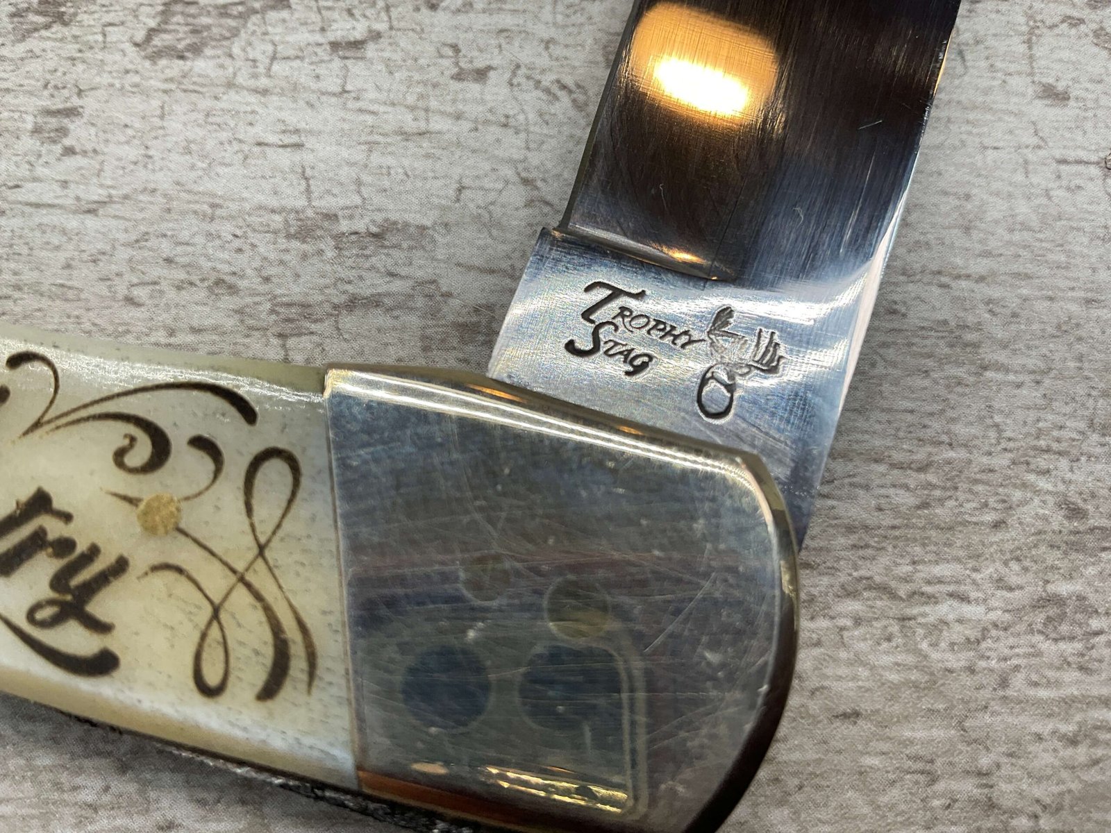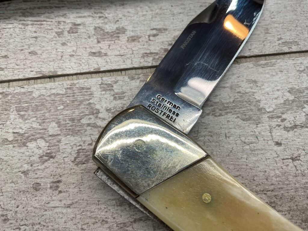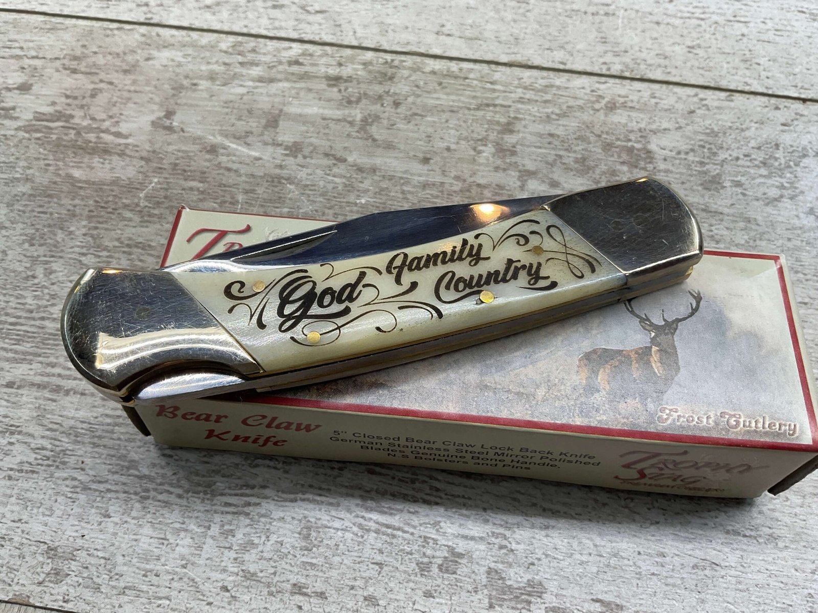 FROST CUTLERY BEAR CLAW POCKET KNIFE, 5″ LENGTH WHEN CLOSED, FEATURES BRASS LINERS, LOCKBACK, NICKEL SILVER BOLSTERS W/ A STAINLESS STEEL BLADE, GENUINE BONDE HANDLE STAMPED W/ “GOD, FAMILY, COUNTRY”, NEW IN THE BOX