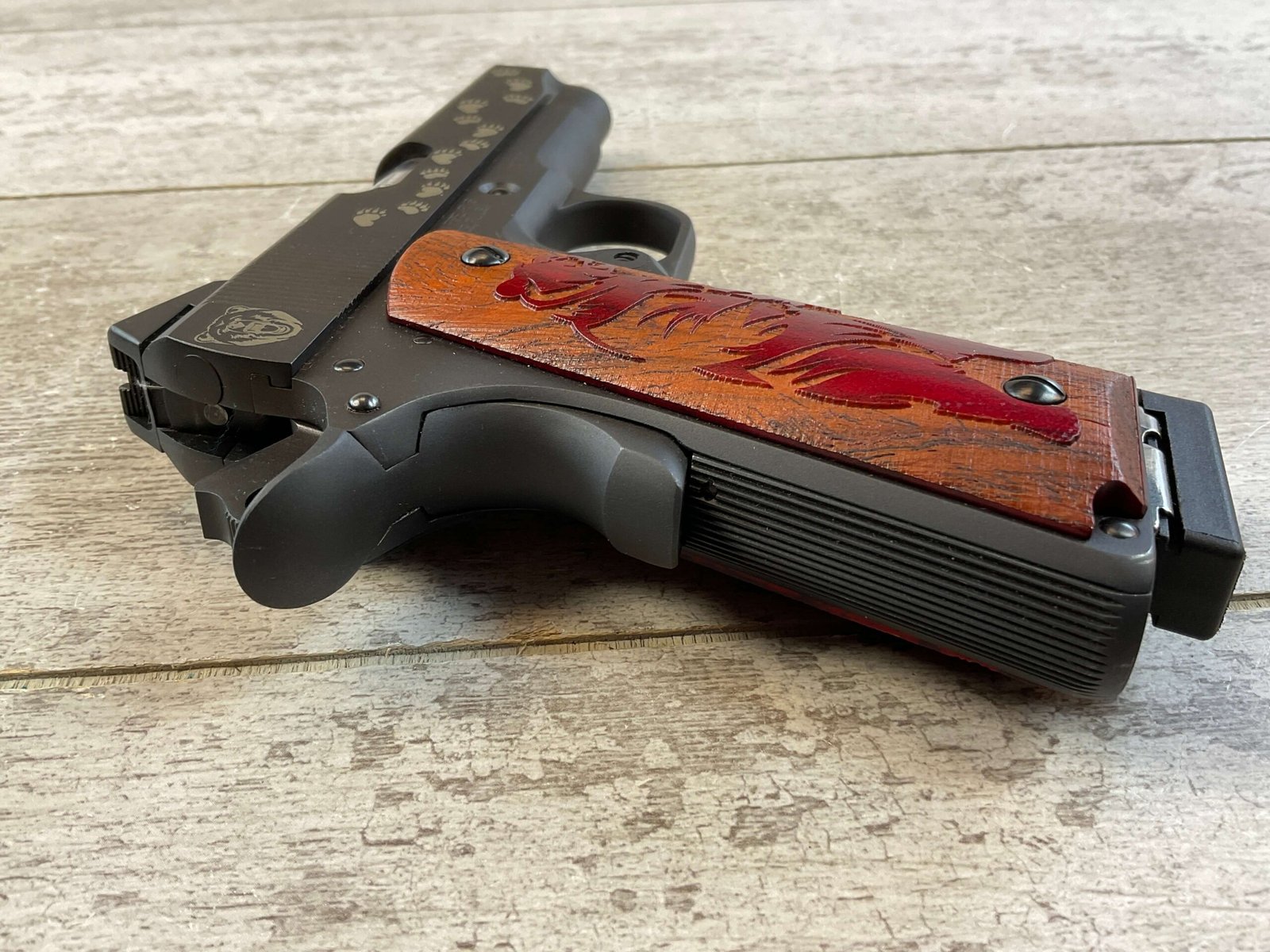 FUSION FIREARMS COMBAT (BEAR EDITION) 10MM SEMI AUTO PISTOL #FF05847, EXC MATTE FINISH, MIRROR BORE & RIFLING, 4.5″ BARREL, BEAR ENGRAVED COCOBOLO GRIPS, FIXED SIGHTS, 2 8 ROUND MAGAZINES, SOFT CASE, BARREL BUSHING TOOL, LIKE NEW, CONDITION AS SHOWN IN PICTURES