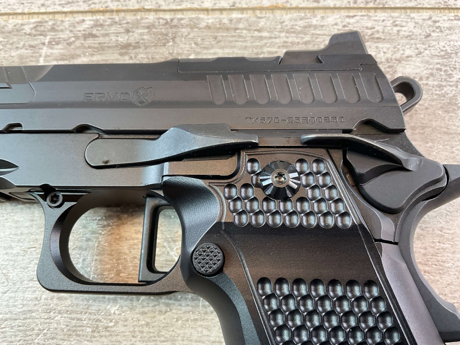 • Grip: Aluminum with chainlink pattern checkered front strap, and removable magwell