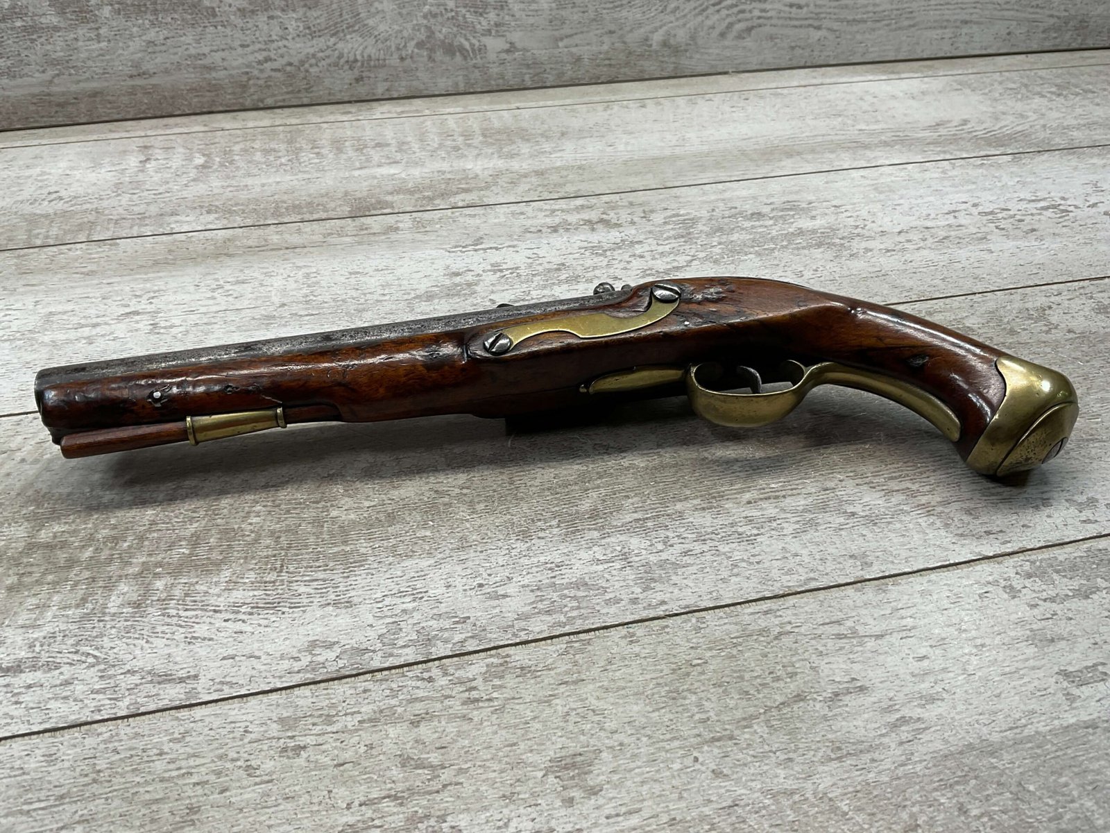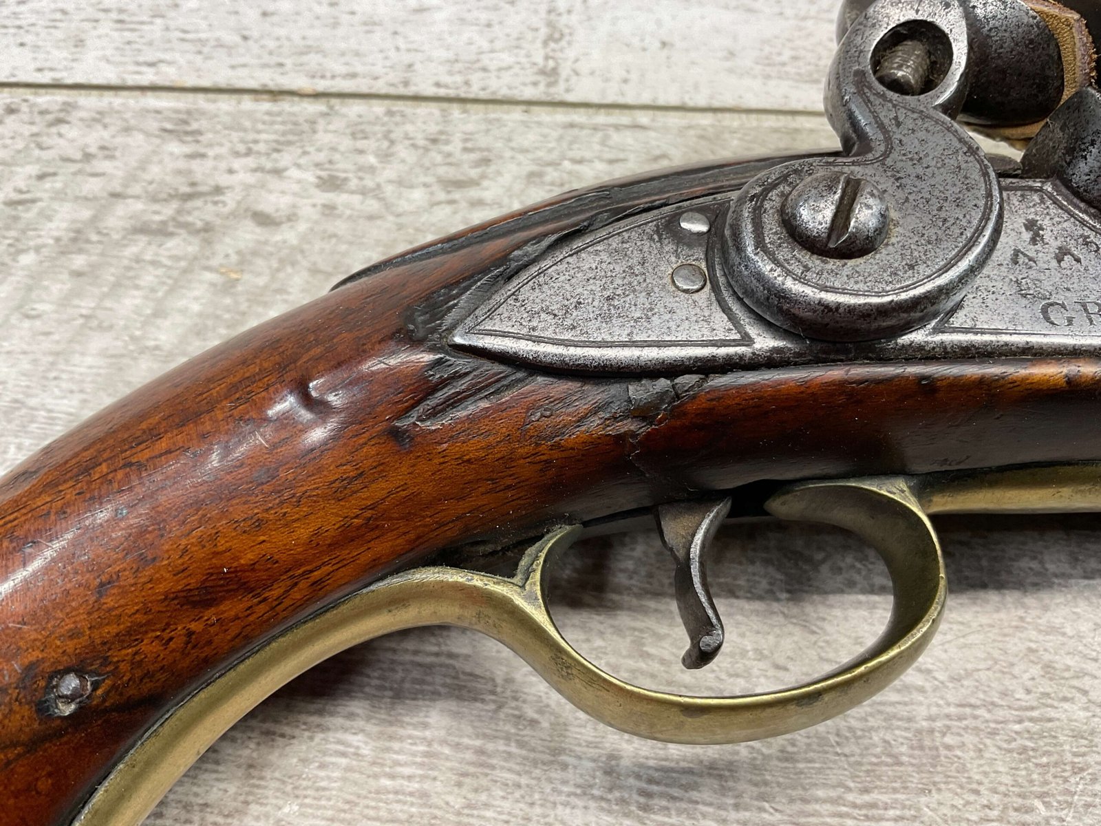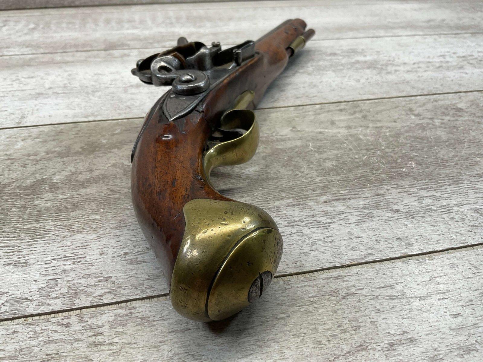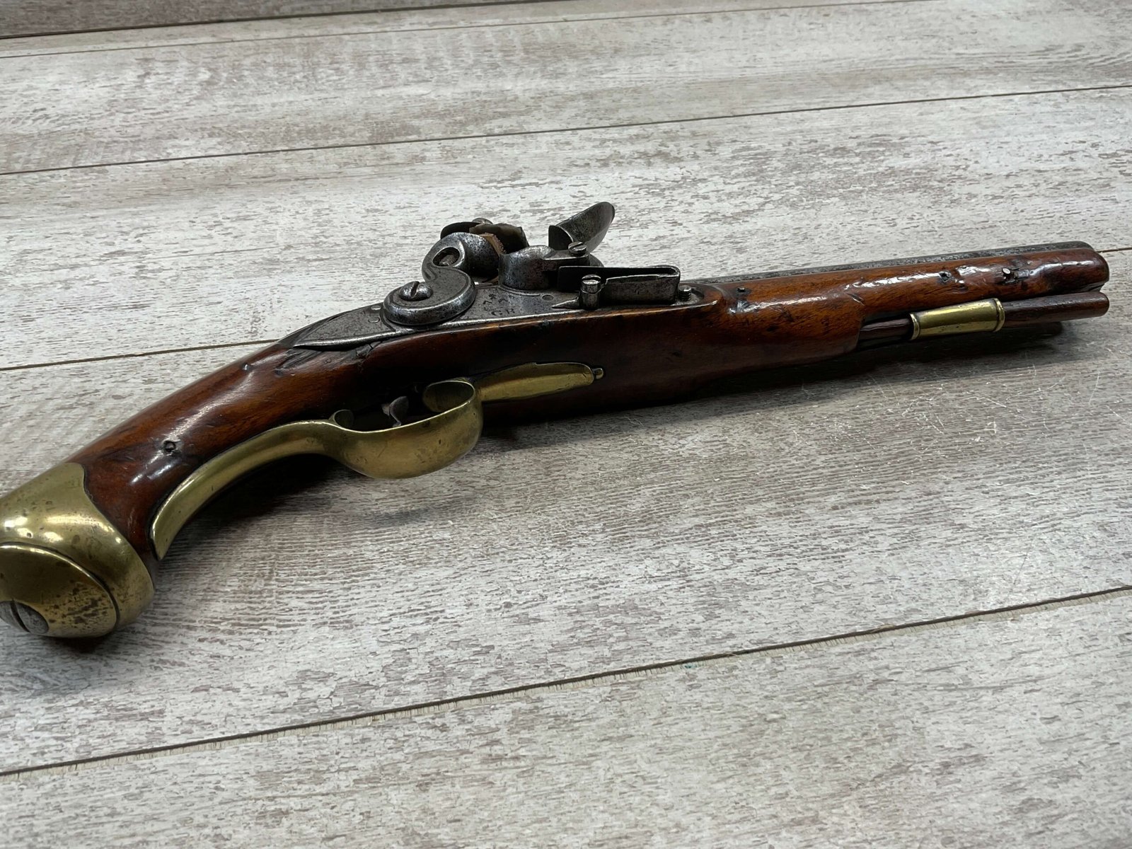 G.R. ENGLISH FLINTLOCK DRAGOON .69 CAL FLINTLOCK PISTOL, ANTIQUE #NSN, 8″ BBL, CRACKED STOCK, CHIPS AROUND LOCK, BRASS FURNITURE, FLINT LOCK, CONDITION AS SEEN IN PHOTOS