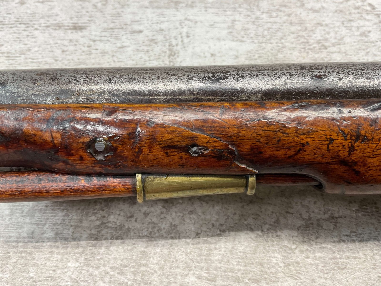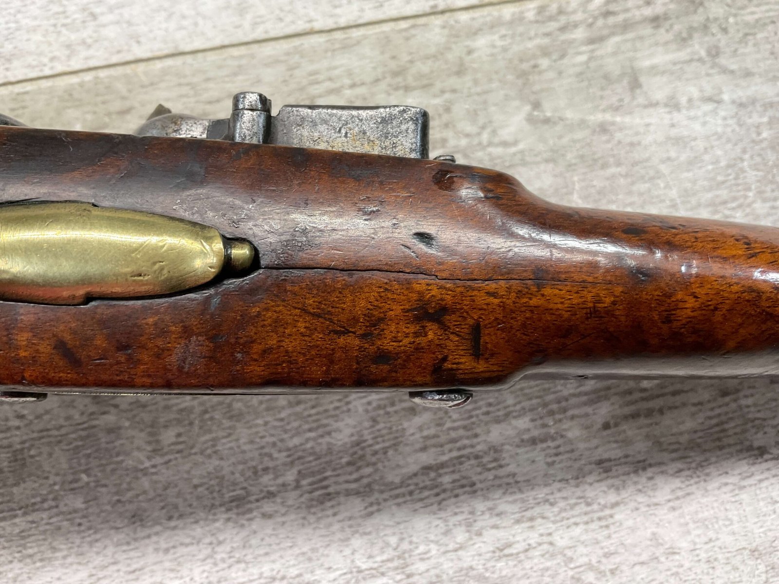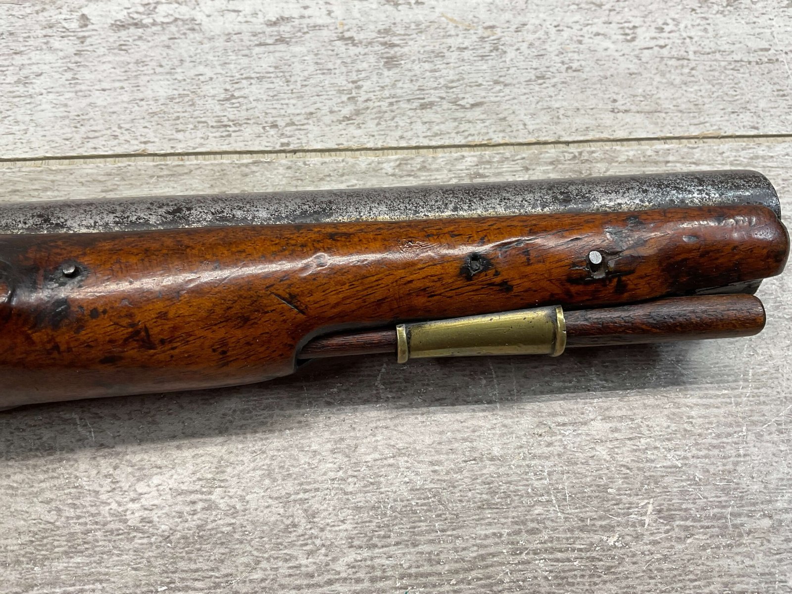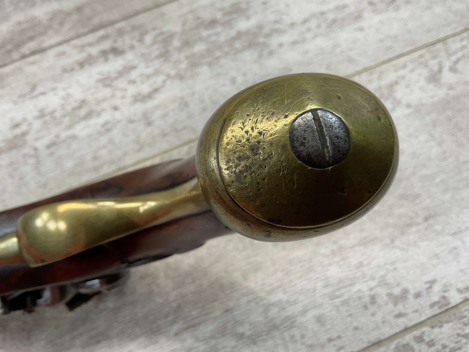 G.R. ENGLISH FLINTLOCK DRAGOON .69 CAL FLINTLOCK PISTOL, ANTIQUE #NSN, 8″ BBL, CRACKED STOCK, CHIPS AROUND LOCK, BRASS FURNITURE, FLINT LOCK, CONDITION AS SEEN IN PHOTOS