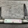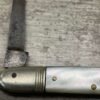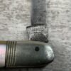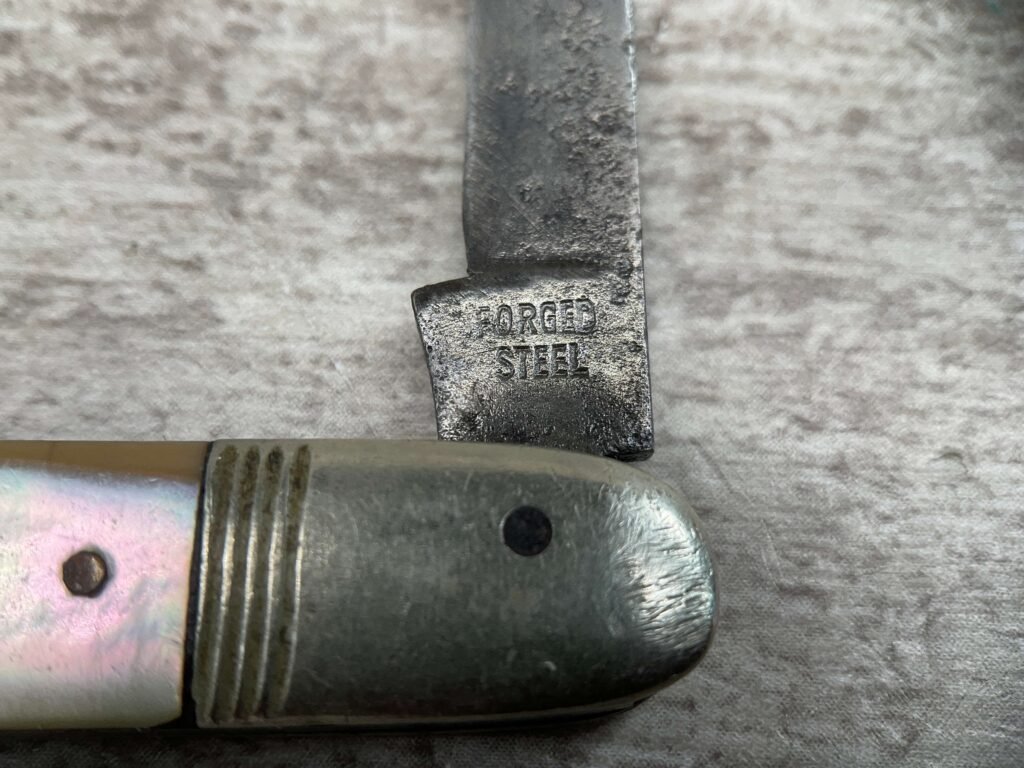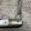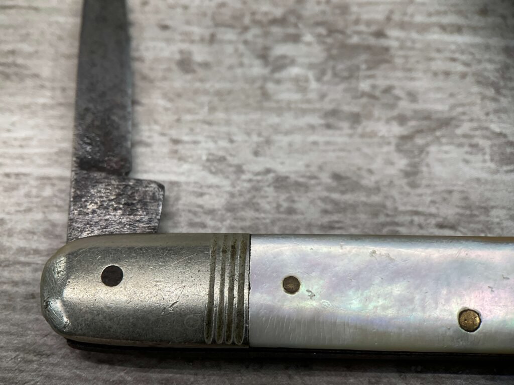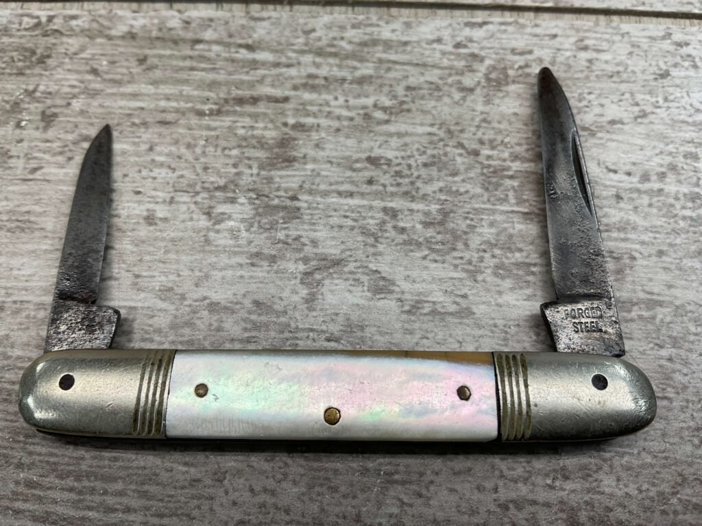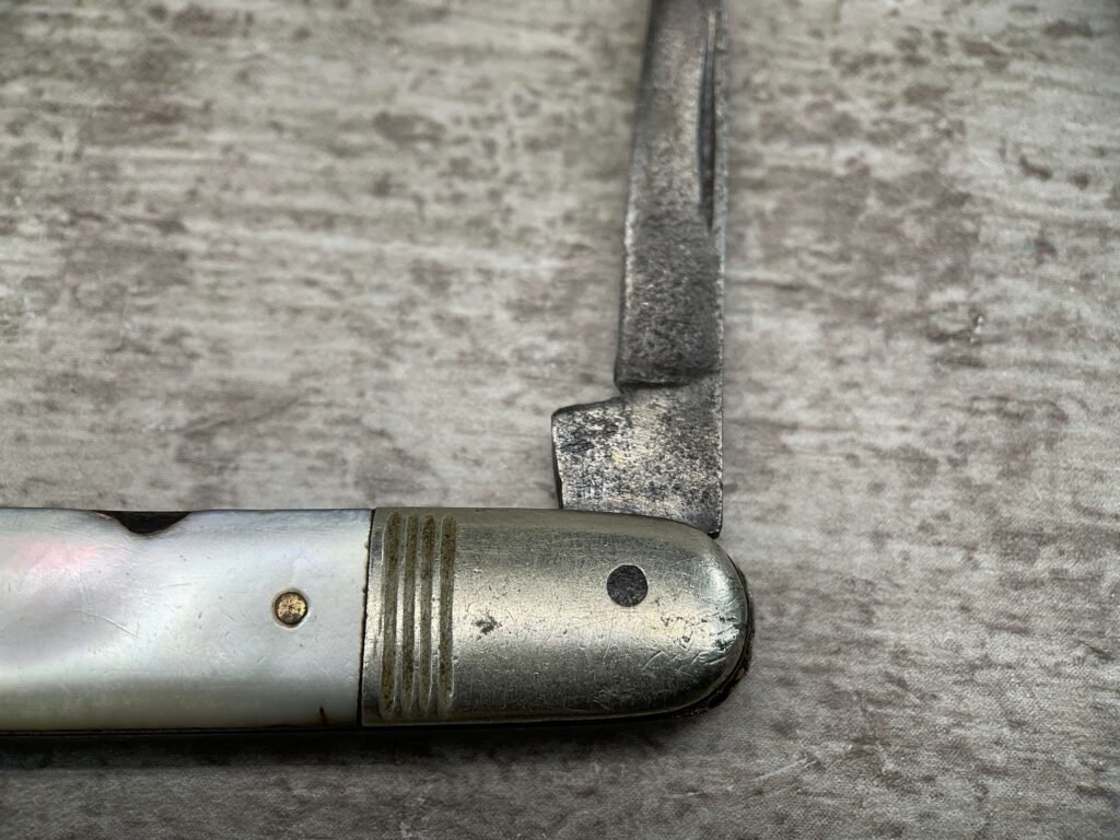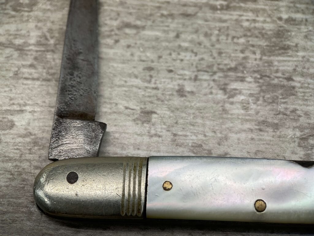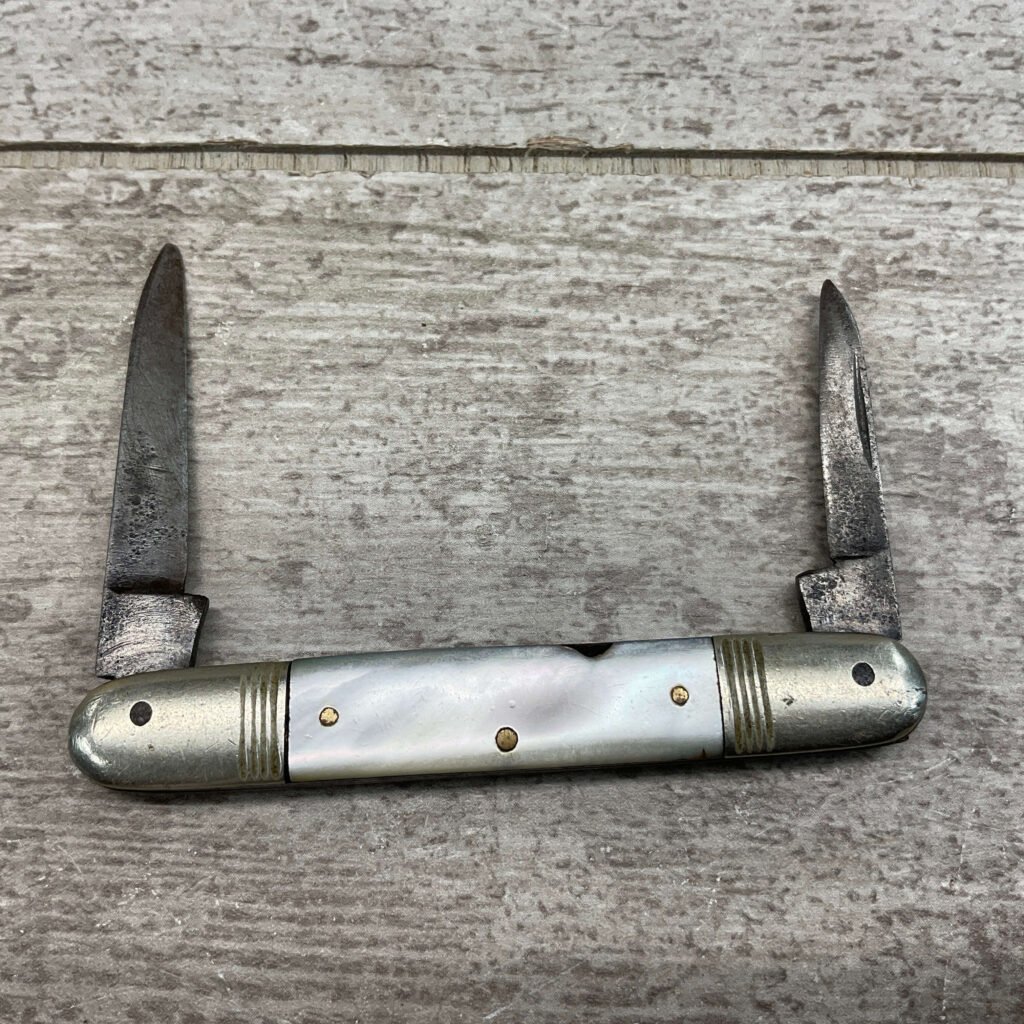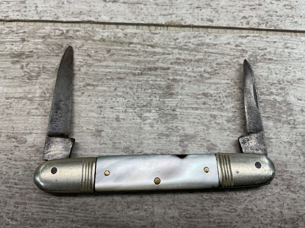 VINTAGE POCKET KNIFE, CLOSED LENGTH 3″ DOUBLE BLADE, BOTH BLADES HAVE TIGHT SNAPIN, WEAR AND SCRATCHES FROM USE.  DECORATIVE ROUND EDGE WITH BANDING NICKEL BOSTERS WITH PEARL HANDEL.