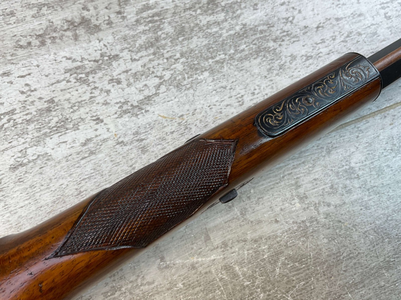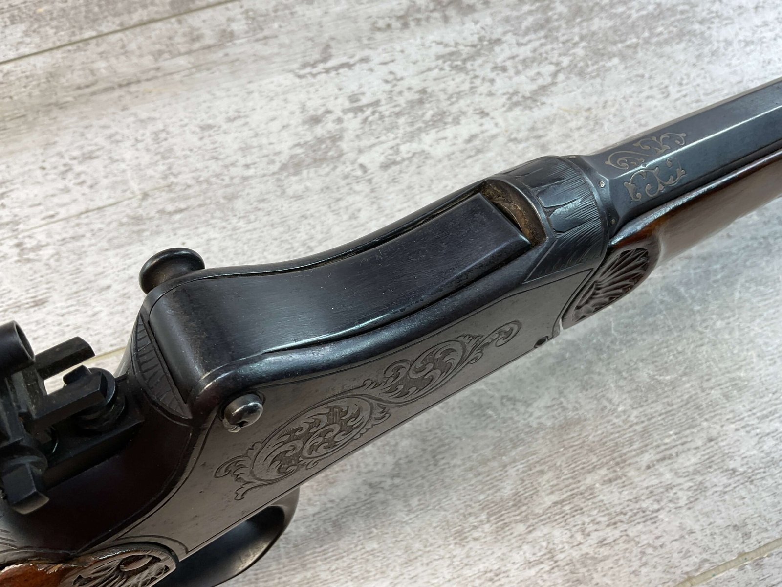 GERMAN 4MM MARTINI TYPE BEERHALL PARLOR RIFLE, JAMES EARL JONES “FAVORITES” COLLECTION #3117, 27″ OCTAGON BARREL, CUSTOM STOCK W/CHECKERING & CHEEK PIECE W/ HAND ENGRAVED DEER SCENE, SCROLL ENGRAVING ON LOCK PLATES, WOOD & BRASS PUSH/CLEANING ROD, 45 1/2″ OVERALL LENGTH, CONDITION AS SHOWN IN PICTURES, FROM THE JAMES EARL JONES “FAVORITES” COLLECTION W/ CERTIFICATE OF AUTHENTICITY.