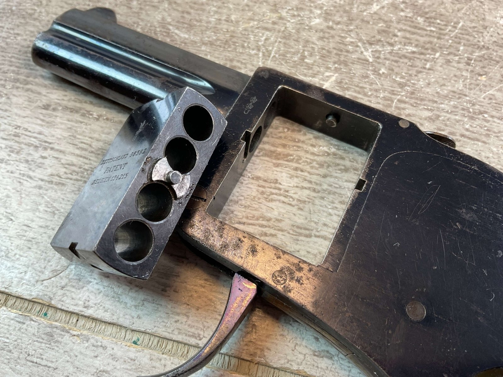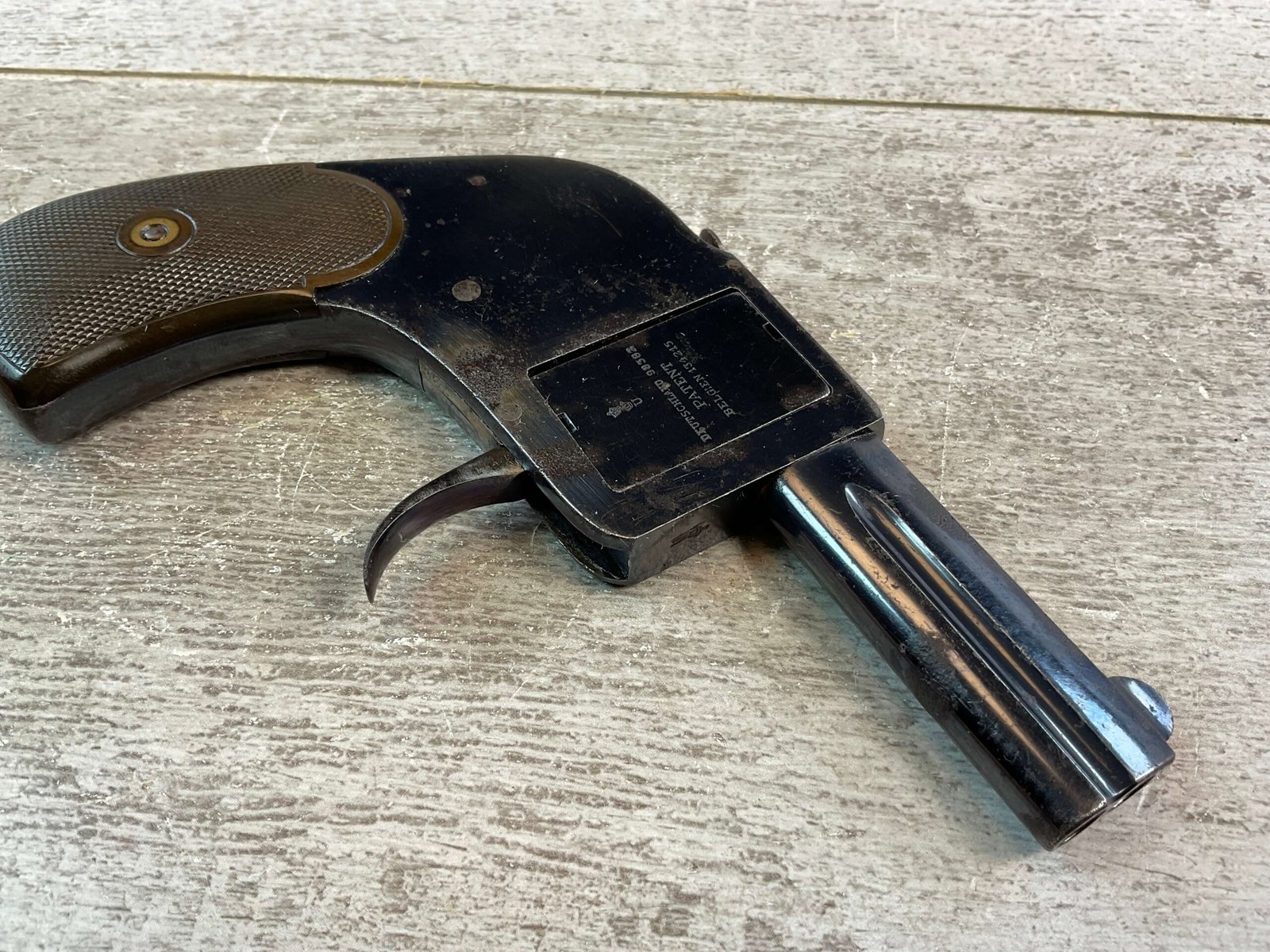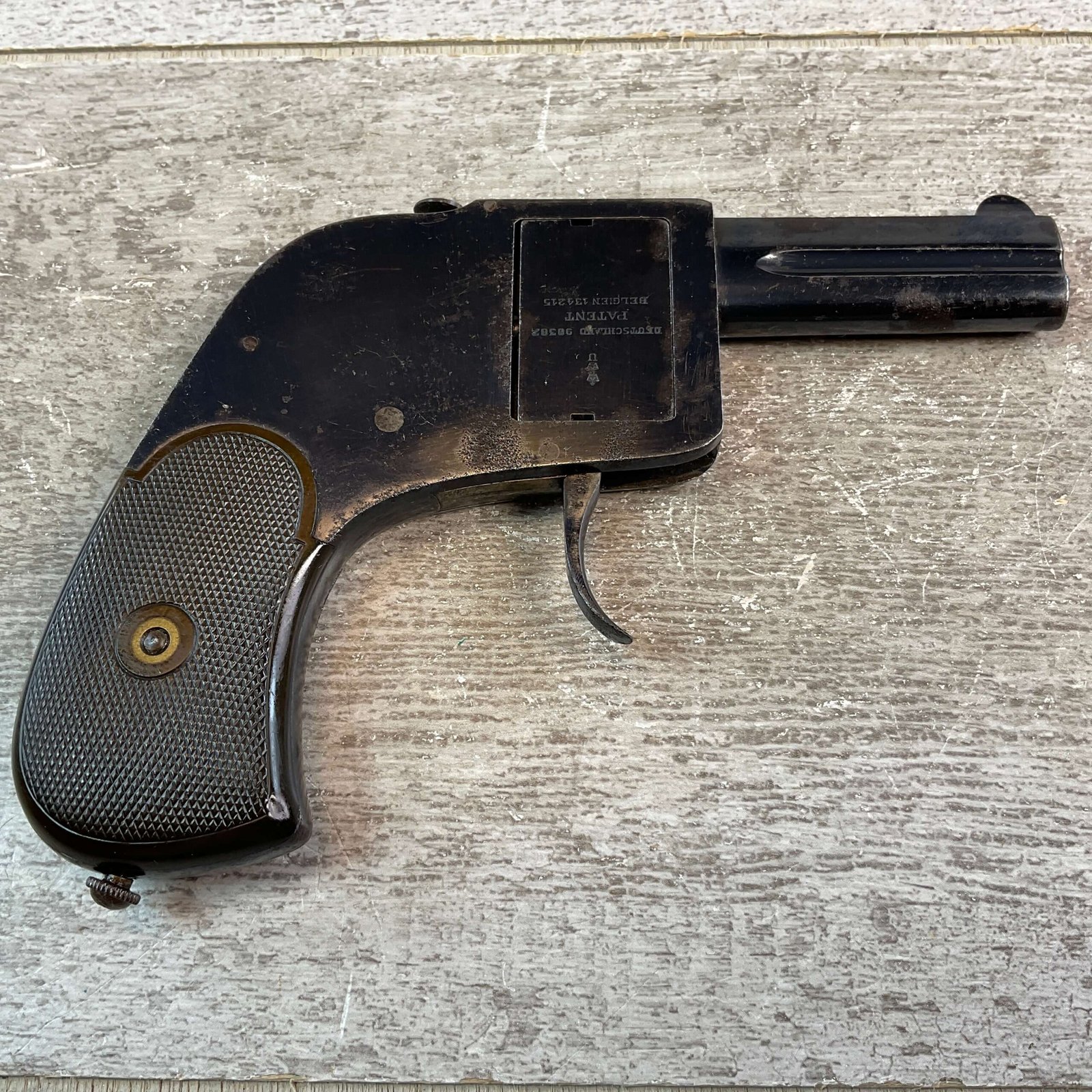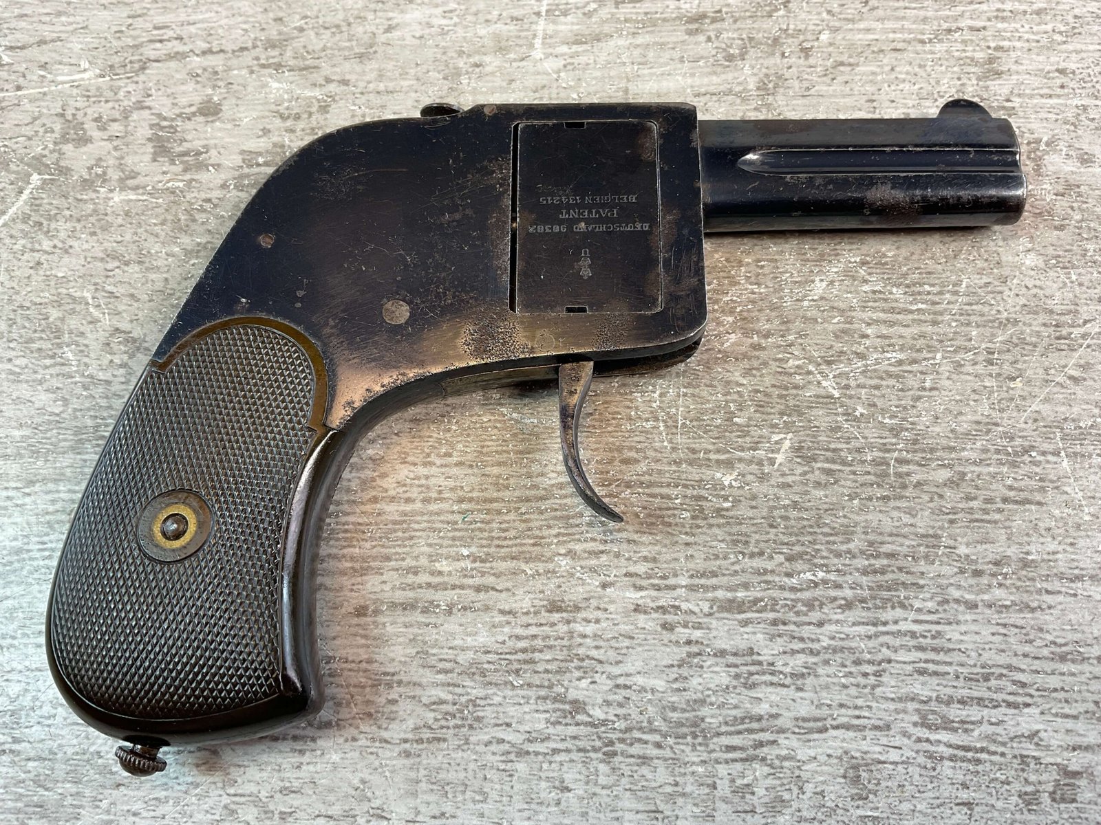 GERMAN BAR PISTOL .25ACP 4 SHOT ROTATING BREECH BLOCK W/FOLDING TRIGGER #NSN, 2.5″ BARRELS, .25ACP, EXC BORES & RIFLING, VG BLUE FINISH W/COUPLE OF AREAS OF PITTING/HIGH EDGE WEAR, EXC CHECKERED PLASTIC GRIPS, BUTTON RELEASE ON TOP OF FRAME-ALLOWS BAR BLOCK TO ROTATE, OVER UNDER BARRELS, 4 SHOT, 6″ OVERALL LENGTH, FOLDING TRIGGER, EXC GRIPS, MANUAL EJECTOR SCREWED INTO BOTTOM OF BUTT, VERY SCARCE PISTOL, CONDITION AS SHOWN IN PICTURES, FROM THE JAMES EARL JONES “FAVORITES” COLLECTION W/ CERTIFICATE OF AUTHENTICITY.