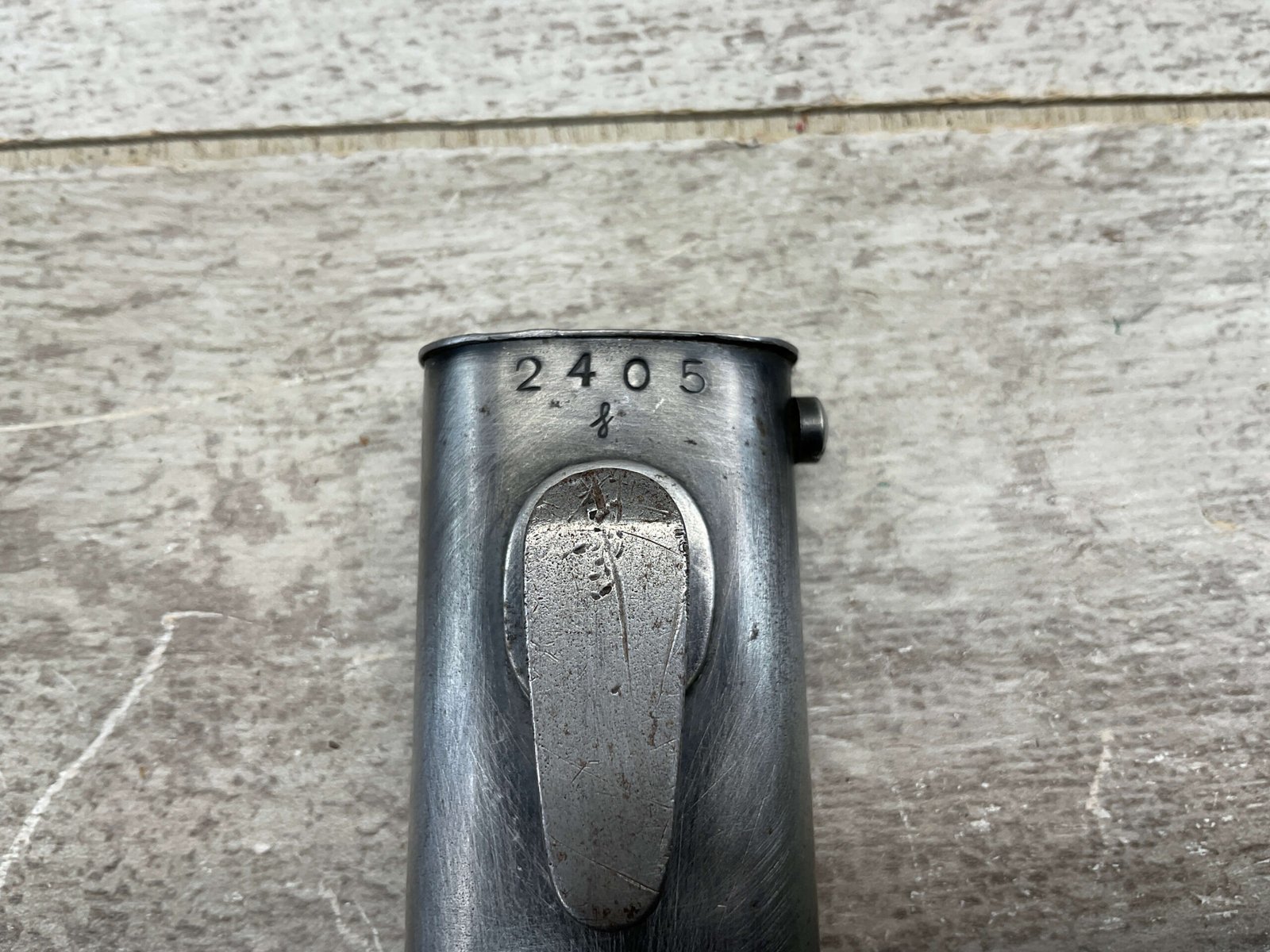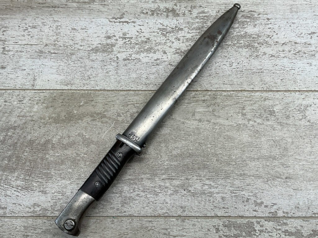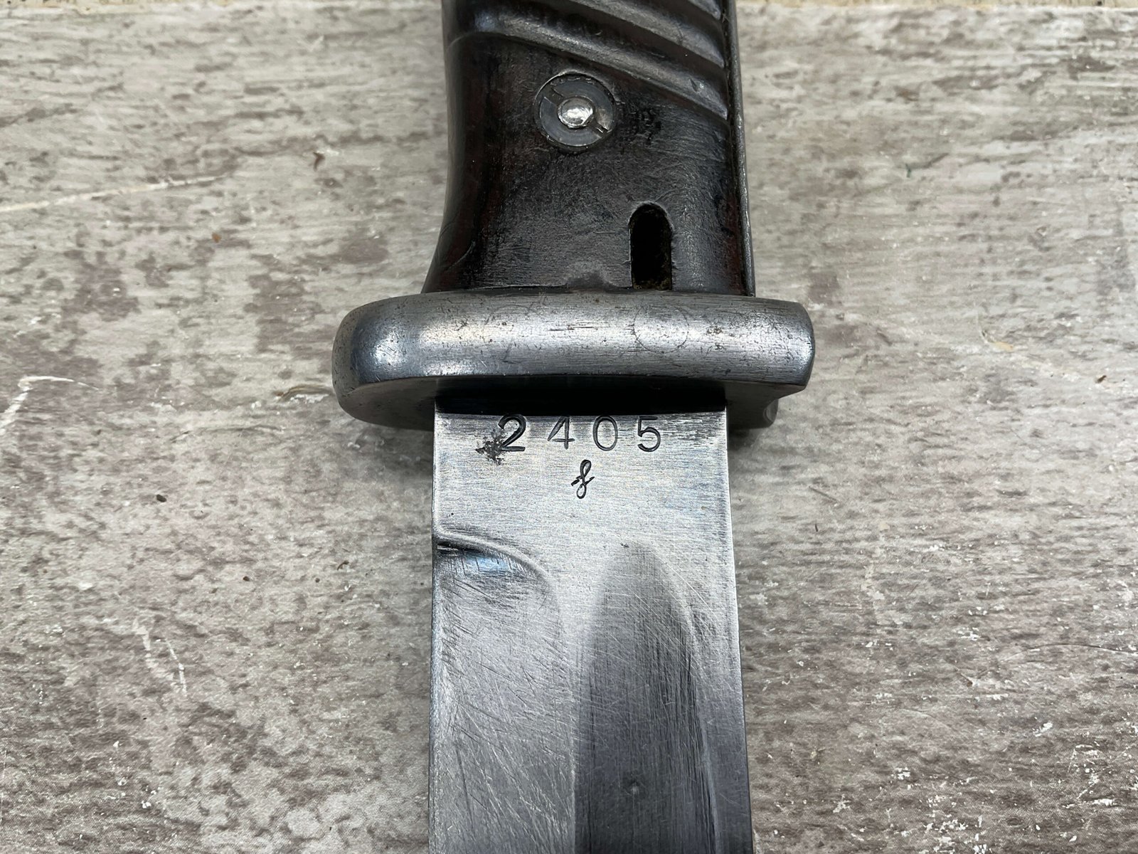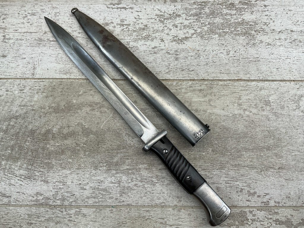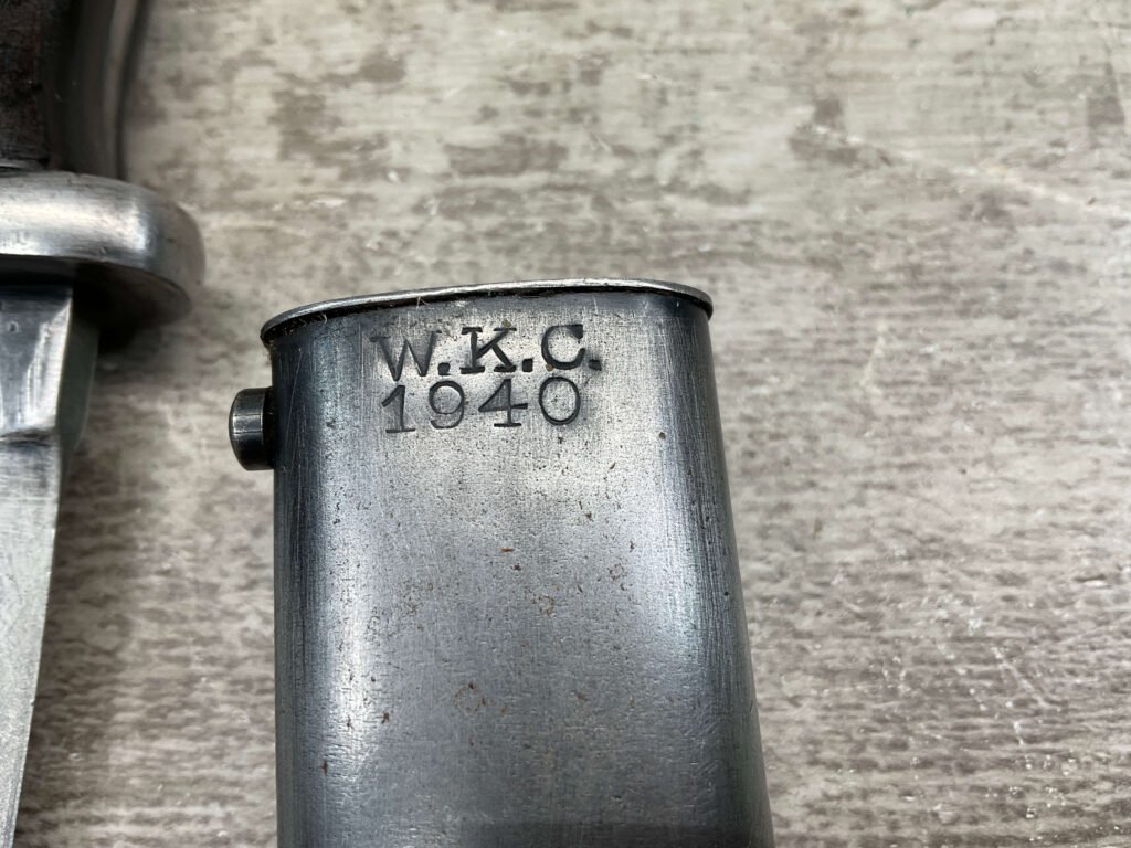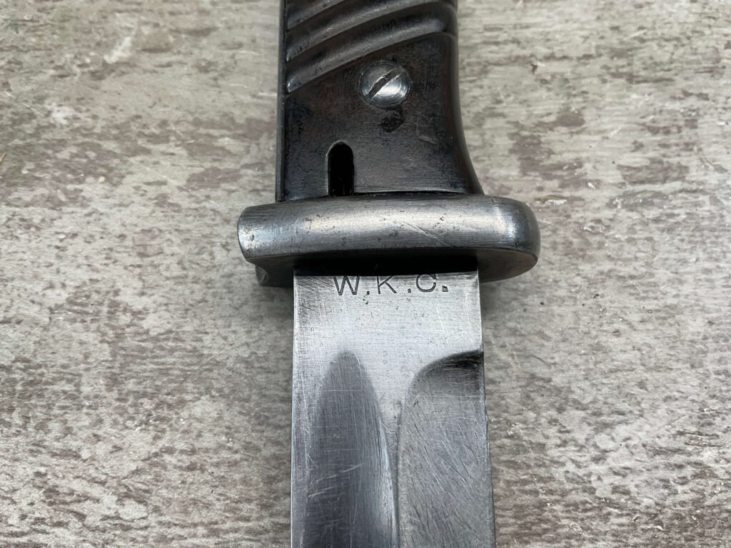 GERMAN K98 BAYONET & MATCHING SCABBARD, END OF HANDLE MARKED “WaA885”, START OF BLADE NEAR HANDLE MARKED “2405” WITH ANOTHER SYMBOL, OTHER SIDE MARKED “W.K.C.”, BOTTOM OF SCABBARD MARKED “2405” WITH SYMBOL, OTHER SIDE MARKED “W.K.C. / 1940”, MARKED “WaA88” ON TIP OF SCABBARD, 9 3/4 BLADE, MATCHING BLADE AND SCABBARD, GREAT AND RARE FIND!