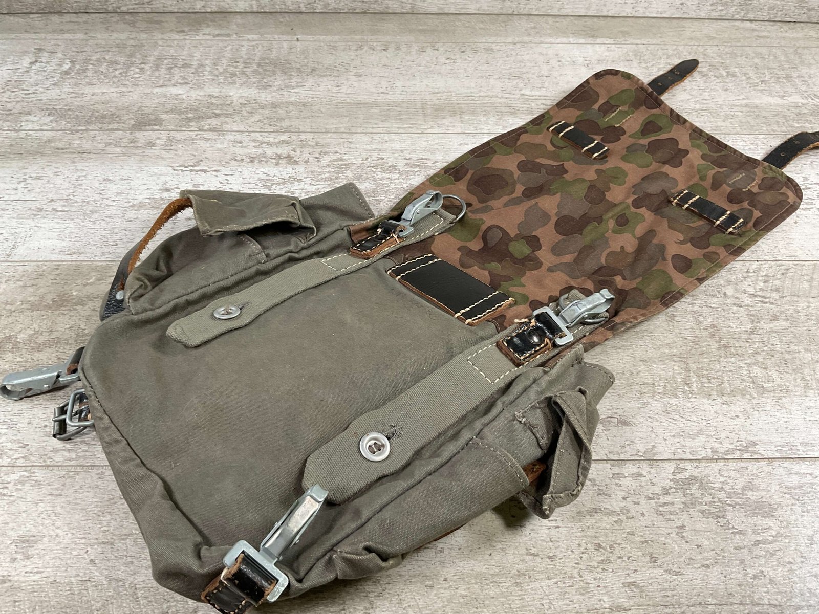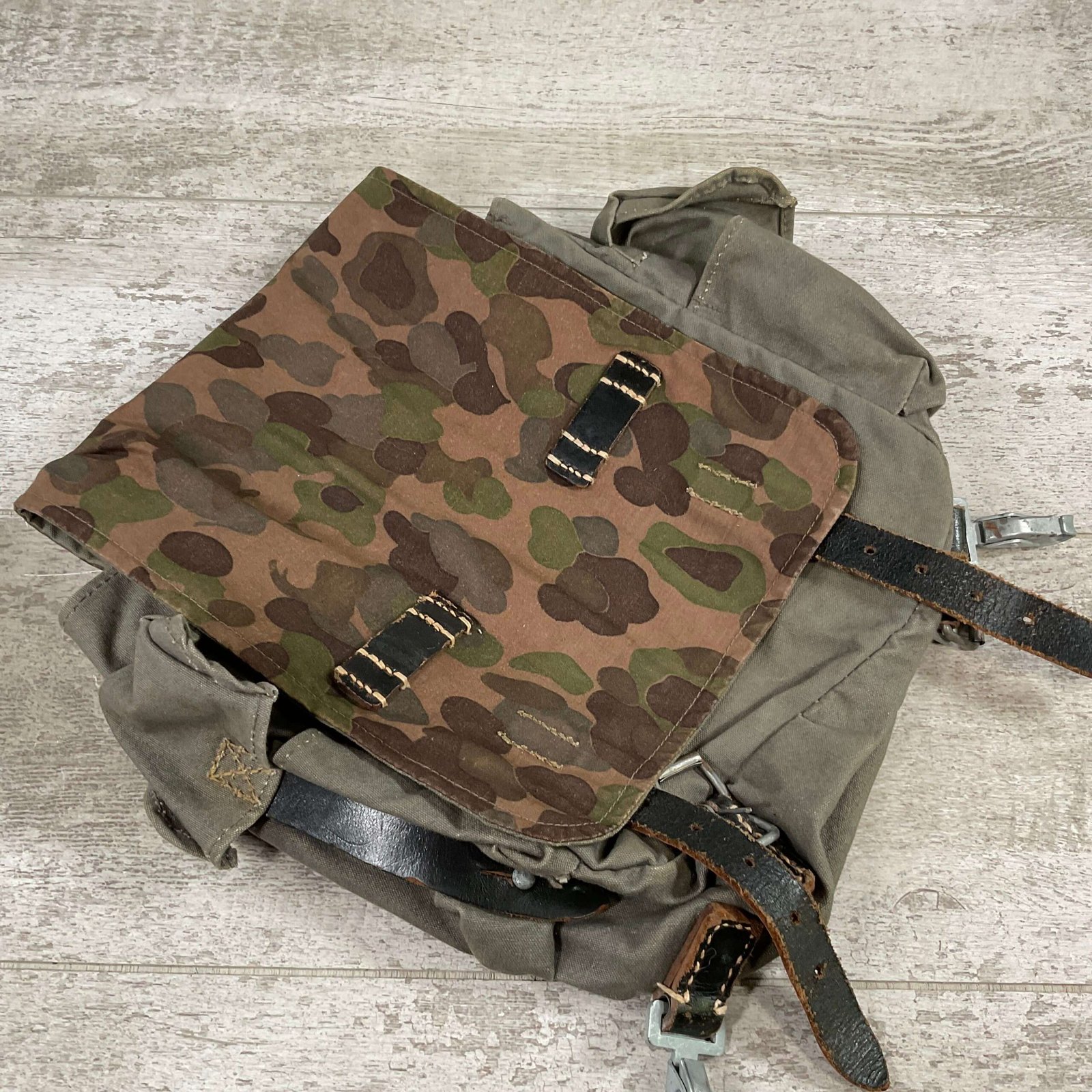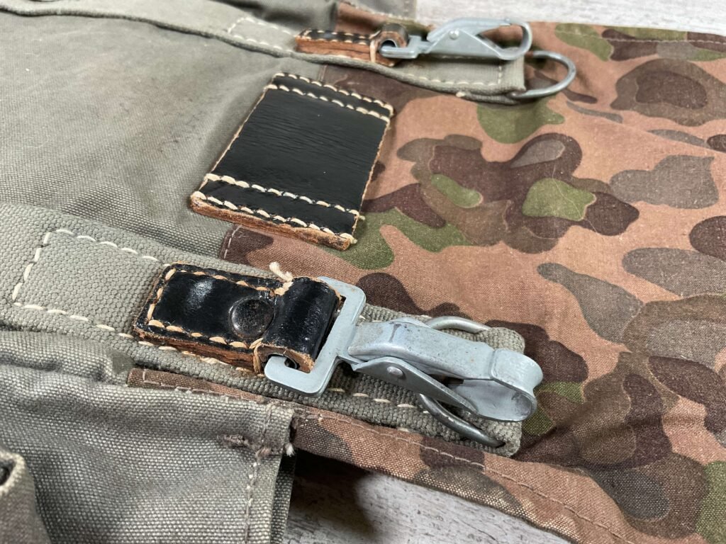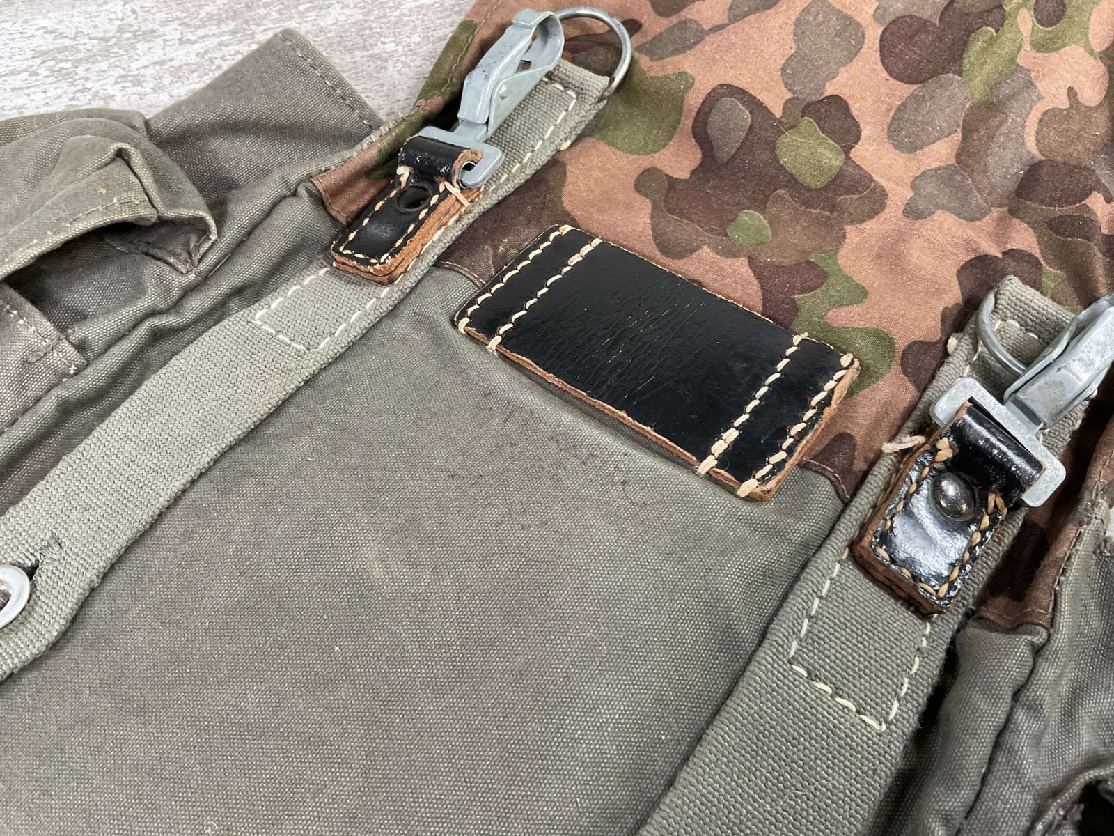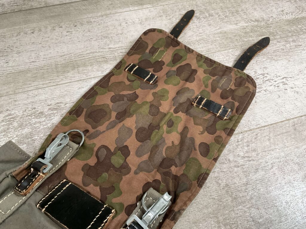 GERMAN POST WAR BGS CAMO BREAD BAG, “F. SCHLUGA” MARKED UNDER FLAP, LEATHER STRAPS, METAL CLASPS, EXC OVERALL CONDITION