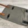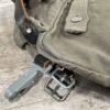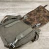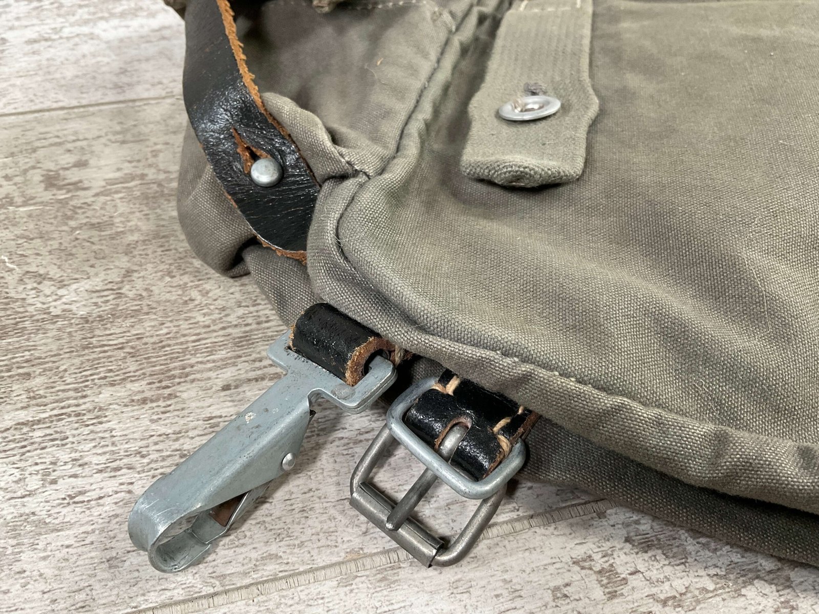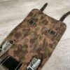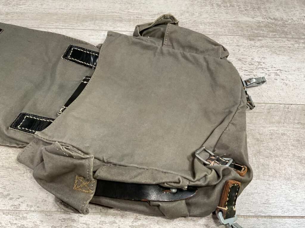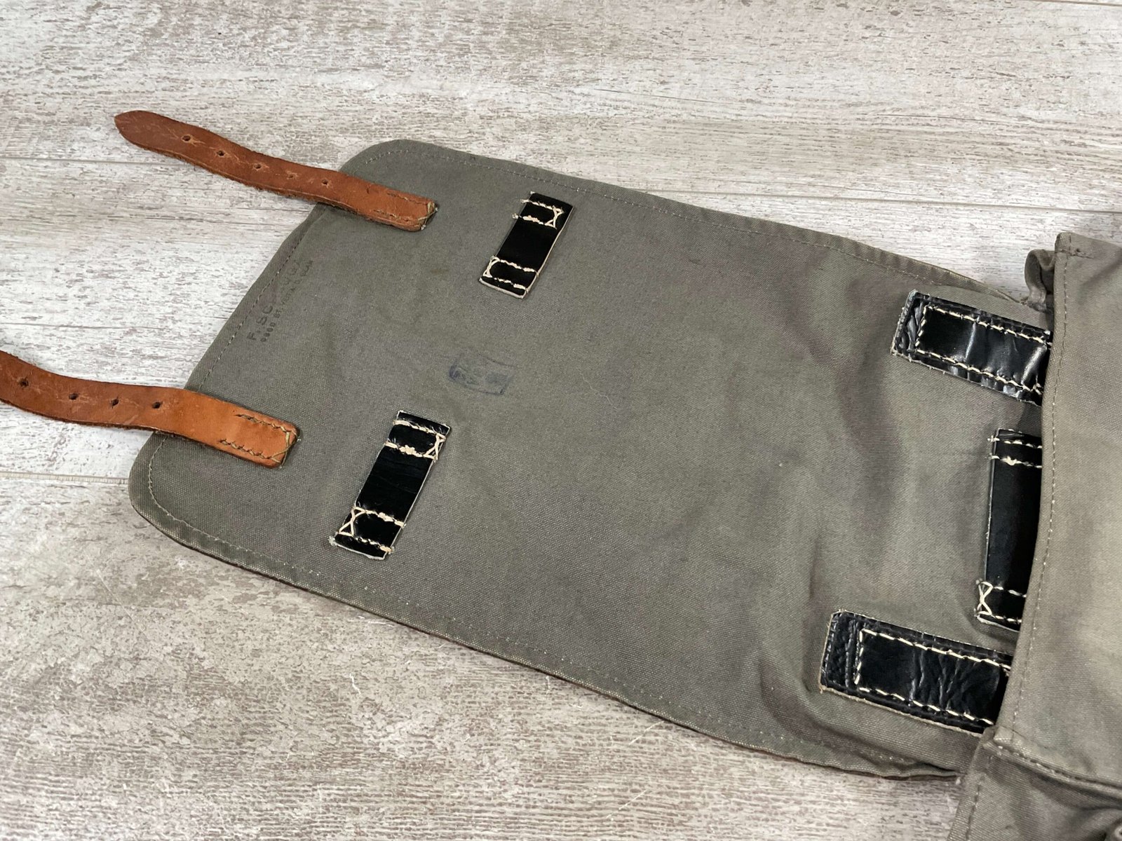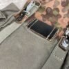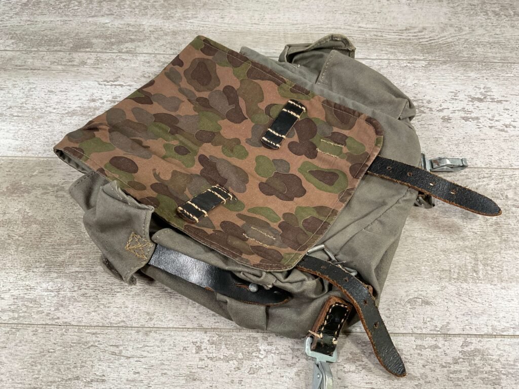 GERMAN POST WAR BGS CAMO BREAD BAG, “F. SCHLUGA” MARKED UNDER FLAP, LEATHER STRAPS, METAL CLASPS, EXC OVERALL CONDITION
