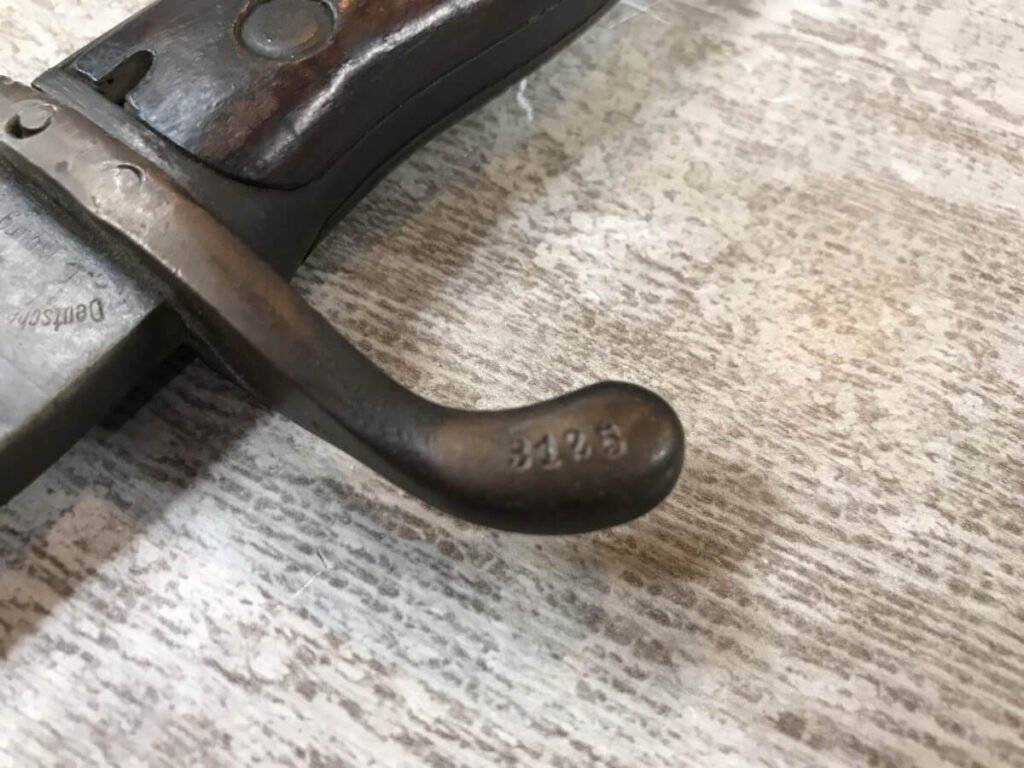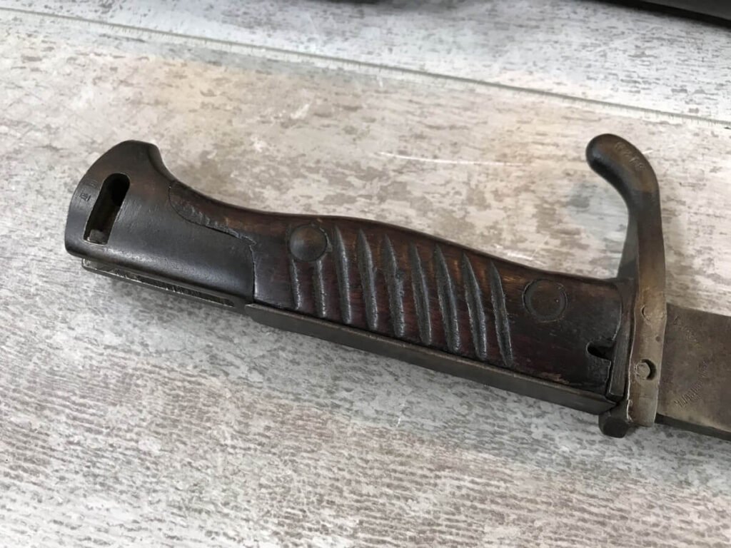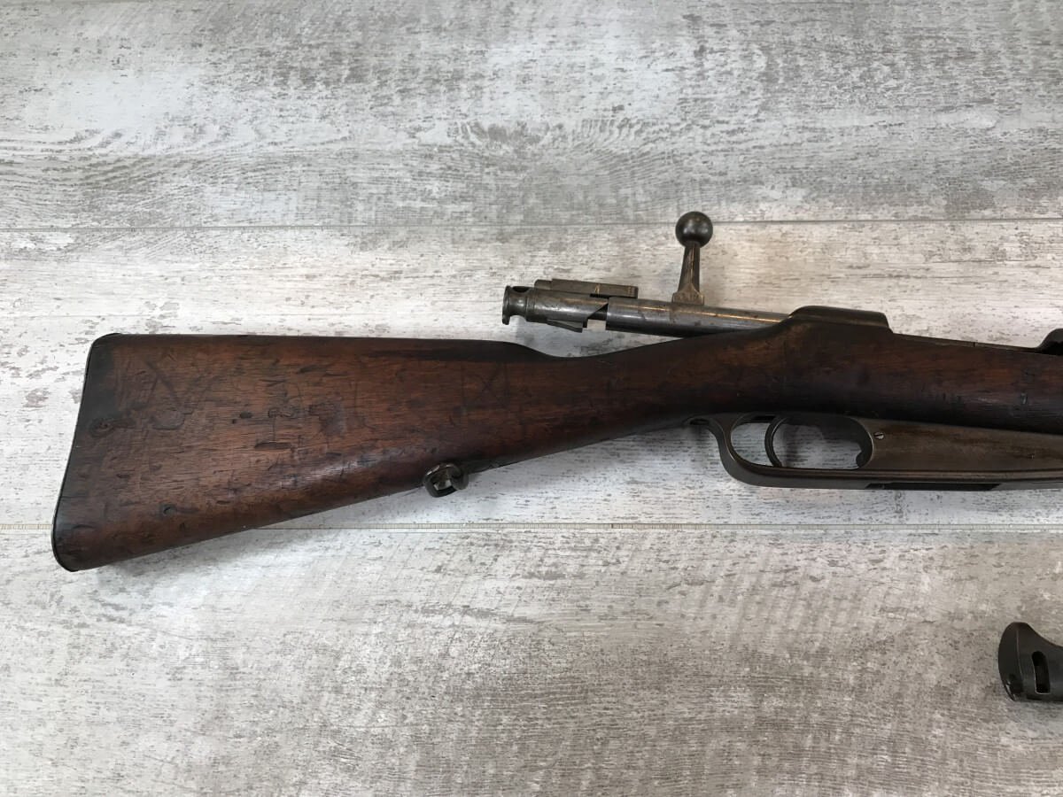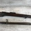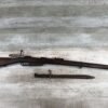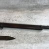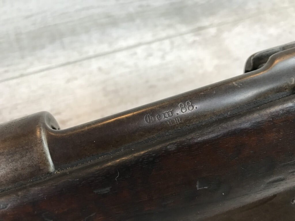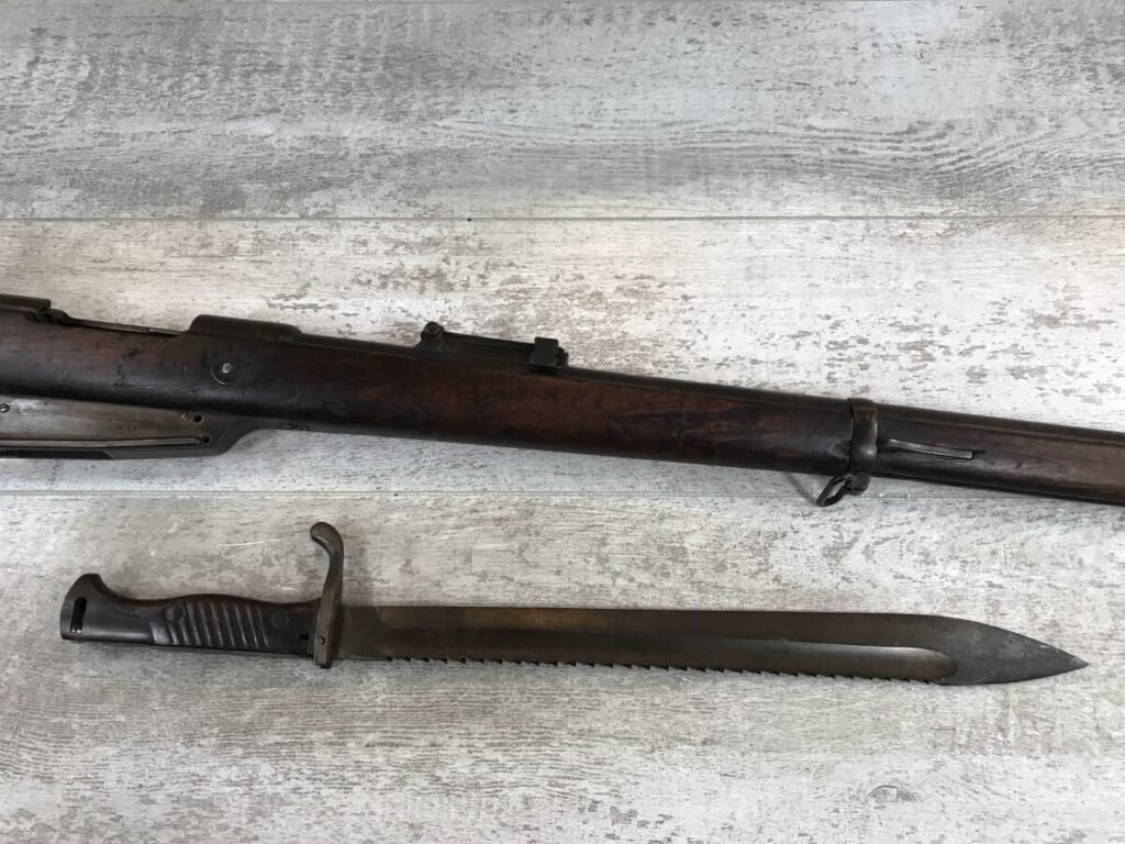 SKU#435 GEWEHR 88 GEW 88 RIFLE W/SAWBACK BAYONET #77d, 8MM MAUSER, “SPANDAU 1895″ OVER CHAMBER, MISSING CLEANING ROD, CORRECT CARTOUCHES, NOT MATCHING #’S, 29 1/2″ BBL, DARK BORE W/PITTING, SAWBACK BAYONET HAS 14 1/2” BLADE, WOODEN HANDLE, MISSING RELEASE, GOOD OVERALL CONDITION, 85% OVERALL FOR FIREARM
