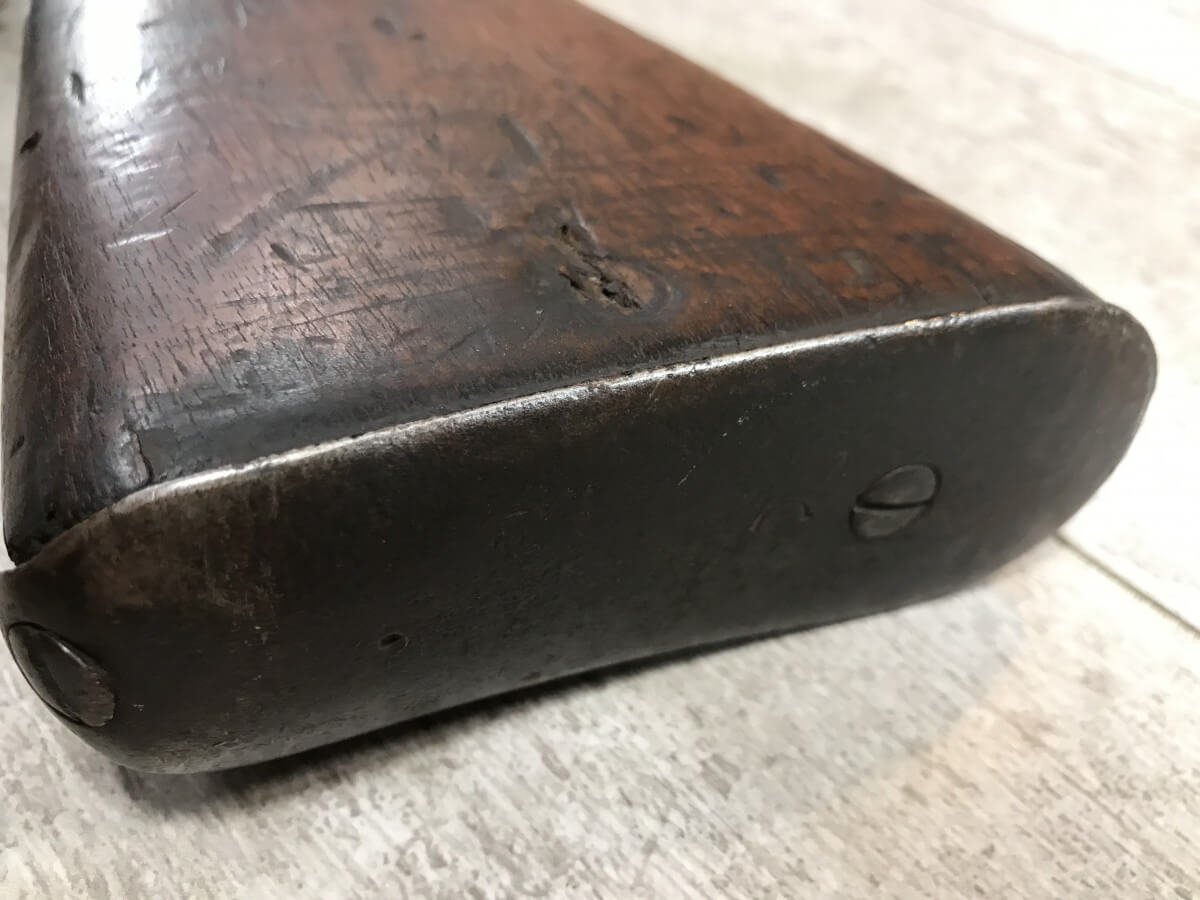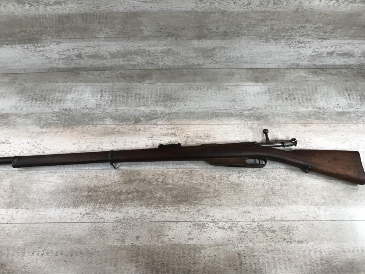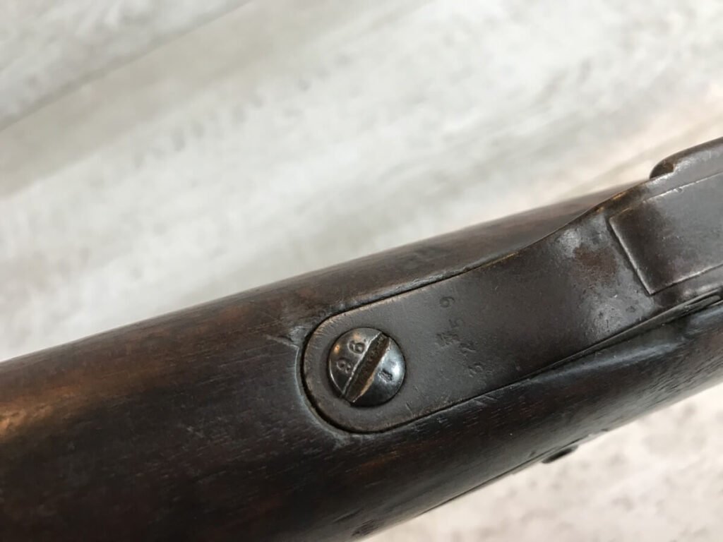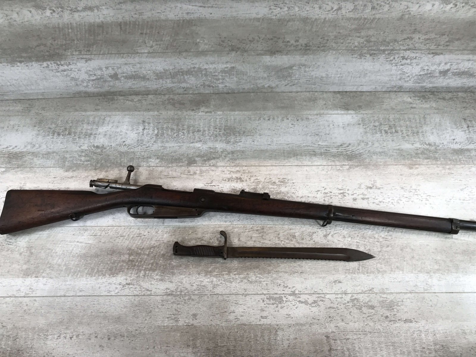 SKU#435 GEWEHR 88 GEW 88 RIFLE W/SAWBACK BAYONET #77d, 8MM MAUSER, “SPANDAU 1895″ OVER CHAMBER, MISSING CLEANING ROD, CORRECT CARTOUCHES, NOT MATCHING #’S, 29 1/2″ BBL, DARK BORE W/PITTING, SAWBACK BAYONET HAS 14 1/2” BLADE, WOODEN HANDLE, MISSING RELEASE, GOOD OVERALL CONDITION, 85% OVERALL FOR FIREARM