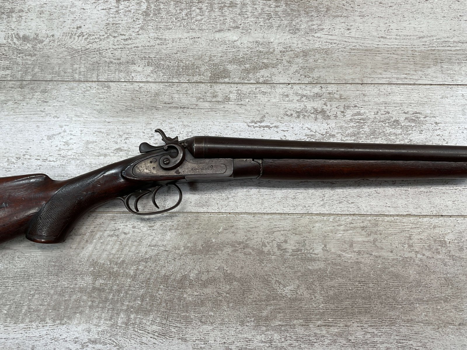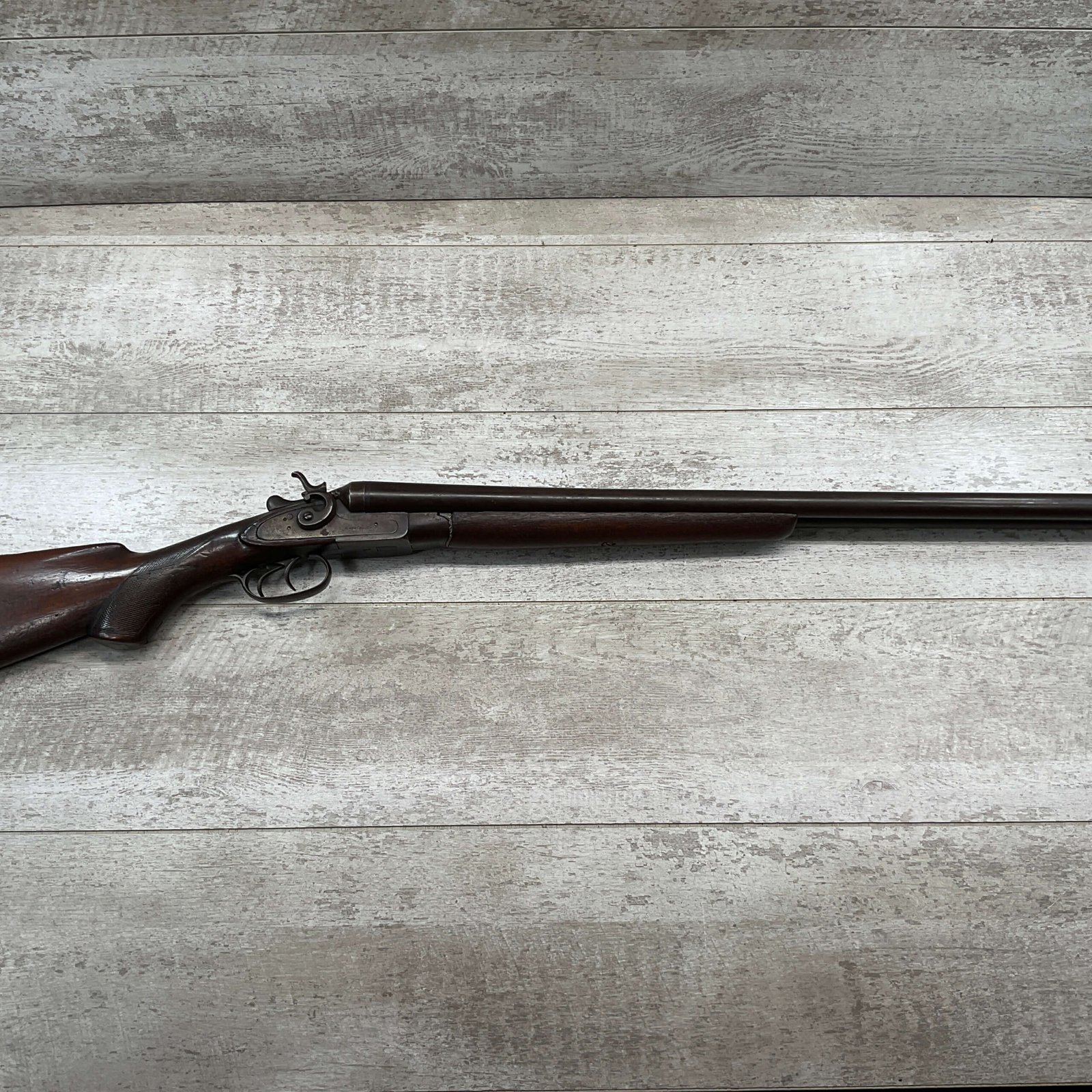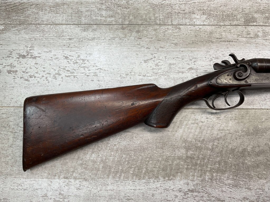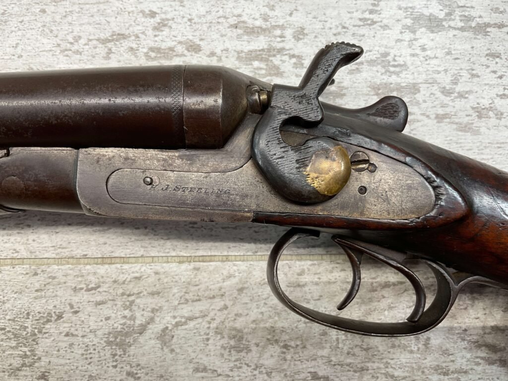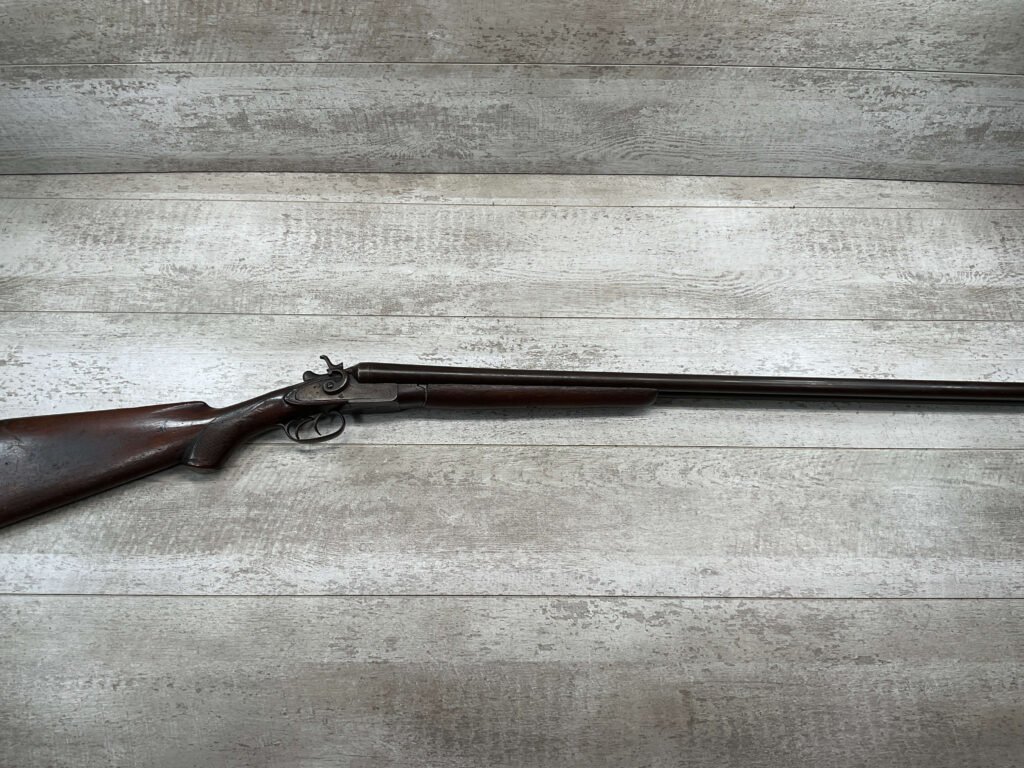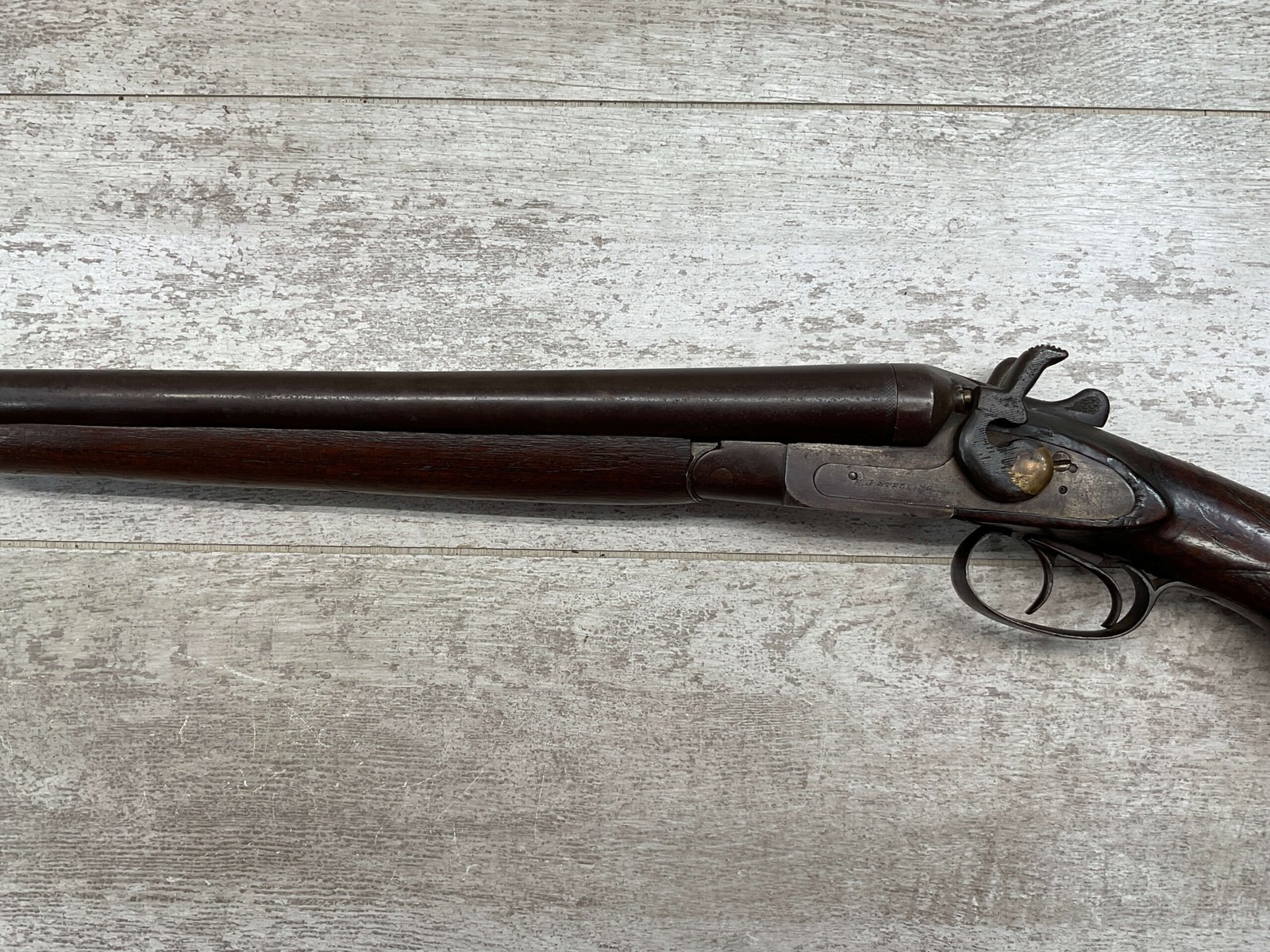 H.J. STERLING SxS 12GA BELGIUM SHOTGUN, ANTIQUE #5176, 32″ BBLS, RIGHT BBL – MODIFIED, LEFT BBL- IMPROVED CYL, LIGHT FROSTING IN BORES, FINISH HAS TURNED BROWN PATINA W/LIGHT FRECKLING/PITTING, REPAIR MADE TO LEFT HAMMER, HAMMERS DO NOT MATCH EITHER, HOLD AT FULL COCK AND FIRE, DOUBLE TRIGGER, BELGIUM LAMINATED STEEL BARRELS, GOOD SOLID CHECKERED STOCK W/DINGS IMPRESSIONS FROM AGE/USE, STEEL BUTT PAD, WALL HANGER OR BLACK POWDER SHOOTER?