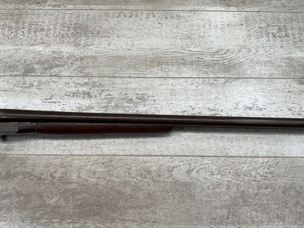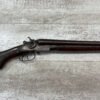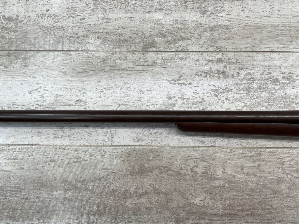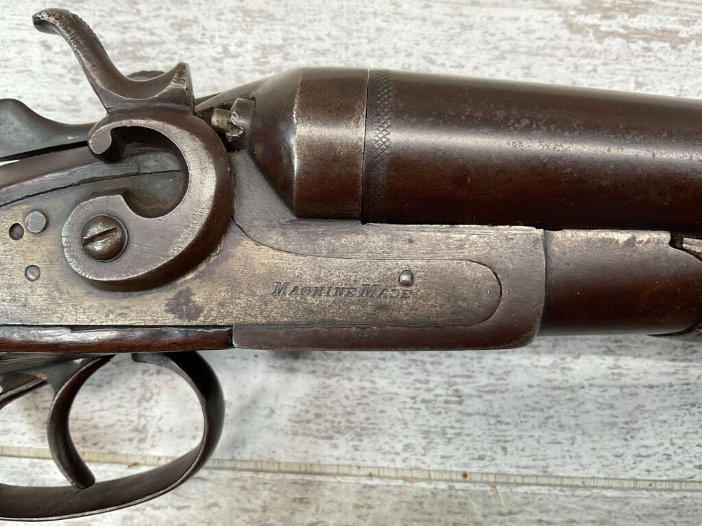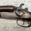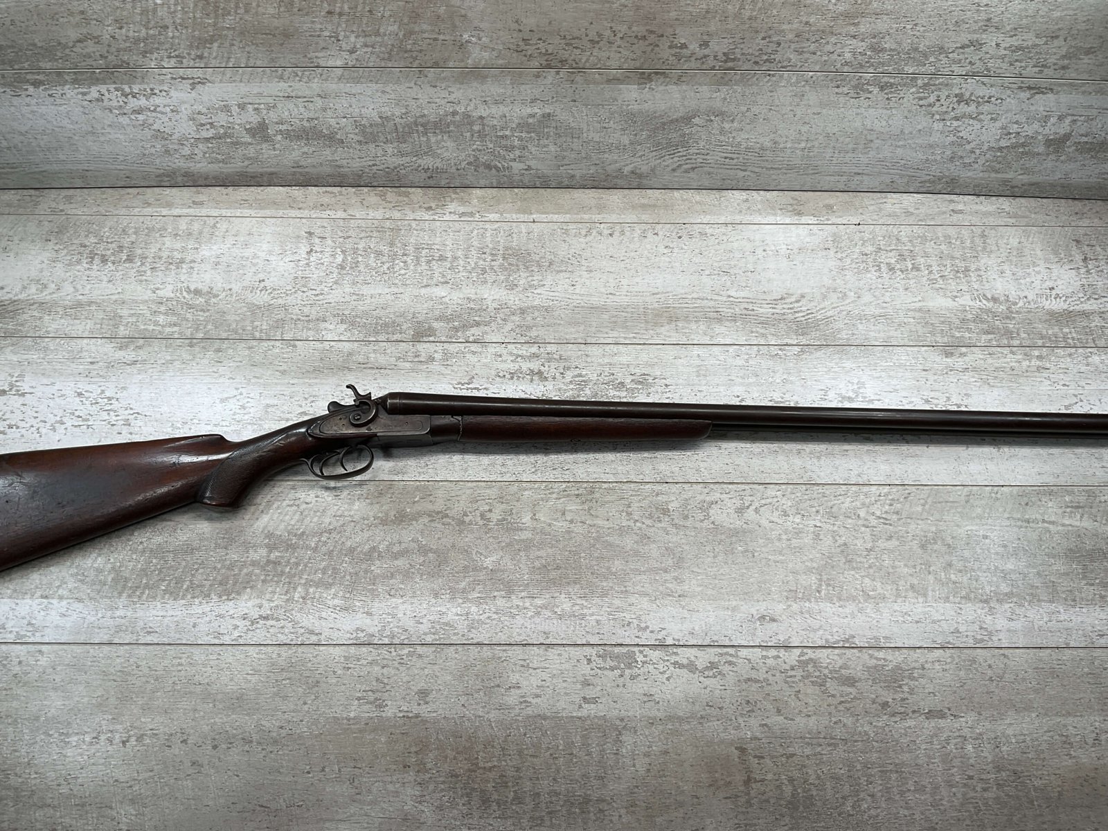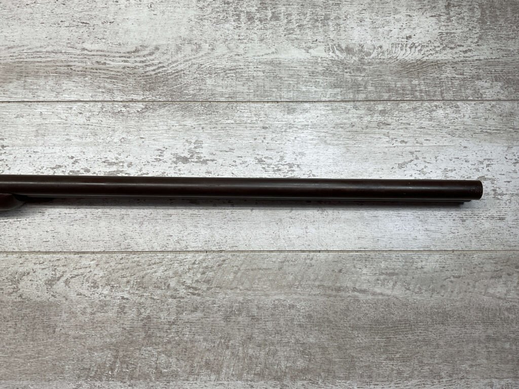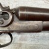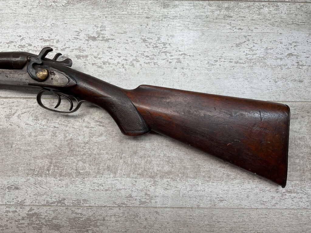 H.J. STERLING SxS 12GA BELGIUM SHOTGUN, ANTIQUE #5176, 32″ BBLS, RIGHT BBL – MODIFIED, LEFT BBL- IMPROVED CYL, LIGHT FROSTING IN BORES, FINISH HAS TURNED BROWN PATINA W/LIGHT FRECKLING/PITTING, REPAIR MADE TO LEFT HAMMER, HAMMERS DO NOT MATCH EITHER, HOLD AT FULL COCK AND FIRE, DOUBLE TRIGGER, BELGIUM LAMINATED STEEL BARRELS, GOOD SOLID CHECKERED STOCK W/DINGS IMPRESSIONS FROM AGE/USE, STEEL BUTT PAD, WALL HANGER OR BLACK POWDER SHOOTER?