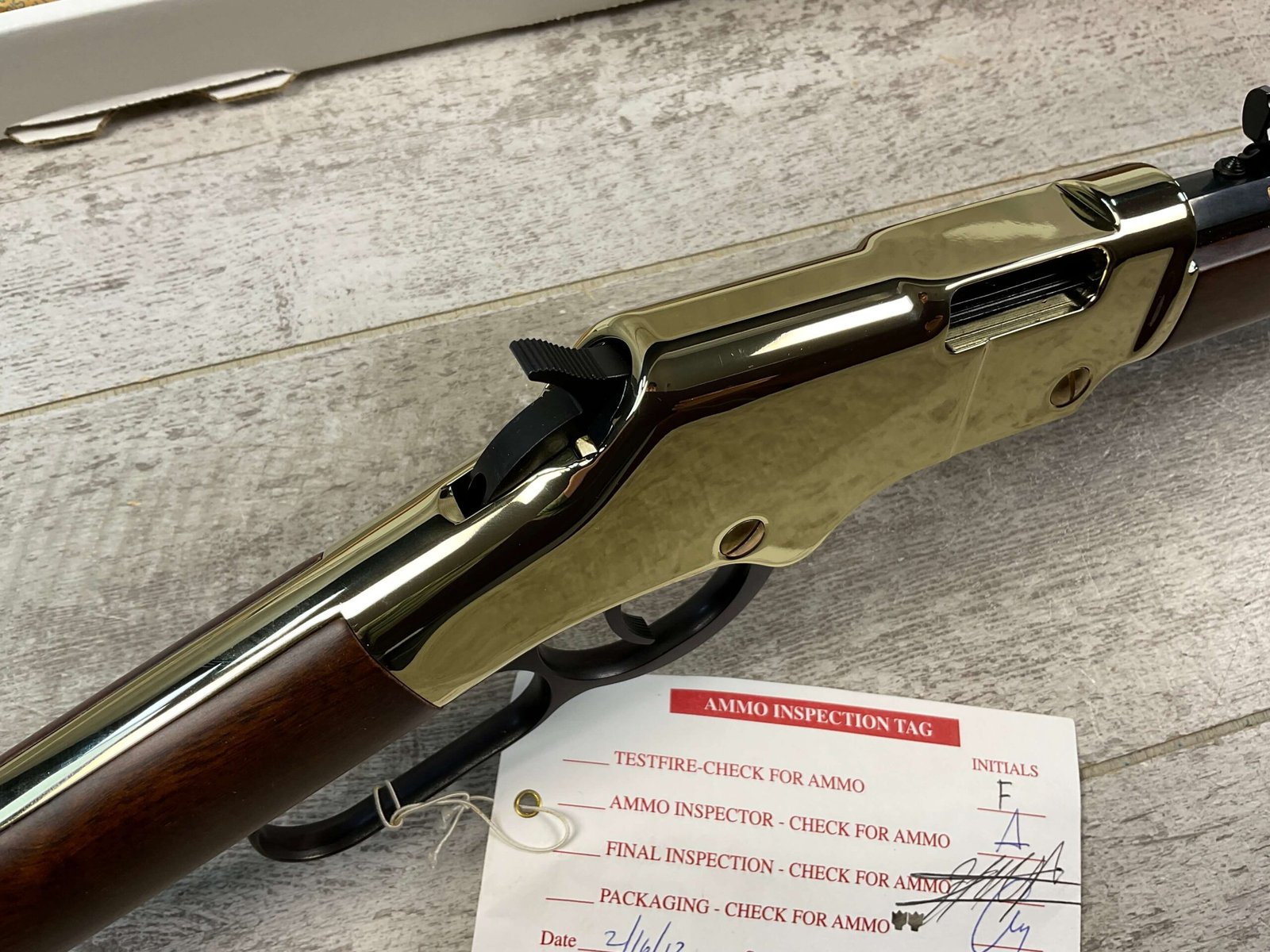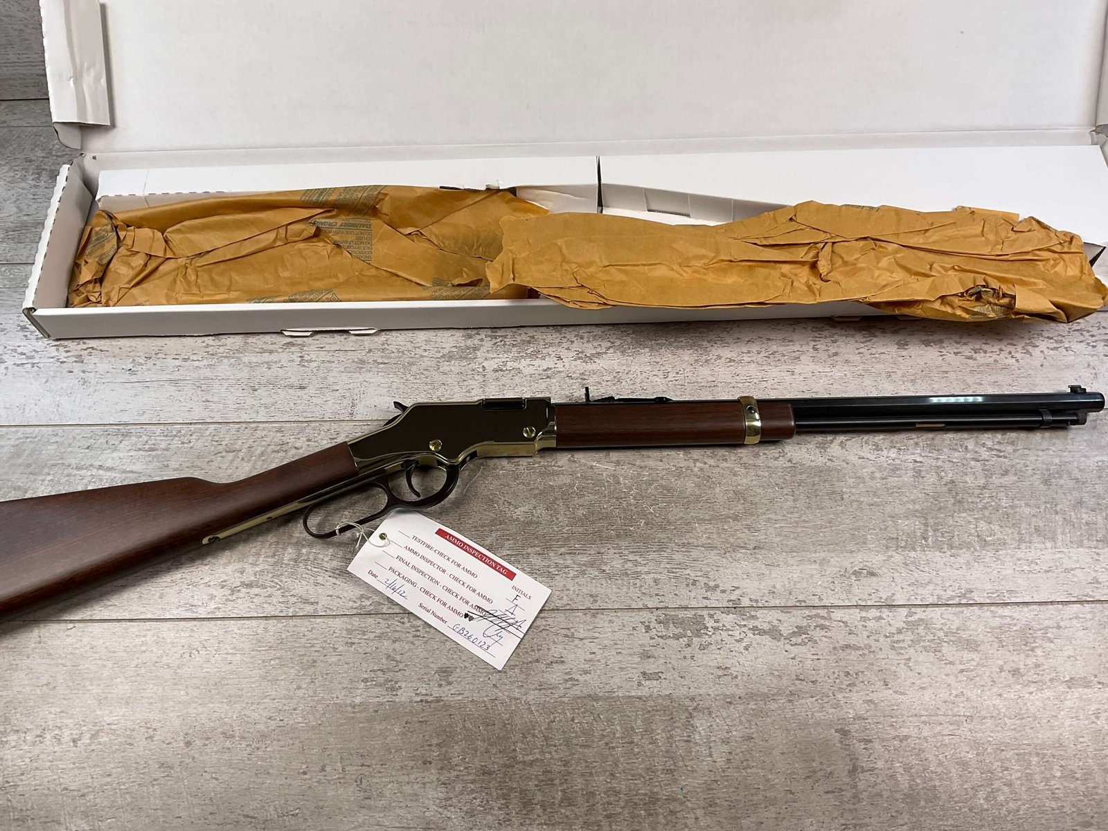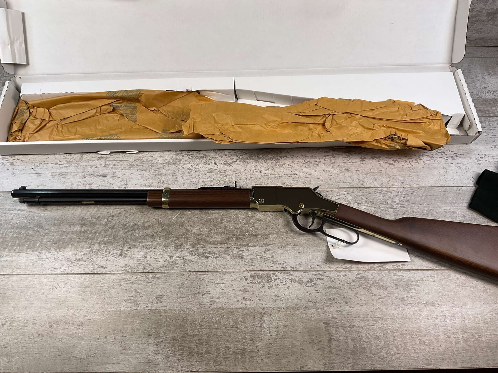 HENRY GOLDEN BOY H004 .22LR LEVER ACTION RIFLE #GB260123, 20″ OCTAGON BARREL, DRILLED & TAPPED, BRASSLITE BARREL BAND/RECEIVER/BUTTPLATE, ADJ SEMI-BUCKHORN REAR SIGHT, ADJ WHITE DIAMOND INSERT & BRASS BEAD FORNT SIGHT, BEAUTIFUL AMERICAN WALNUT STOCK, NEW IN BOX, NEVER FIRED.