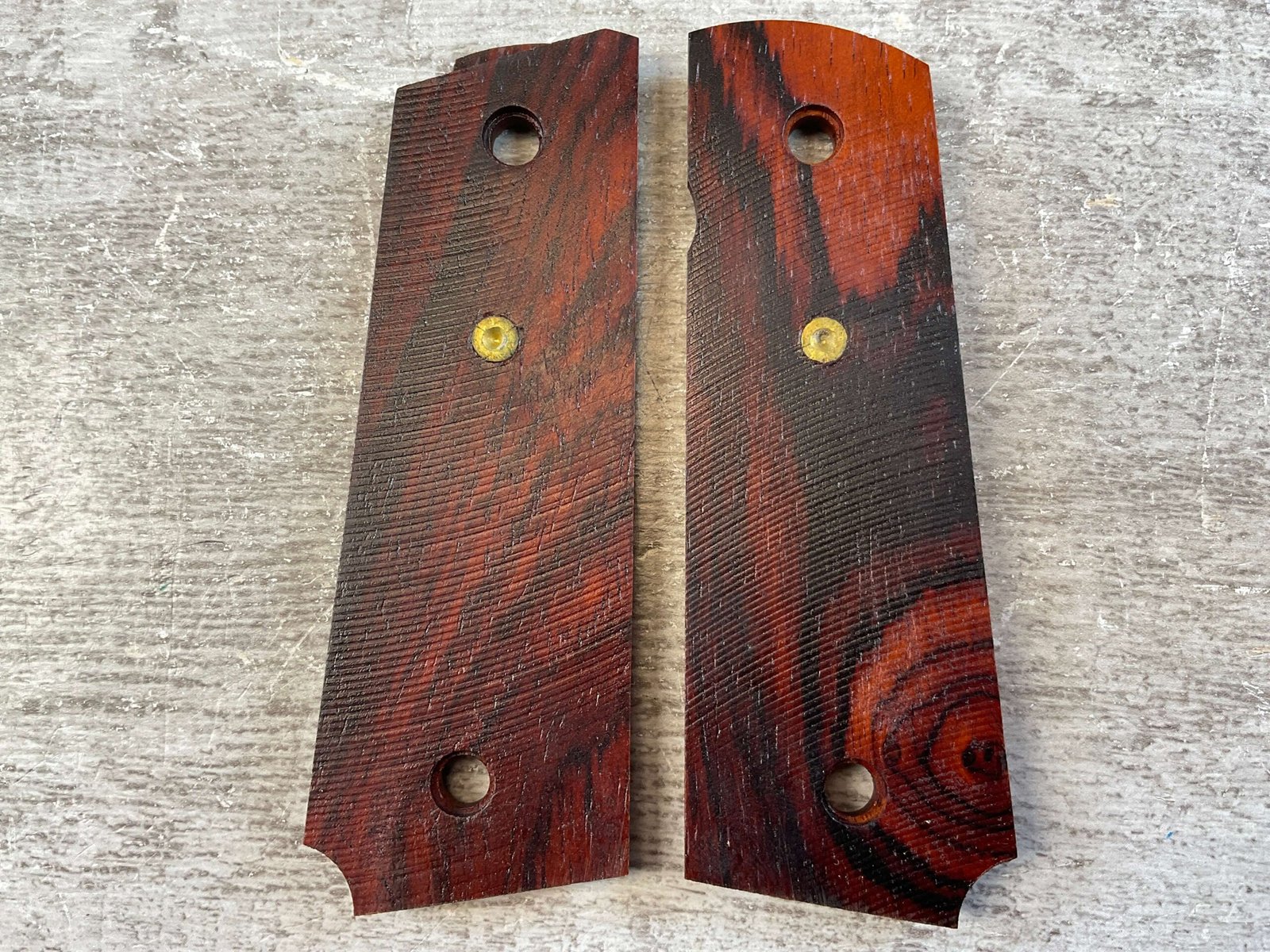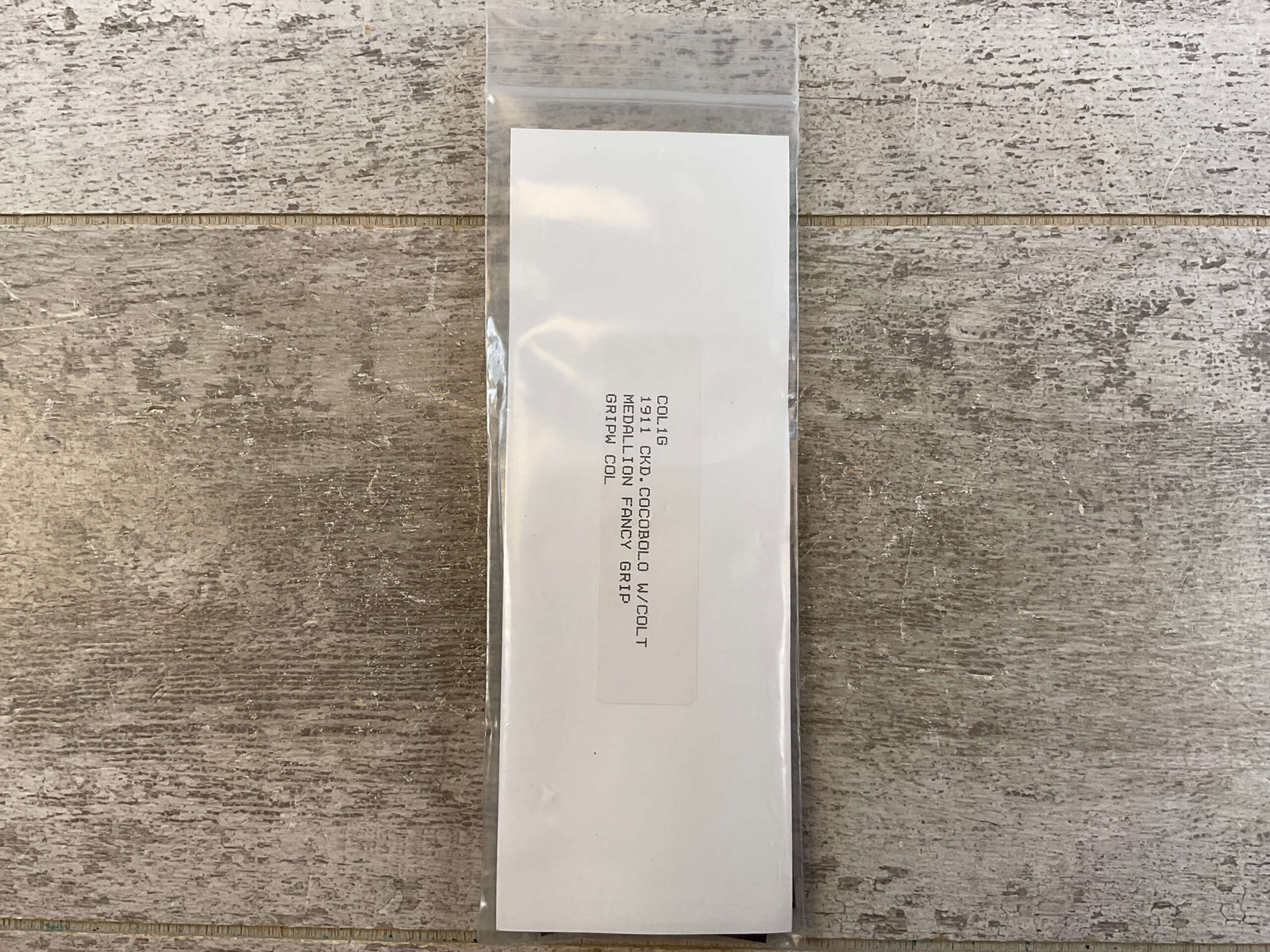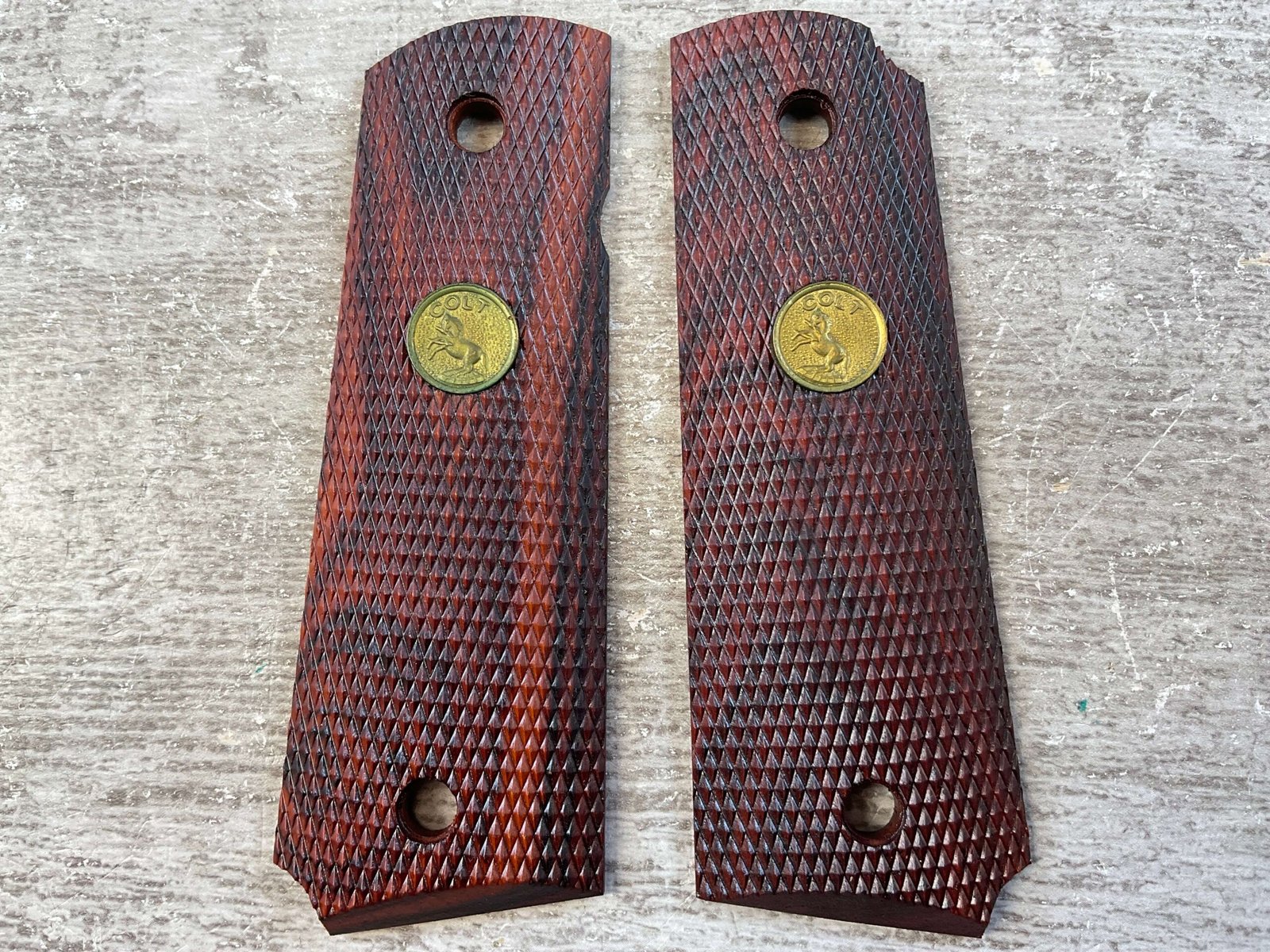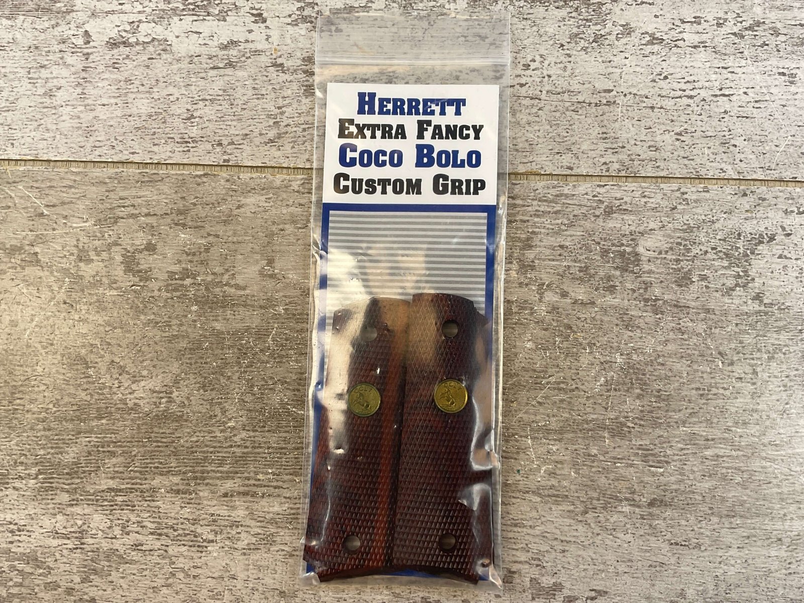 HERRETT EXTRA FANCY COCO BOLO 1911 CUSTOM GRIPS, JAMES EARL JONES COLLECTION, CHECKERED GRIPS WITH GOLD COLT MEDALLIONS, LIKE NEW AND COMES IN ORIGINAL PACKAGING!