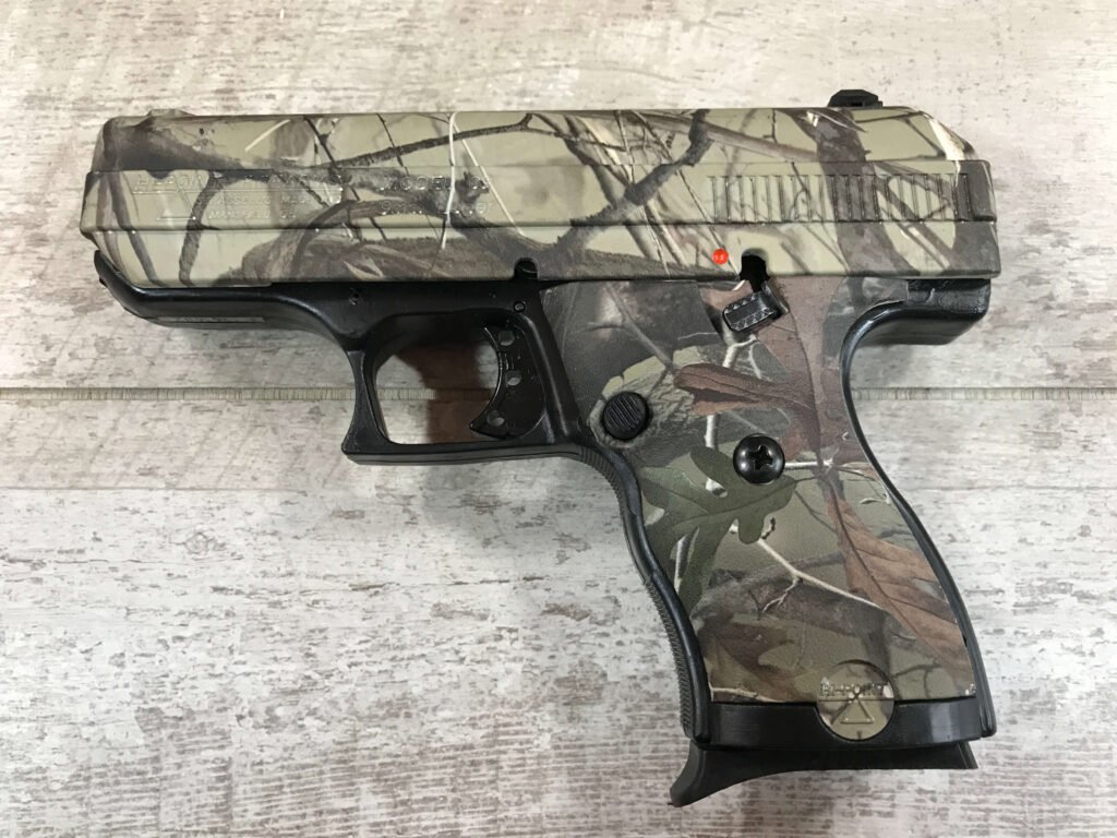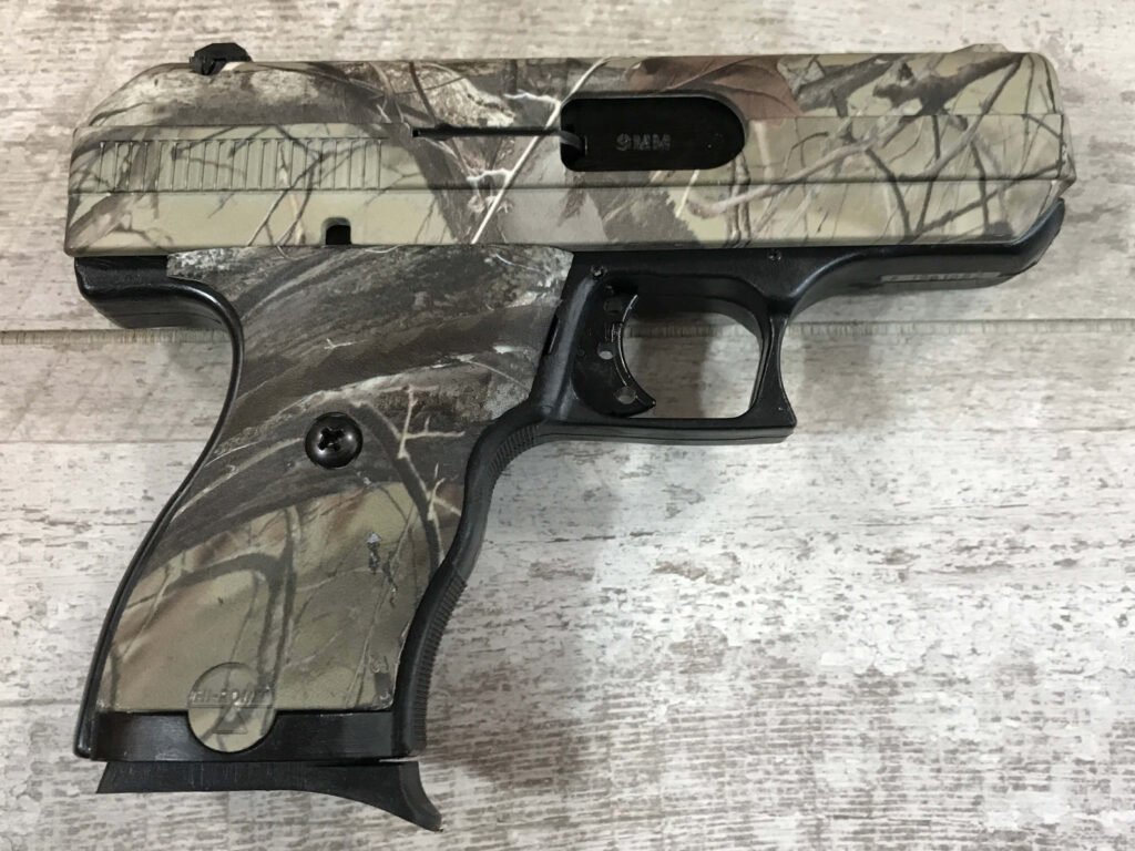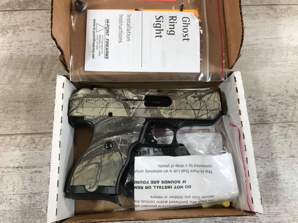 SKU#066 HI-POINT C9 WOODLAND 9MM PISTOL #P1961682, NIB, 8 ROUNDS, 3.5″ BARREL, POLYMER FRAME, EASY GRIP FINISH, THUMB SAFETY, +P RATED, FREE EXTRA REAR GHOST RING SIGHT/TRIGGER LOCK, LIFETIME WARRANTY, NIB 99+%