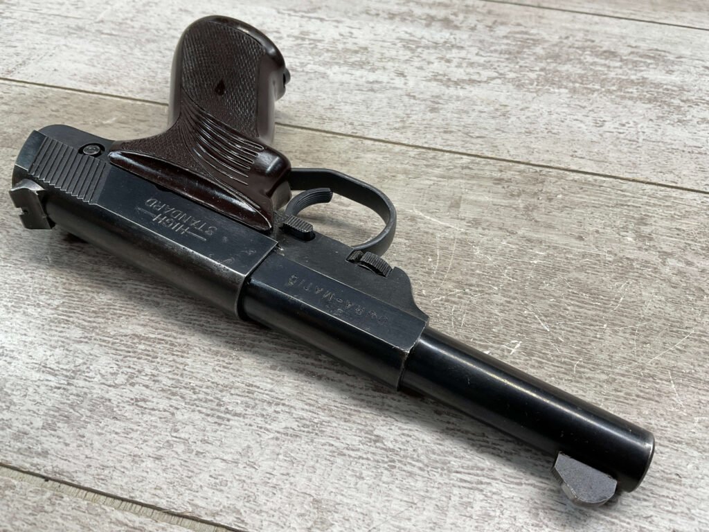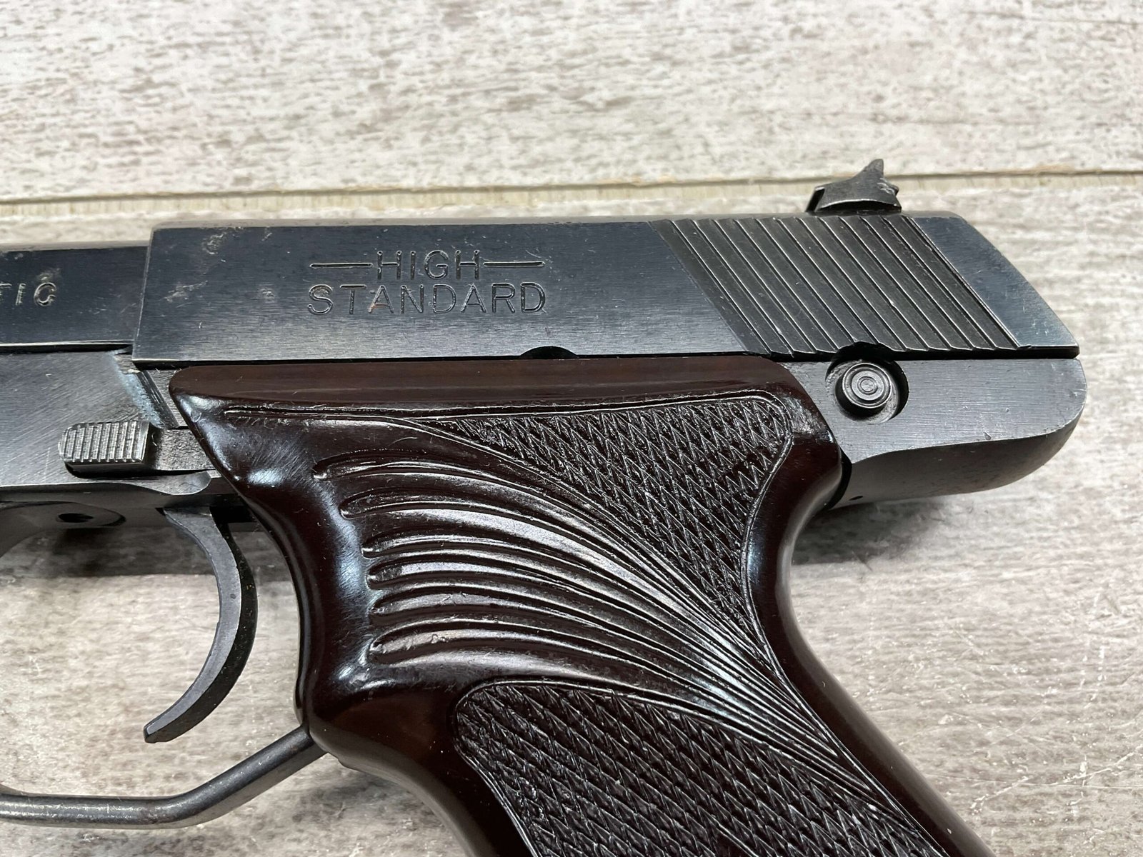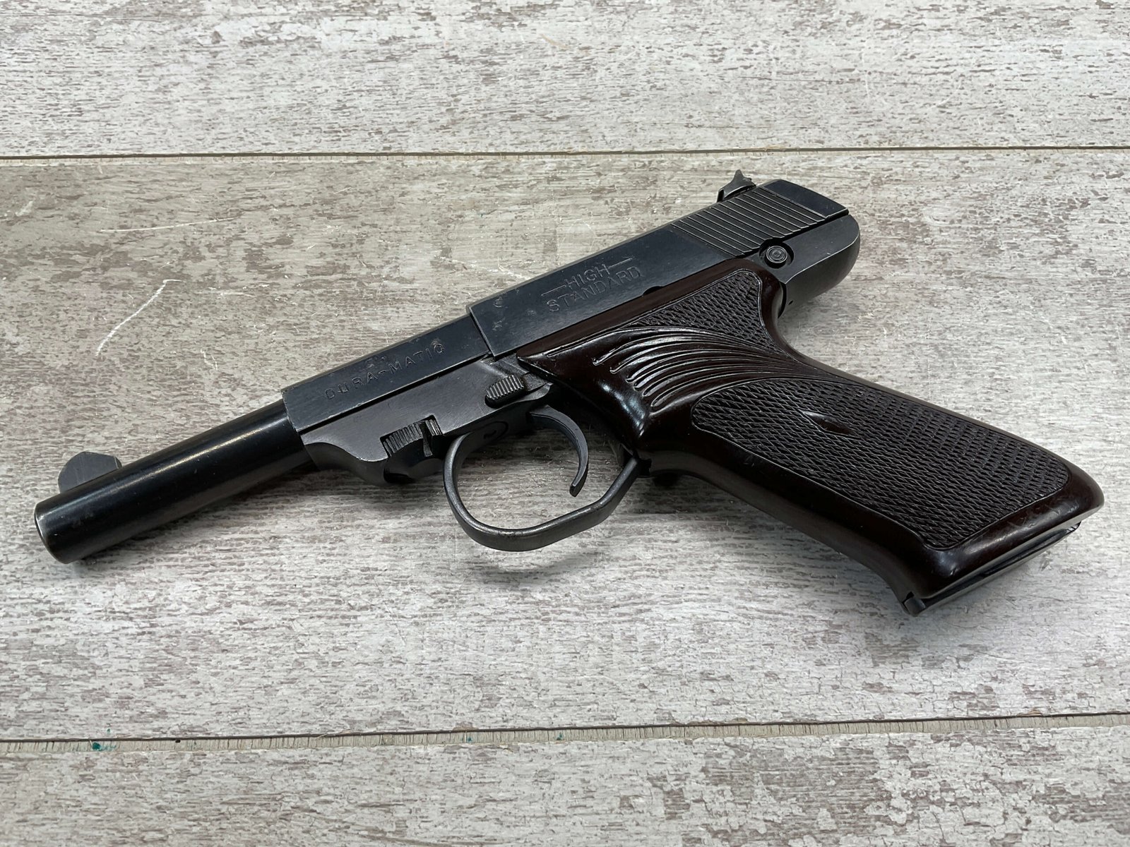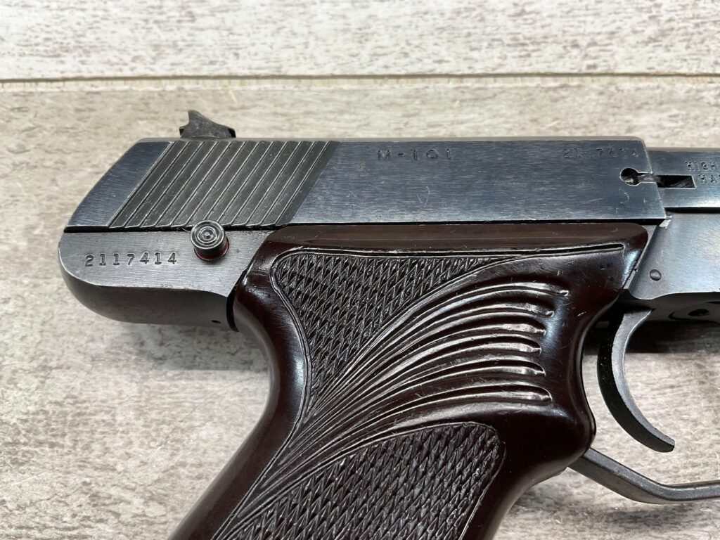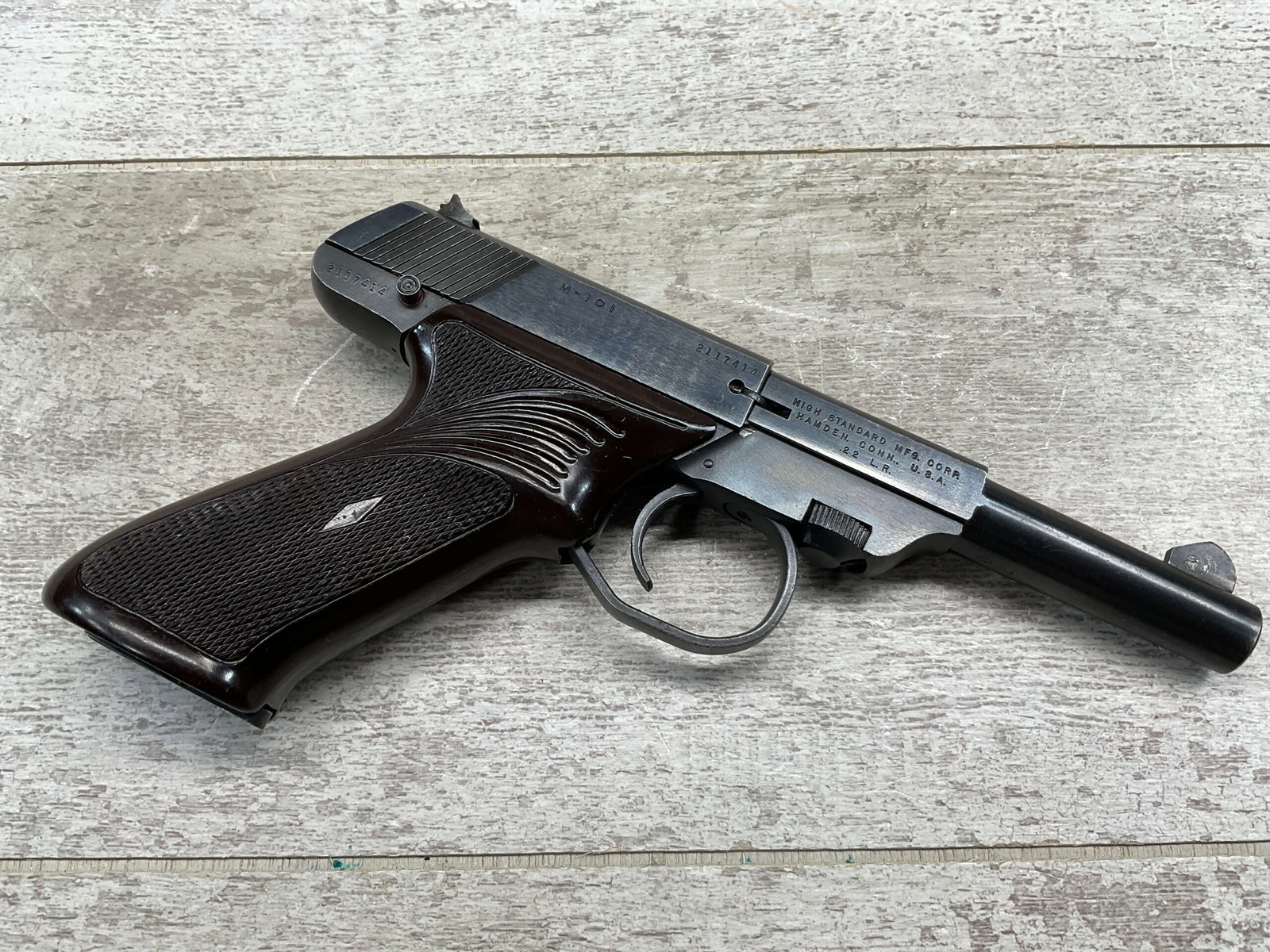 HIGH STANDARD M-101 DURA-MATIC .22LR SEMI AUTO PISTOL, 1969 MFR #2117414, 4 1/2″ BARREL, EXC BRIGHT BORE & RIFLING, GOOD ORIGINAL BLUE W/ HIGH EDGE WEAR & A COUPLE AREAS OF SPECKLING, VG/EXC CHECKERED PLASTIC GRIPS, 1 – 10 ROUND MAGAZINE, VG OVERALL