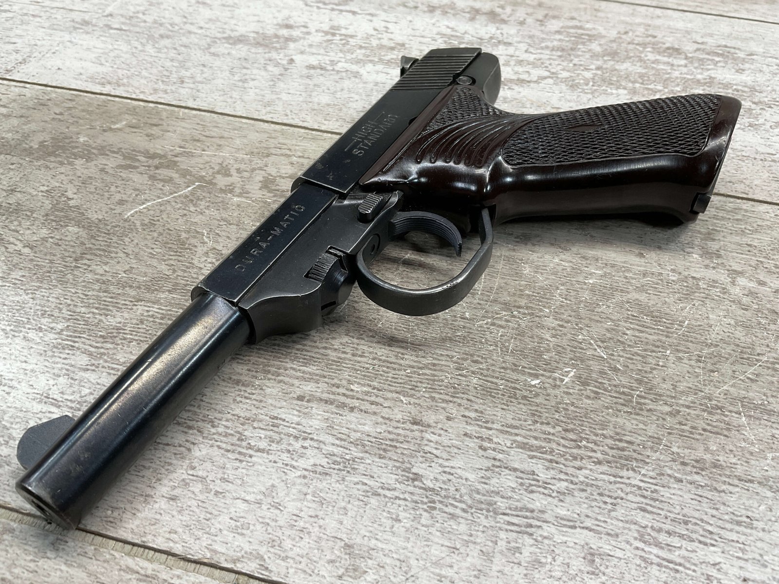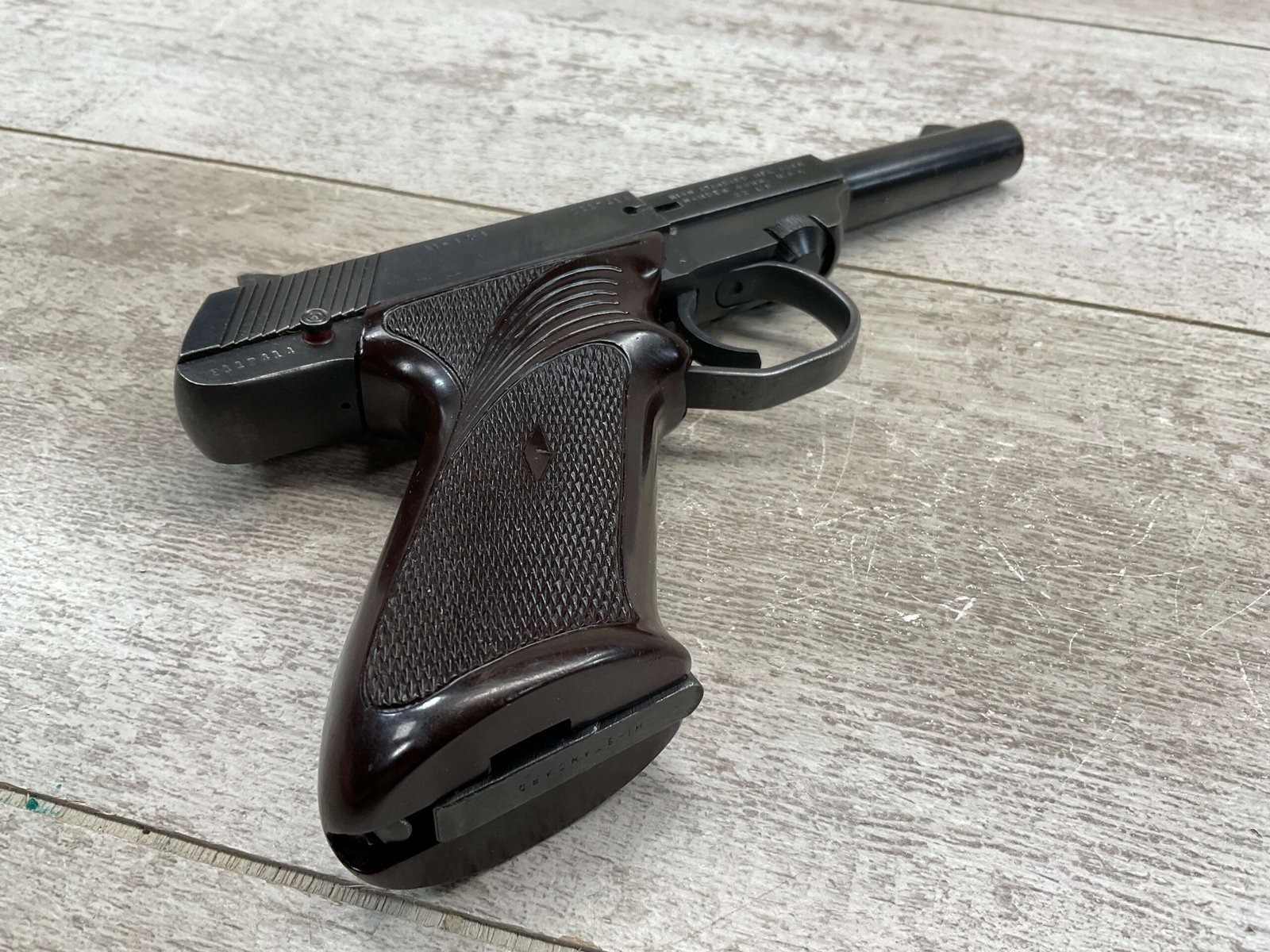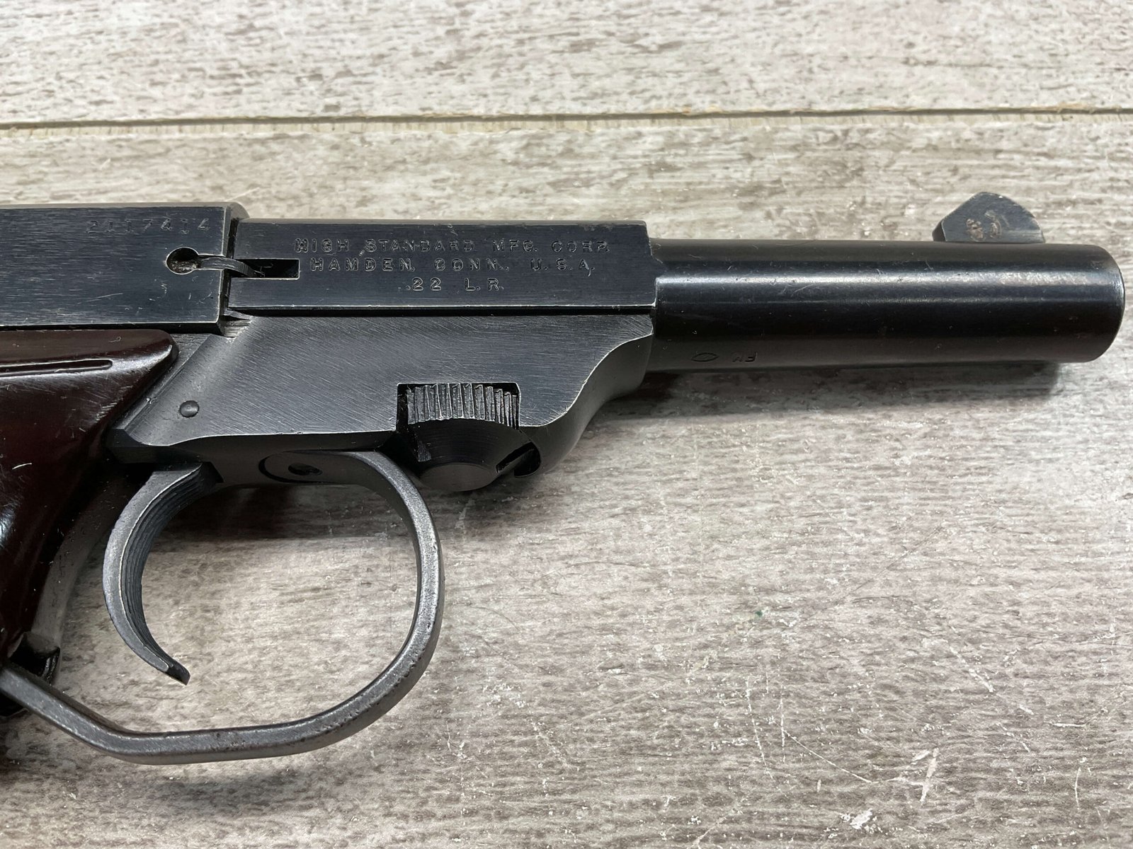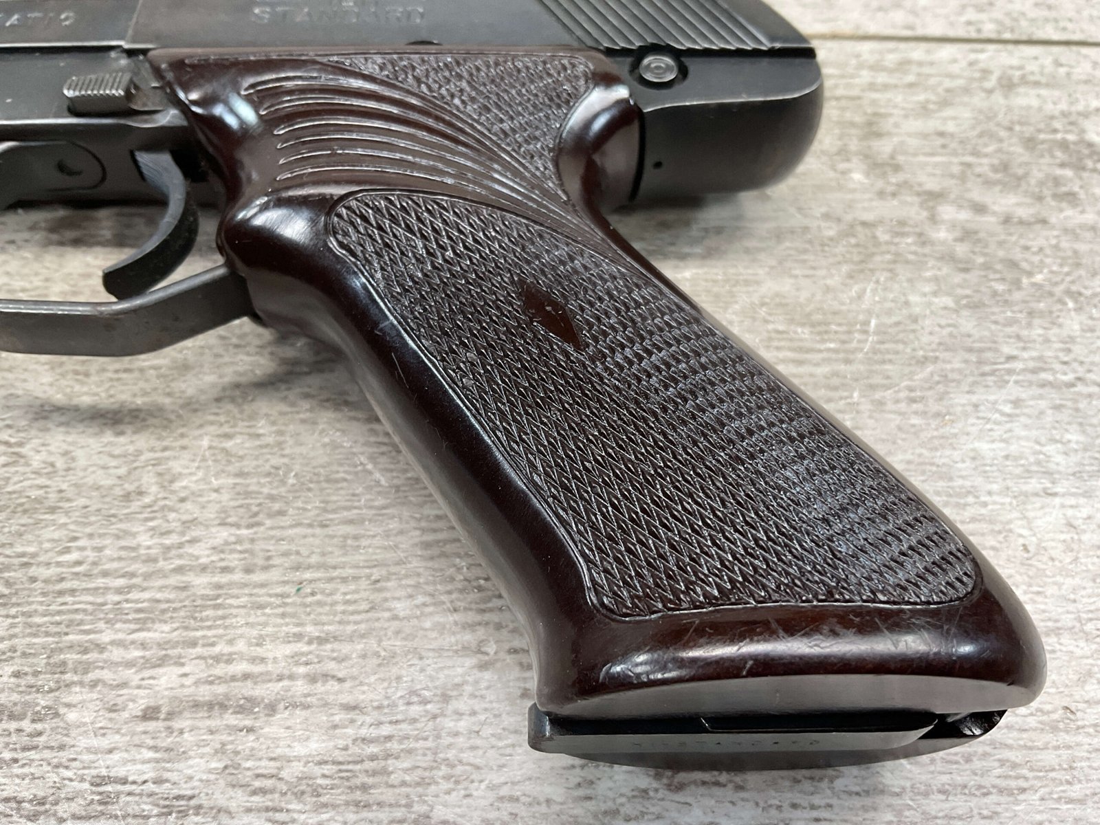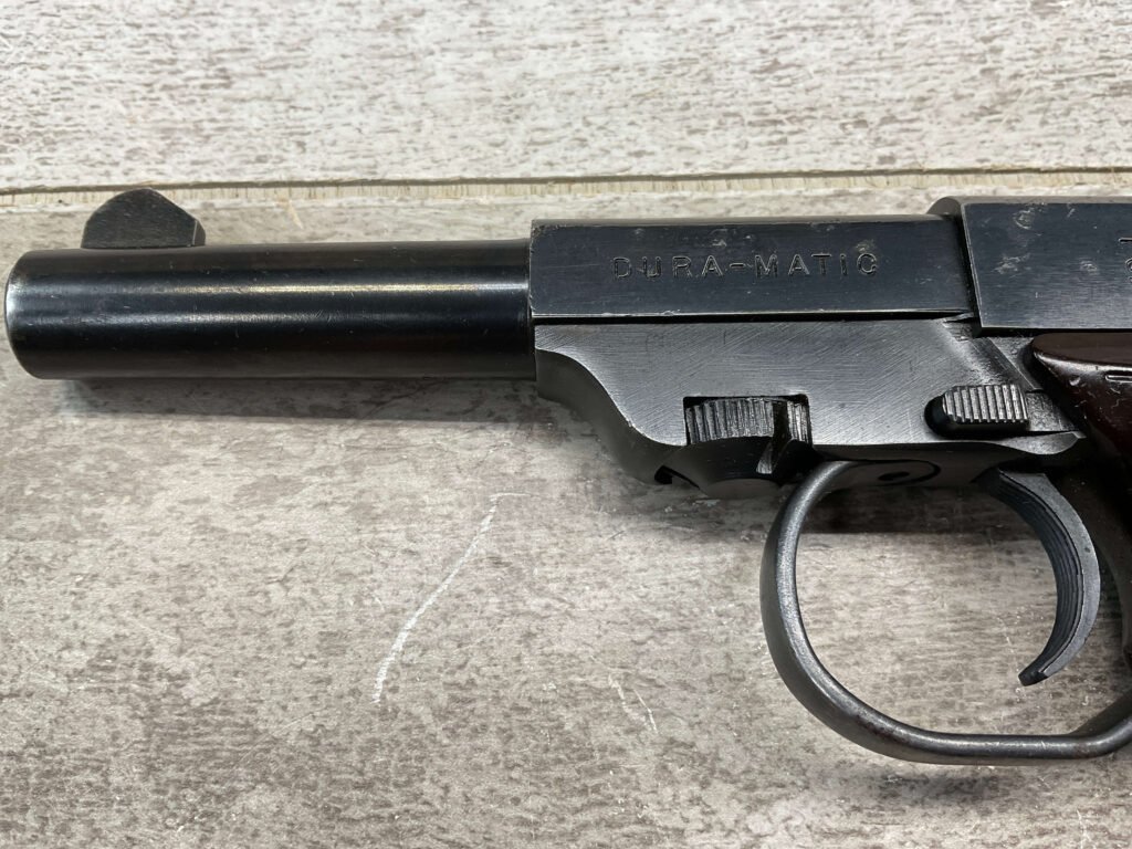HIGH STANDARD M-101 DURA-MATIC .22LR SEMI AUTO PISTOL, 1969 MFR #2117414, 4 1/2″ BARREL, EXC BRIGHT BORE & RIFLING, GOOD ORIGINAL BLUE W/ HIGH EDGE WEAR & A COUPLE AREAS OF SPECKLING, VG/EXC CHECKERED PLASTIC GRIPS, 1 – 10 ROUND MAGAZINE, VG OVERALL