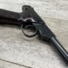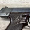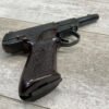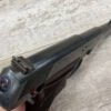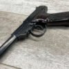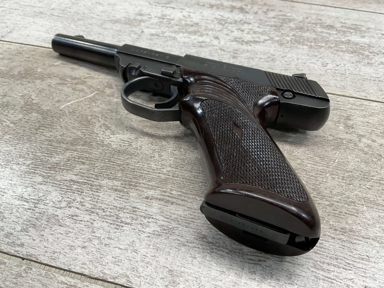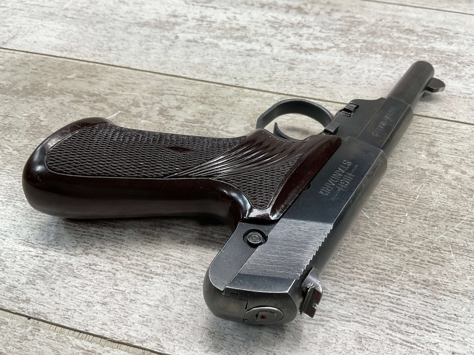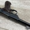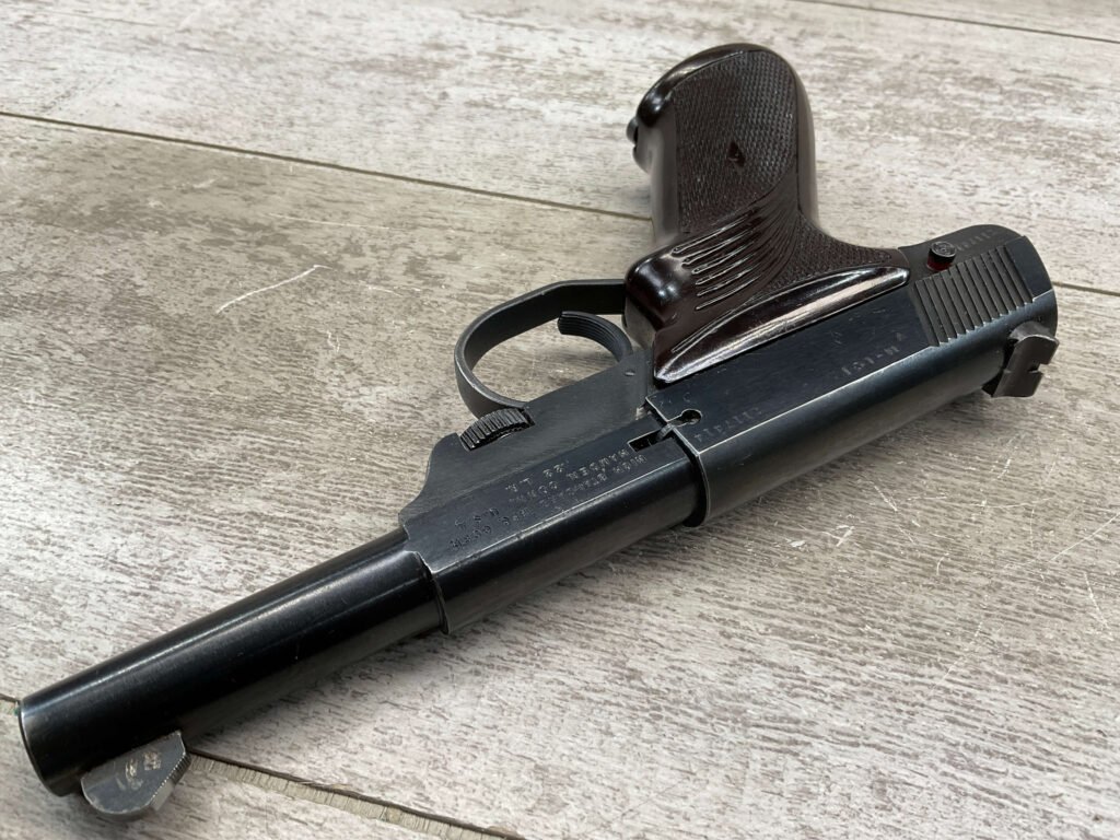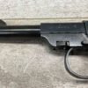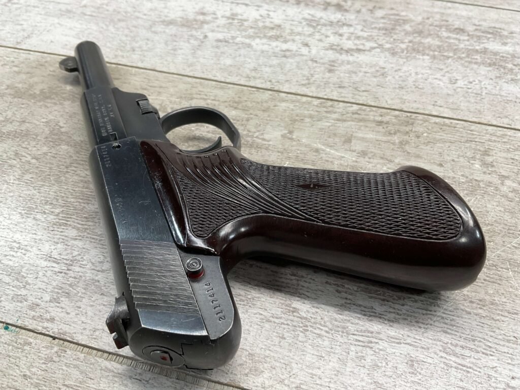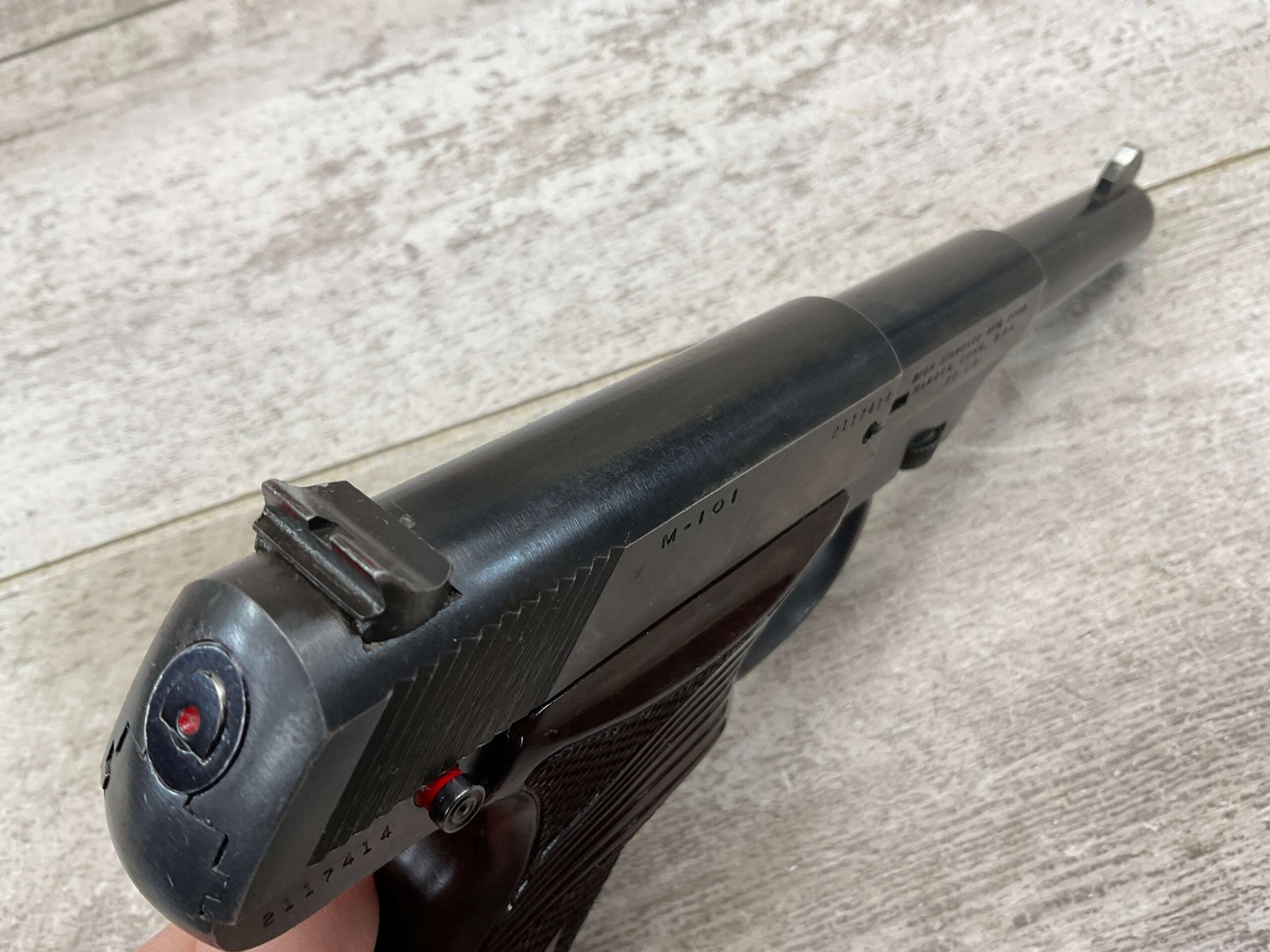 HIGH STANDARD M-101 DURA-MATIC .22LR SEMI AUTO PISTOL, 1969 MFR #2117414, 4 1/2″ BARREL, EXC BRIGHT BORE & RIFLING, GOOD ORIGINAL BLUE W/ HIGH EDGE WEAR & A COUPLE AREAS OF SPECKLING, VG/EXC CHECKERED PLASTIC GRIPS, 1 – 10 ROUND MAGAZINE, VG OVERALL