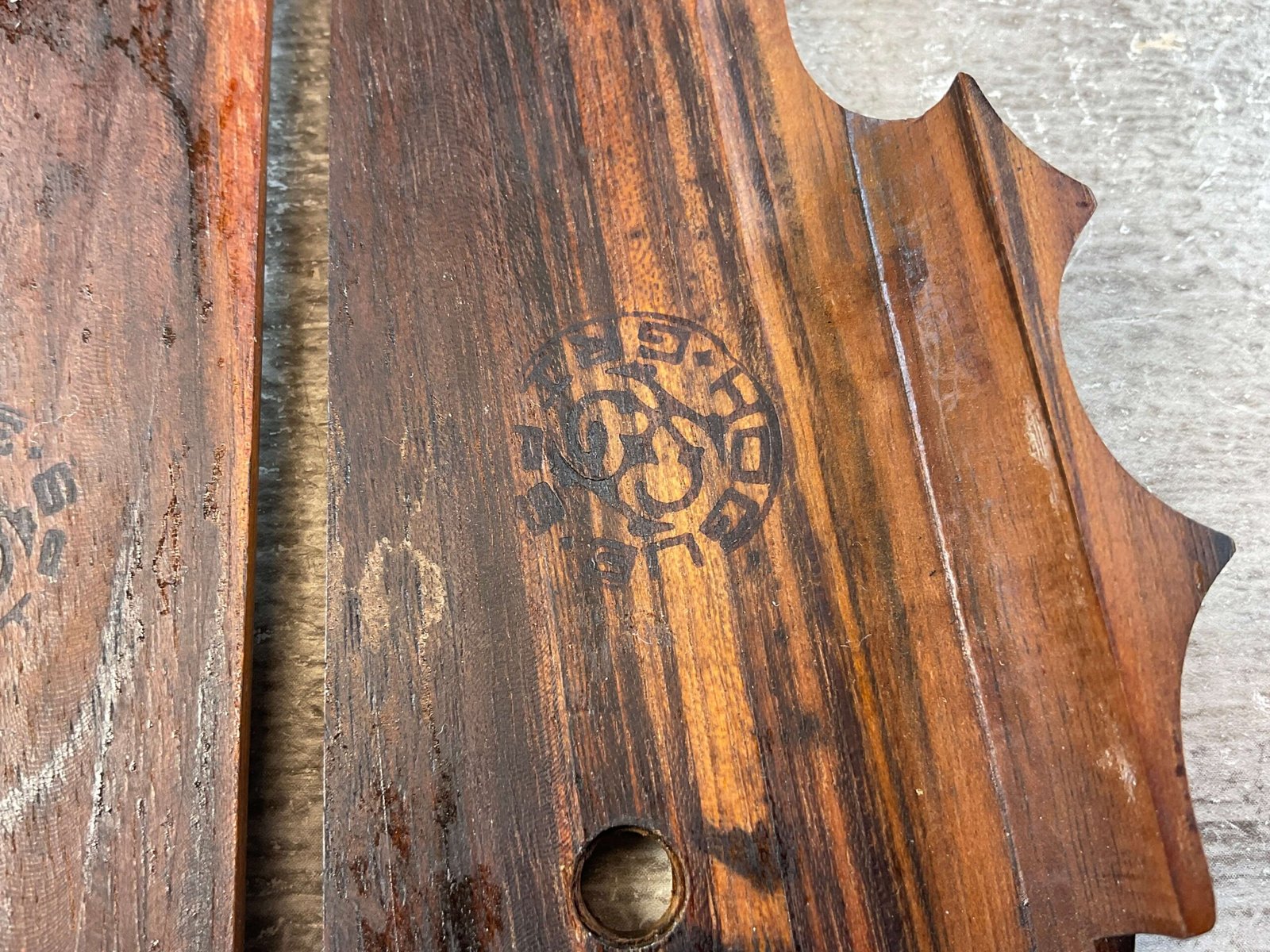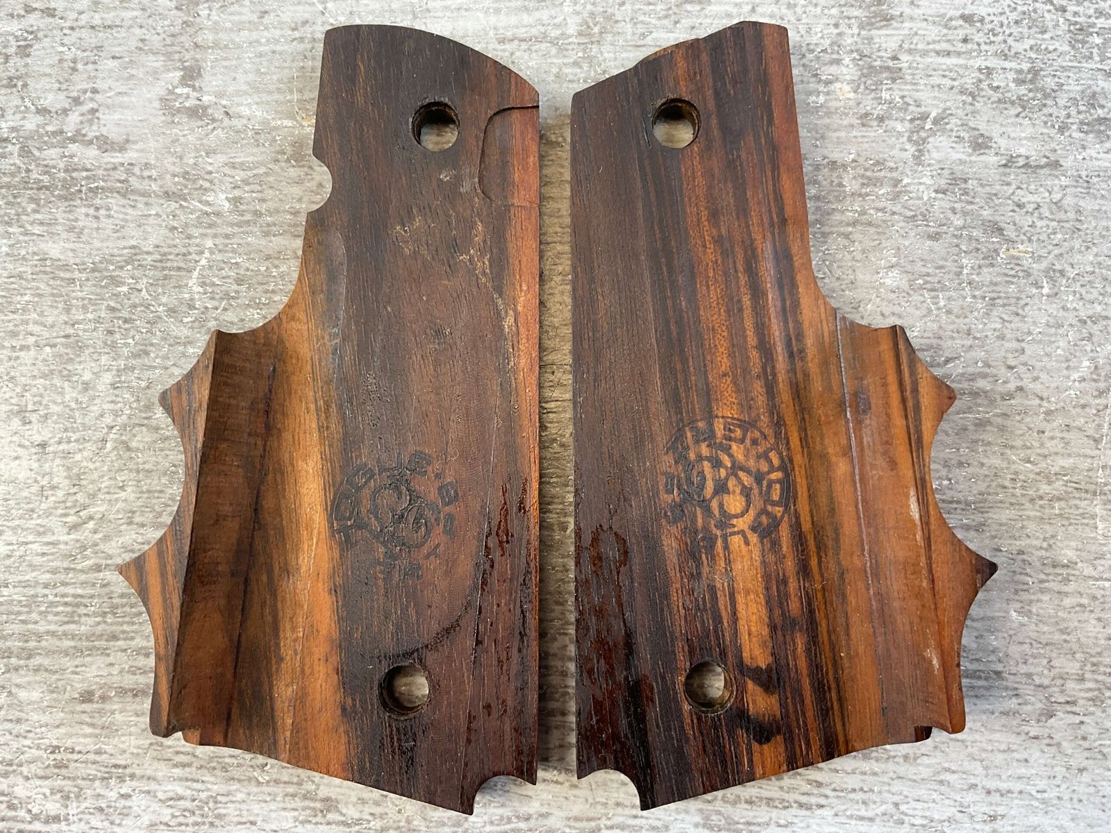 HOGUE 1911 WOOD WRAP AROUND GRIPS W/ FINGER GROOVES, JAMES EARL JONES COLLECTION, IN VG CONDITION W/ HOGUE LOGO STAMPED ON BACKS.