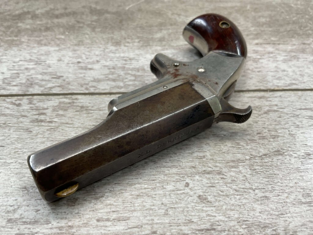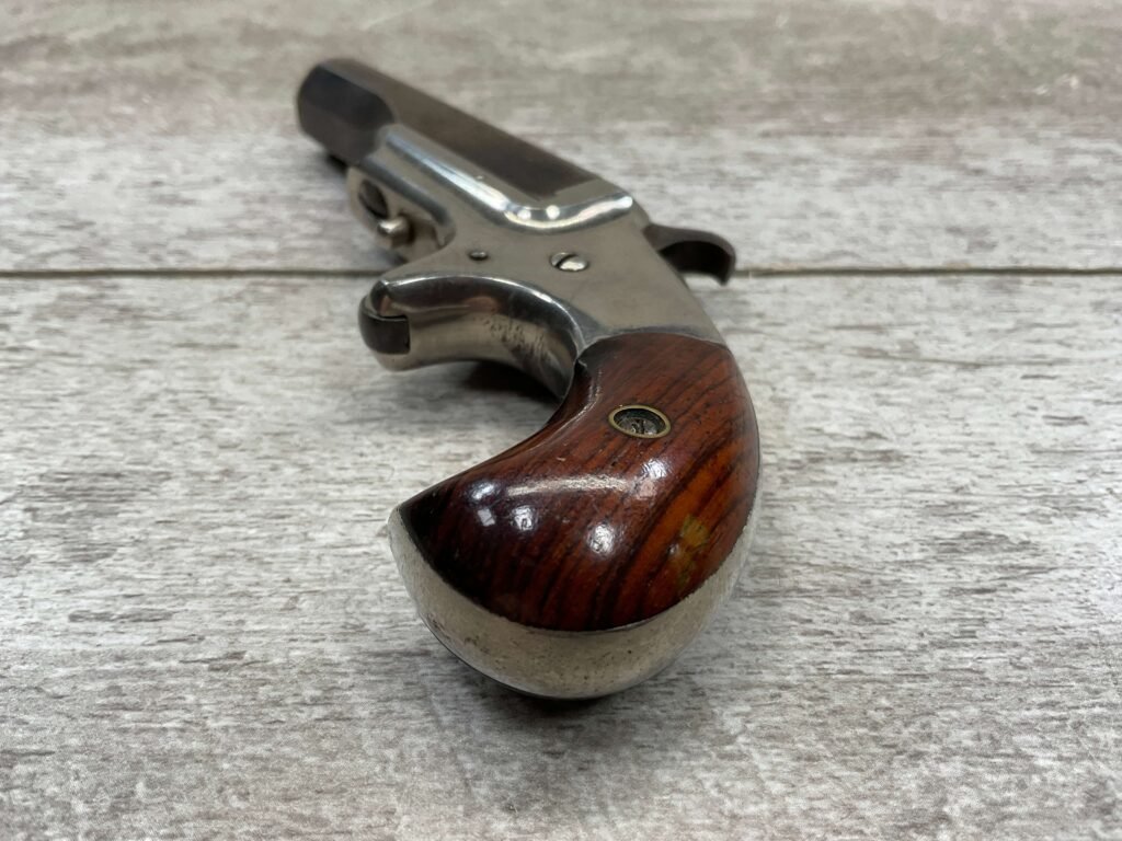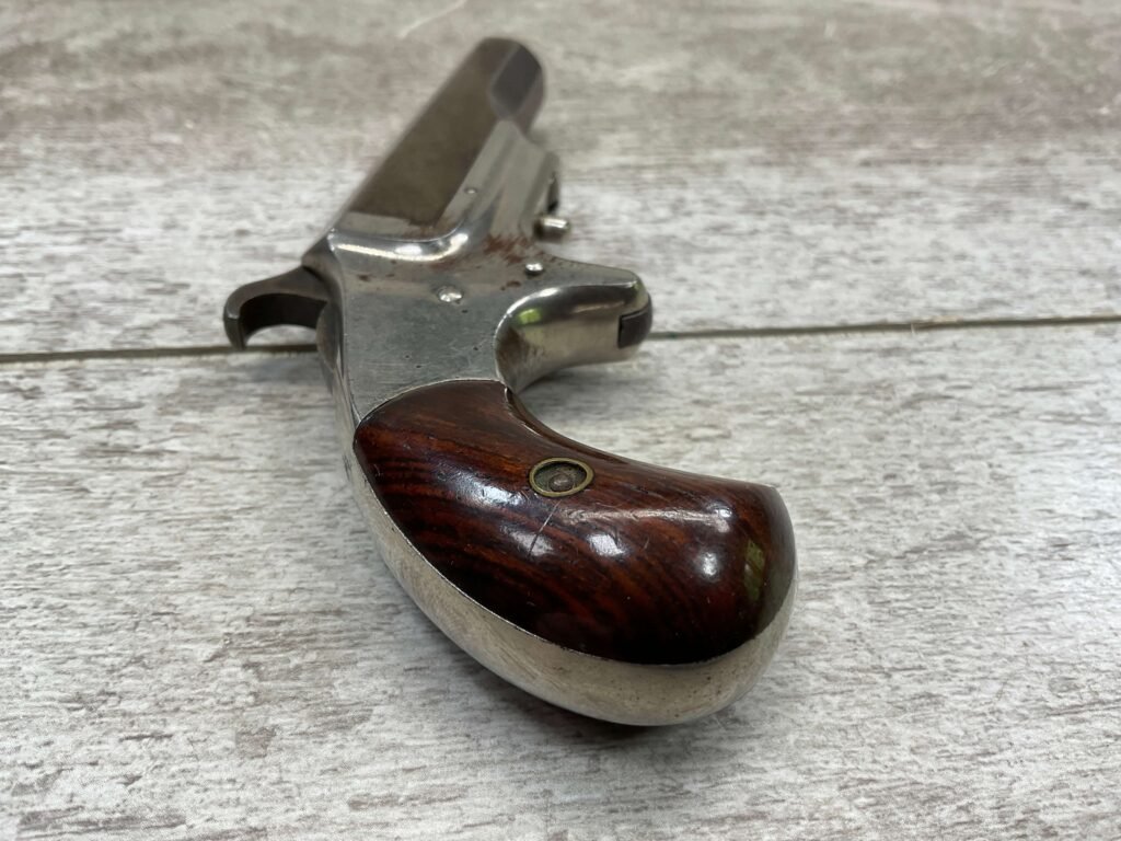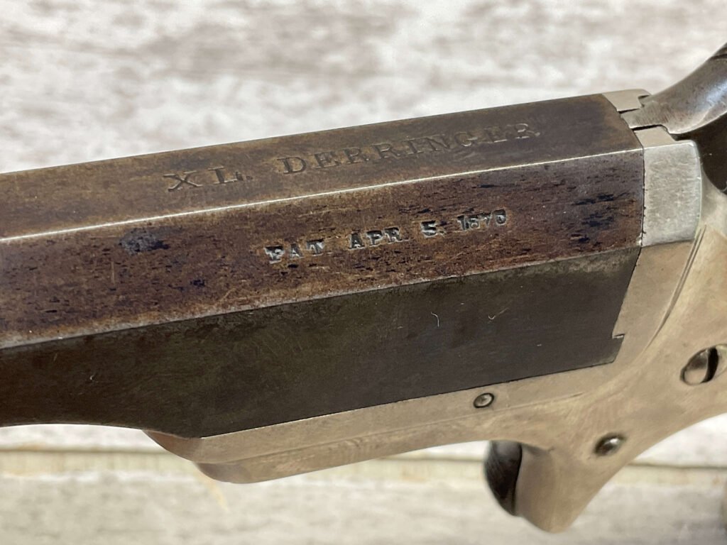 HOPKINS & ALLEN XL .41RF DERRINGER SINGLE SHOT PISTOL, ANTIQUE & RARE #1856, 1870’S, EXC NICKEL FRAME, VG ORIGINAL BLUE BARREL MEASURING 2.5″, EXC BORE & RIFLING, TOP OF BARREL MARKED “XL DERRINGER” & “PAT APR 5 1870”, FIXED FRONT SIGHT, SPUR TRIGGER, PIVOT BARREL W/ WORKING EJECTOR, EXC SMOOTH ROSEWOOD GRIPS (MATCHING), EXCELLENT ACTION, NOT A REPRODUCTION, OVERALL CONDITION AS SEEN IN PHOTOS & VERY NICE!!