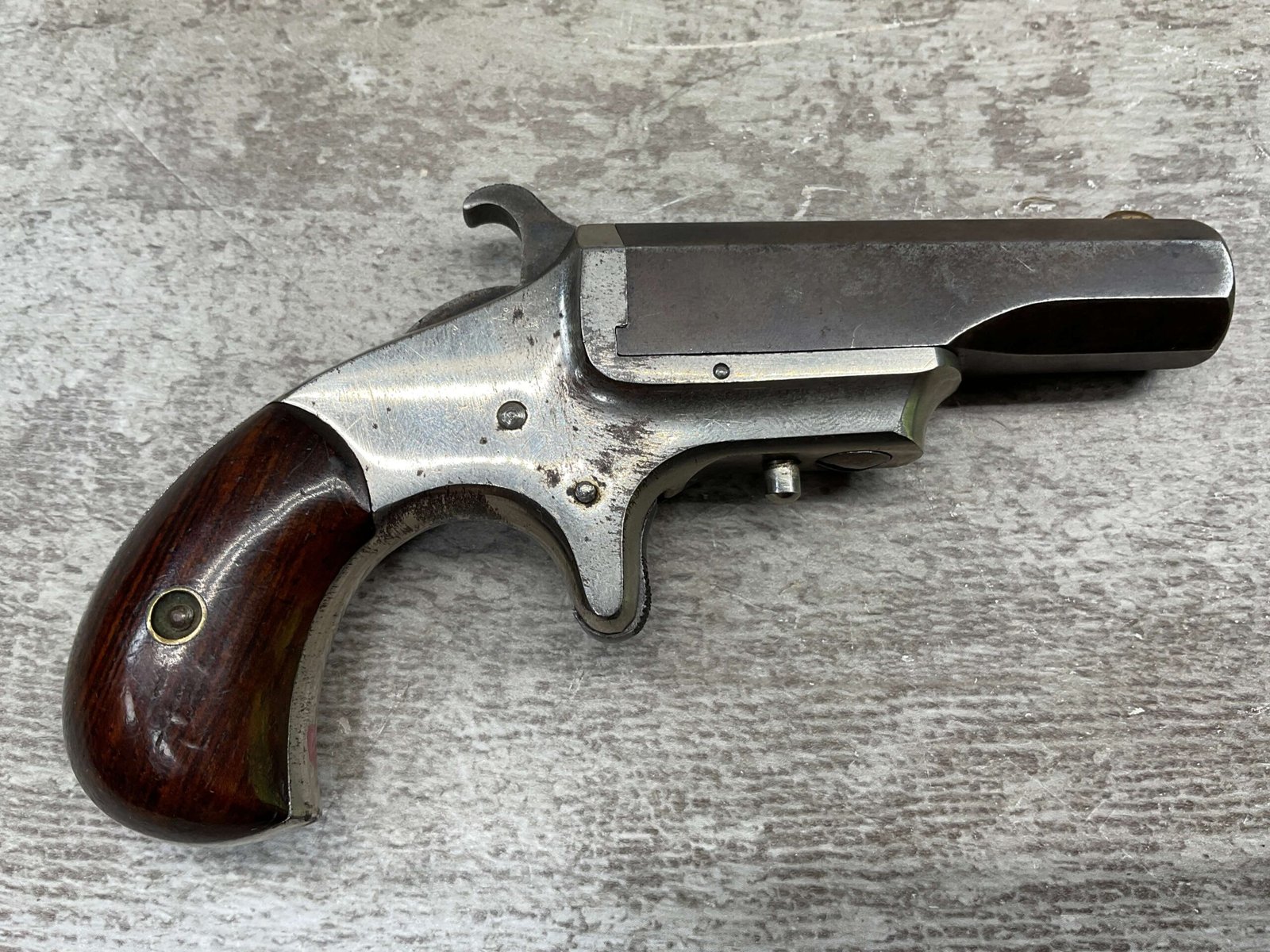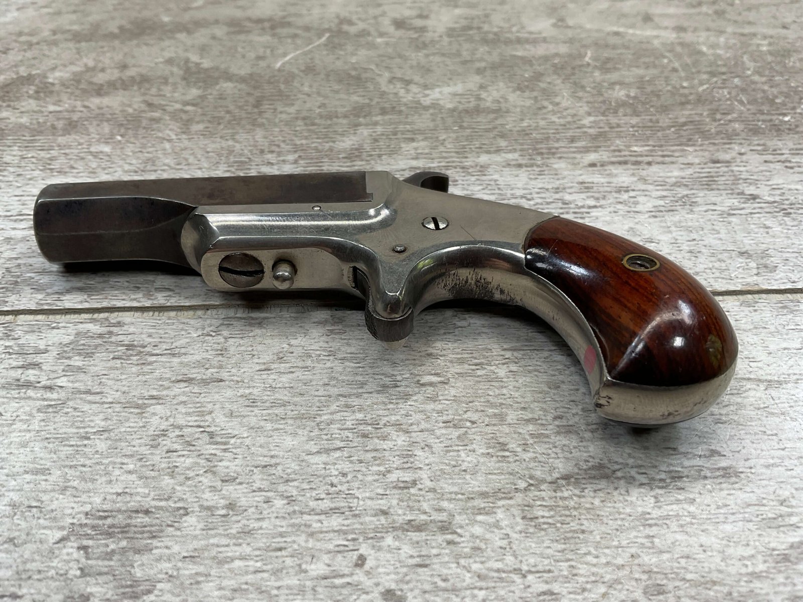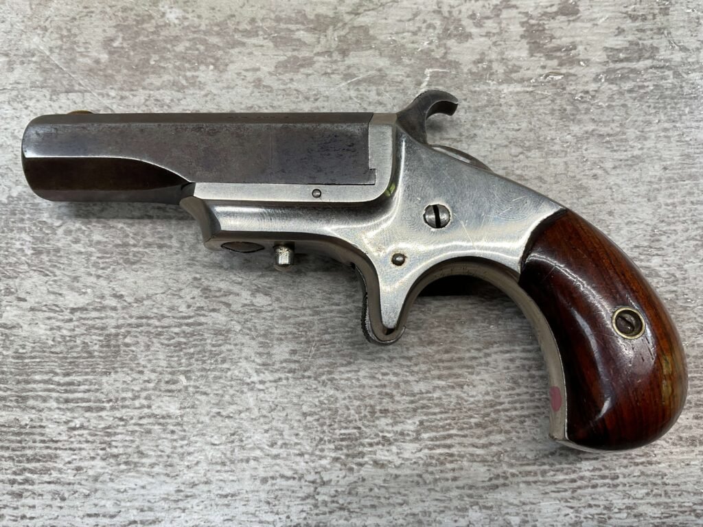HOPKINS & ALLEN XL .41RF DERRINGER SINGLE SHOT PISTOL, ANTIQUE & RARE #1856, 1870’S, EXC NICKEL FRAME, VG ORIGINAL BLUE BARREL MEASURING 2.5″, EXC BORE & RIFLING, TOP OF BARREL MARKED “XL DERRINGER” & “PAT APR 5 1870”, FIXED FRONT SIGHT, SPUR TRIGGER, PIVOT BARREL W/ WORKING EJECTOR, EXC SMOOTH ROSEWOOD GRIPS (MATCHING), EXCELLENT ACTION, NOT A REPRODUCTION, OVERALL CONDITION AS SEEN IN PHOTOS & VERY NICE!!