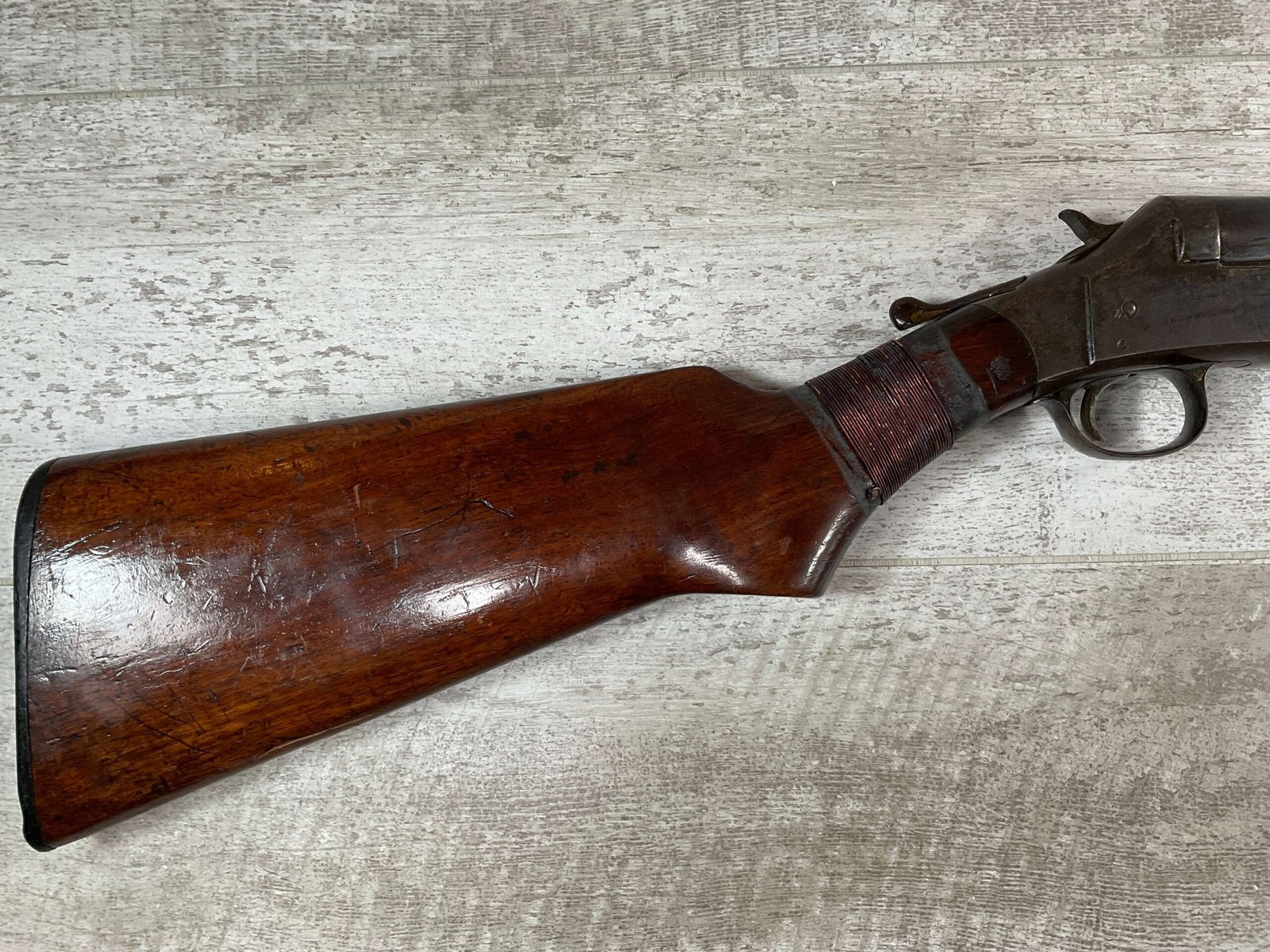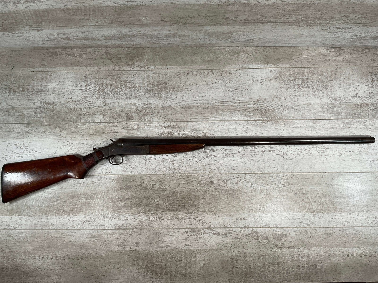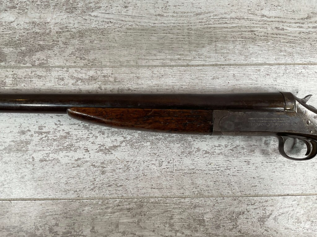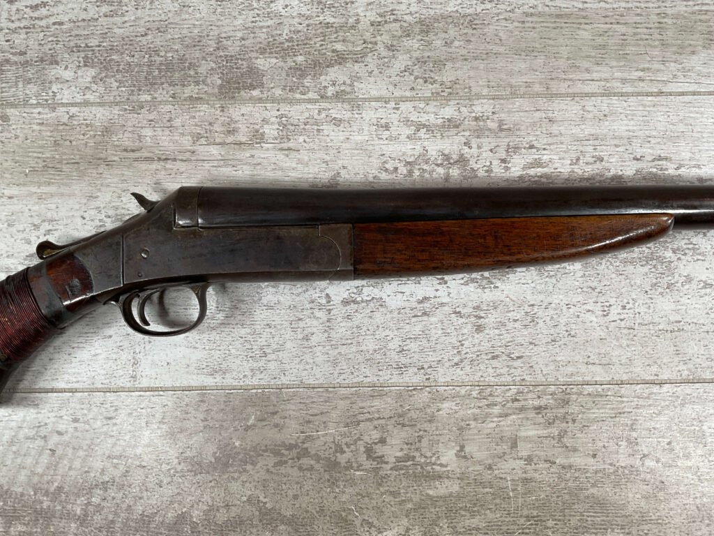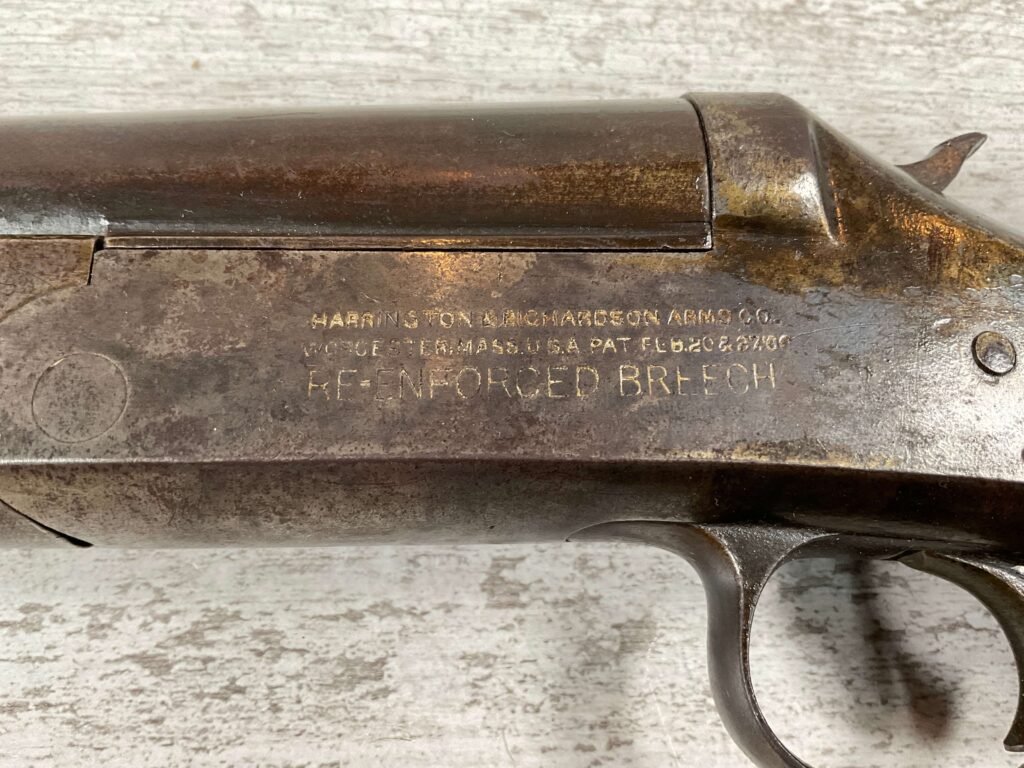 H&R HARRINGTON & RICHARDSON MODEL 1908 12GA SINGLE BARREL SHOTGUN #A 29338, 32″ BBL, OXIDIZED BORE, METAL SURFACES ARE BROWN PATINA, WOOD HAS HEAVY HANDLING MARKS/DENTS/NICKS, ORIGINAL PLASTIC H&R LOGO BUTTPLATE, CRACK ON THE BUTT STOCK NEAR THE PISTOL GRIP (CRUDELY REPAIRED), HAMMER AND ACTION FUNCTIONS, C&R FFL OK