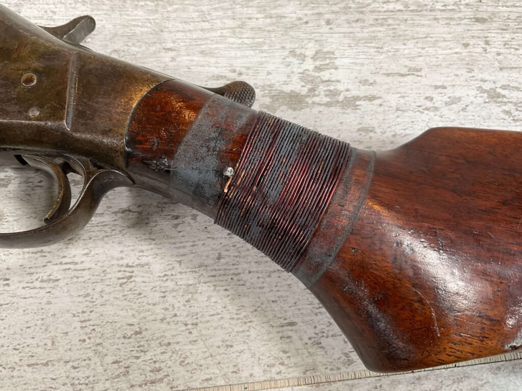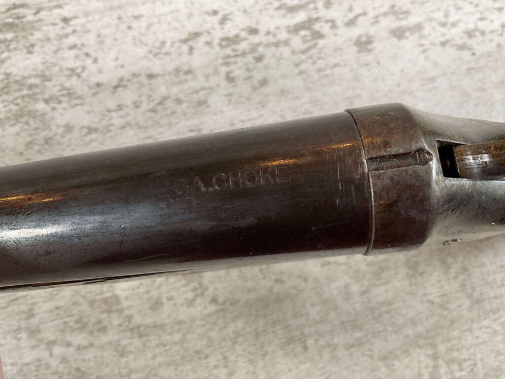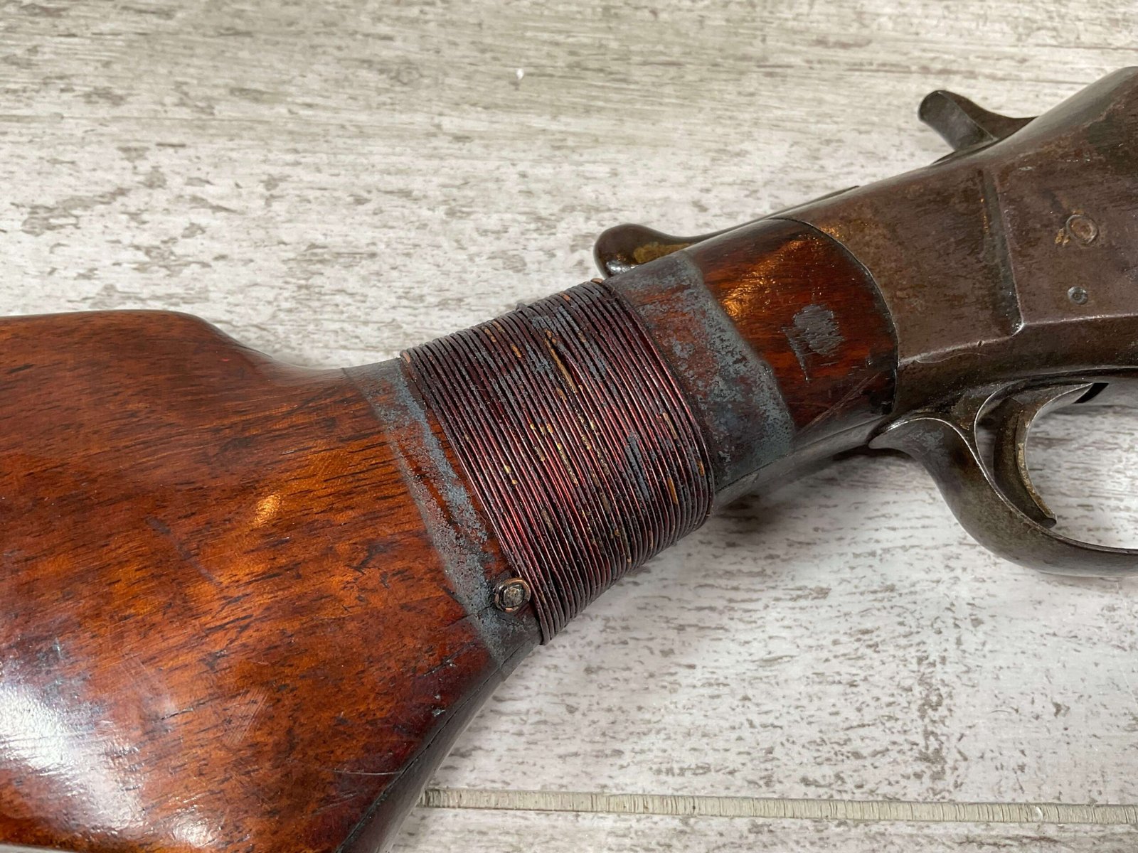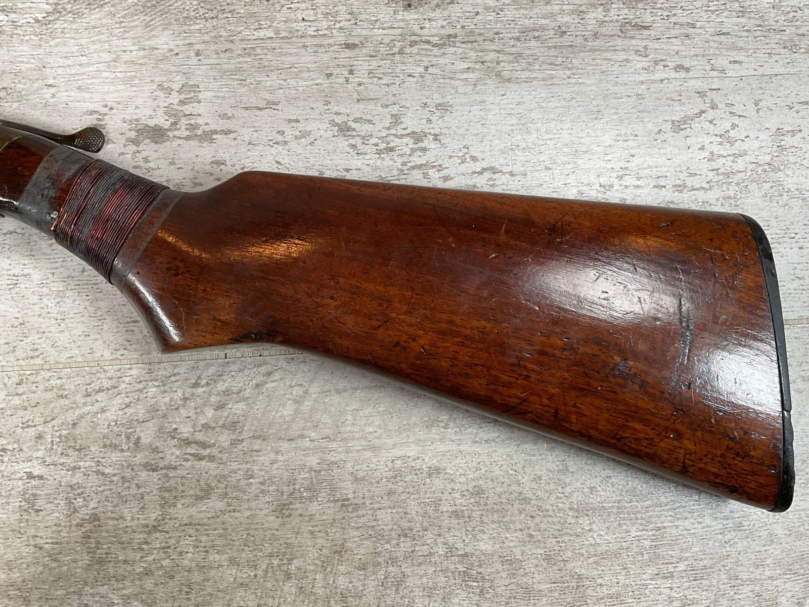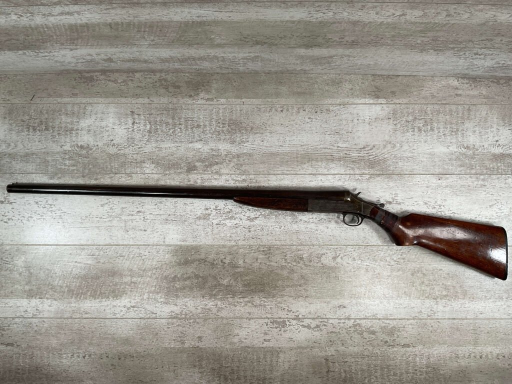 H&R HARRINGTON & RICHARDSON MODEL 1908 12GA SINGLE BARREL SHOTGUN #A 29338, 32″ BBL, OXIDIZED BORE, METAL SURFACES ARE BROWN PATINA, WOOD HAS HEAVY HANDLING MARKS/DENTS/NICKS, ORIGINAL PLASTIC H&R LOGO BUTTPLATE, CRACK ON THE BUTT STOCK NEAR THE PISTOL GRIP (CRUDELY REPAIRED), HAMMER AND ACTION FUNCTIONS, C&R FFL OK