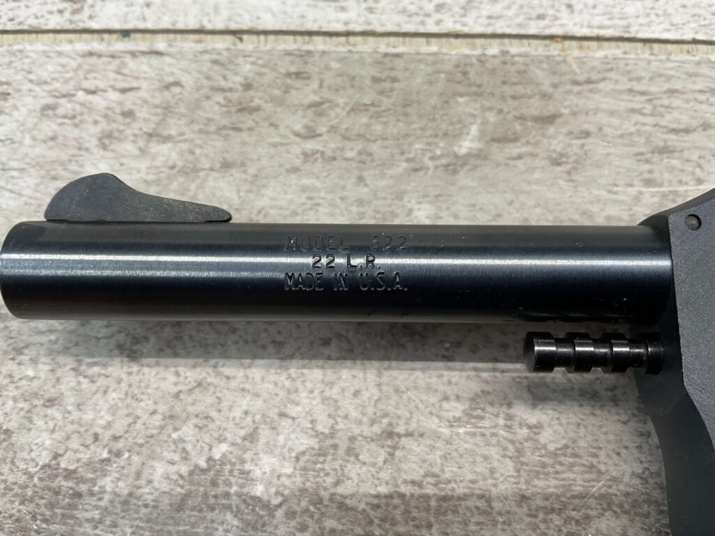 TOP OF BARREL MARKED “MODEL 622” OVER “22 L.R.” OVER “MADE IN U.S.A.”, LEFT SIDE NEAR TRIGGER MARKED “H&R INC. GARDNER, MASS. U.S.A.”, BOTTOM OF HANDLE MARKED “AX196358”, OVERALL EXCELLENT CONDITION 98%+.