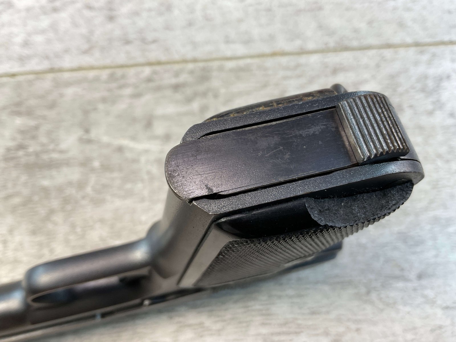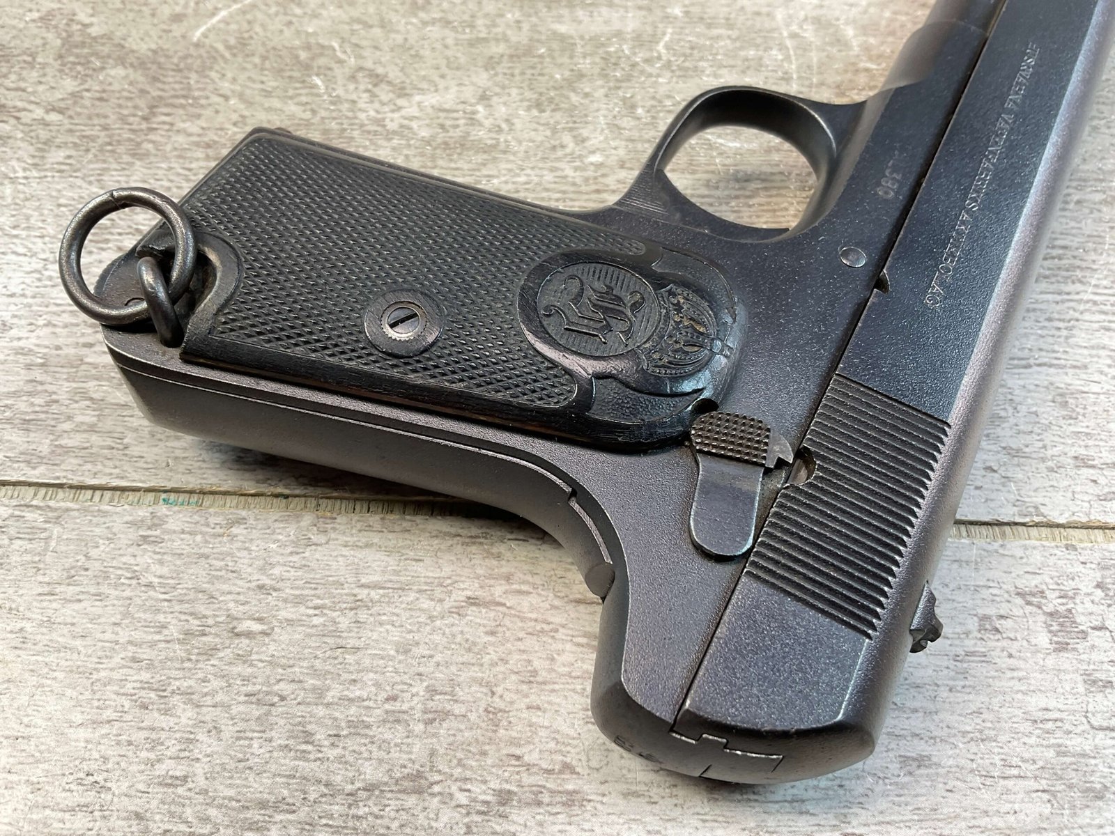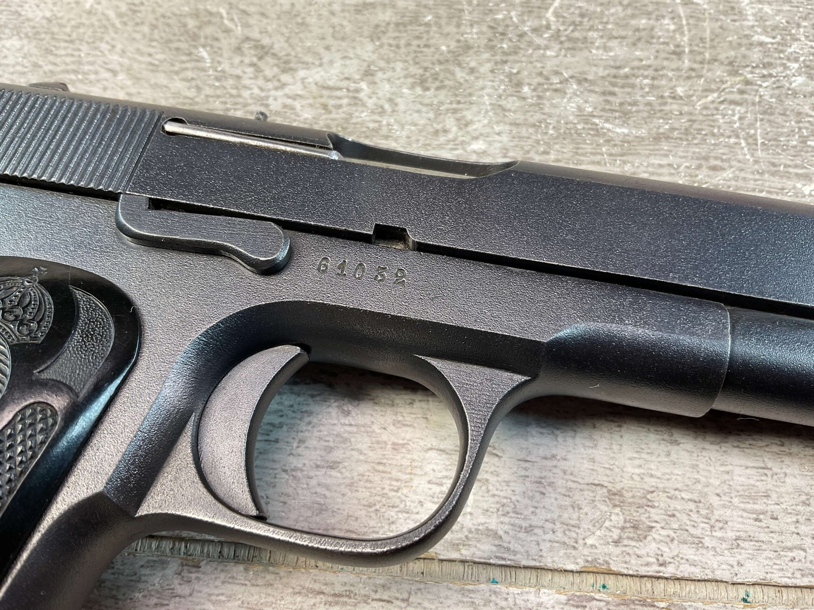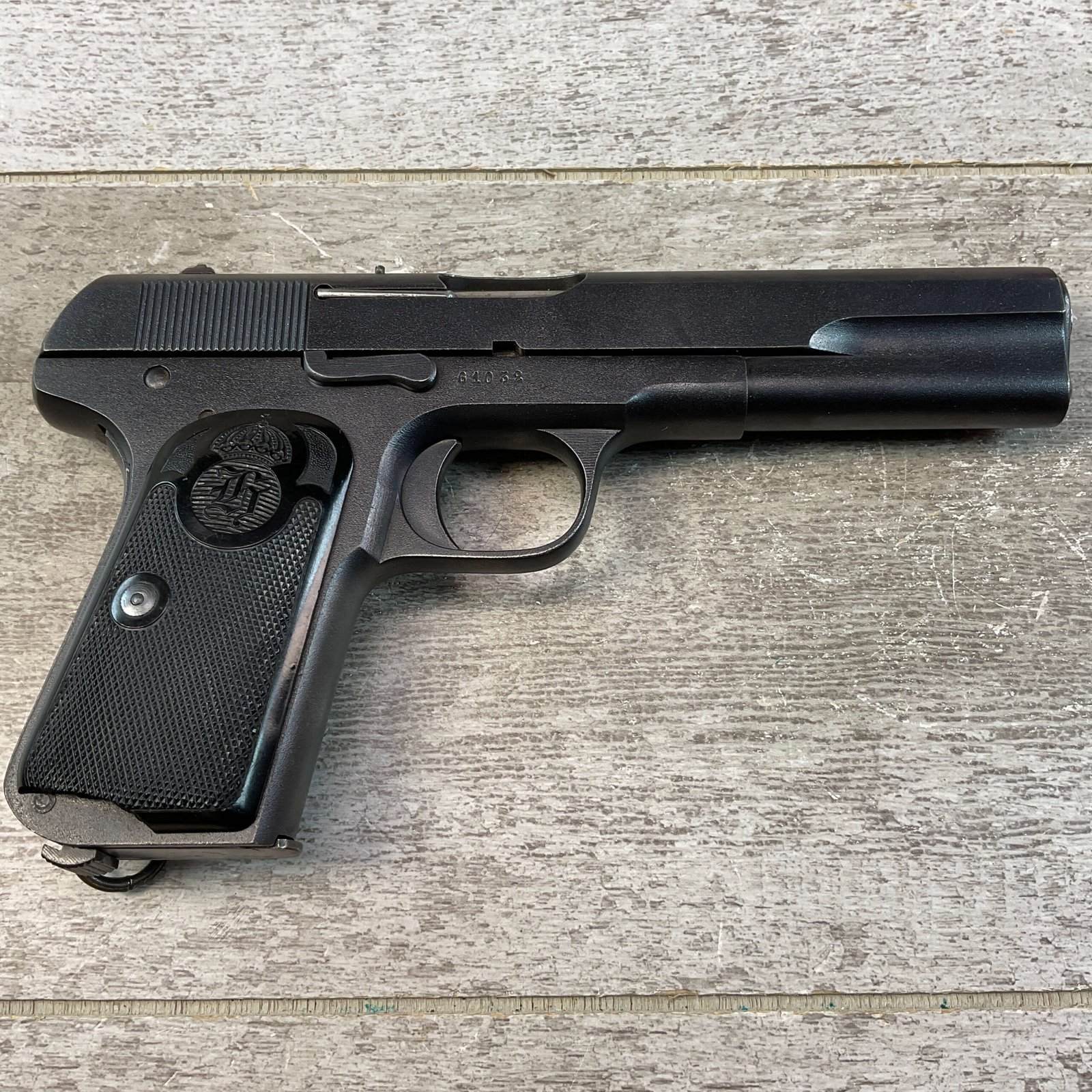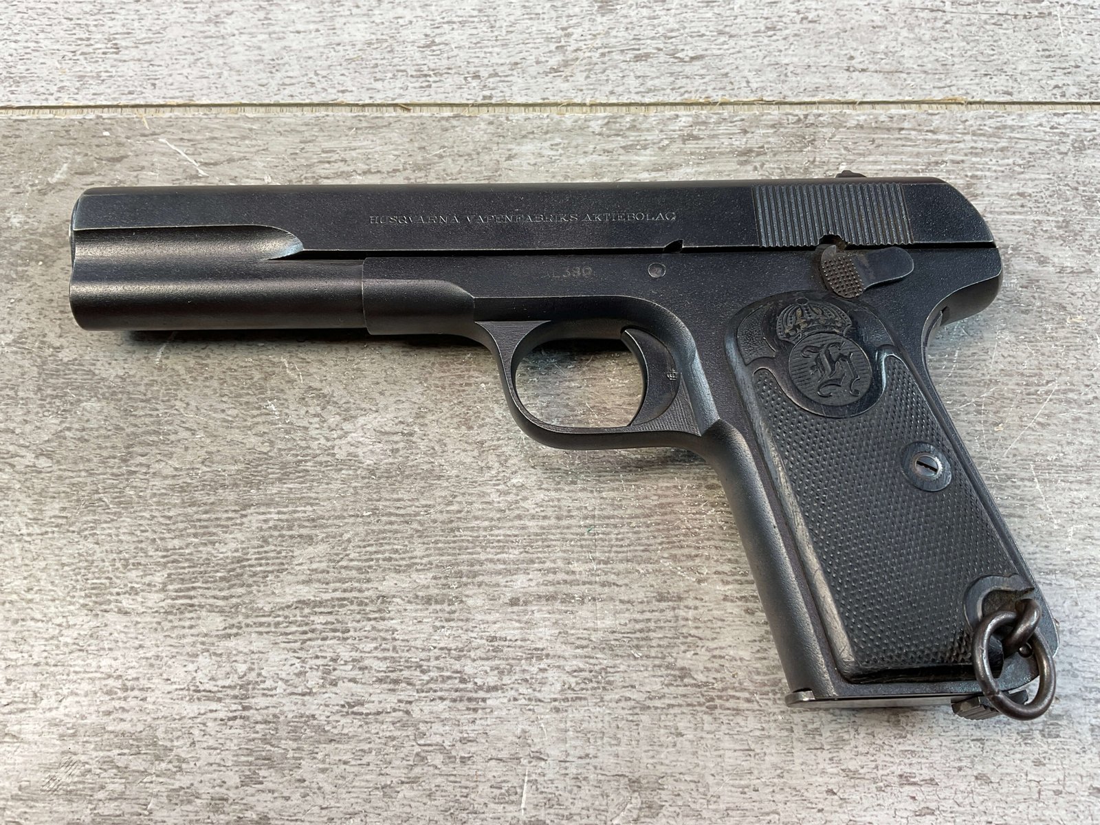 HUSQVARNA 1907 .380 CAL SEMI AUTO PISTOL, JAMES EARL JONES COLLECTION #61032, EXC BORE & RIFLING, EXC FINISH, VG GRIPS W/LIGHT WEAR & SMALL PIECE MISSING ON RIGHT GRIP, CROWN G.B. ON BACK OF FRAME, NO IMPORT MARKS, CONVERTED TO .380 AUTO, VERY NICE! CONDITION AS SHOWN IN PICTURES, FROM THE JAMES EARL JONES “FAVORITES” COLLECTION W/ CERTIFICATE OF AUTHENTICITY.