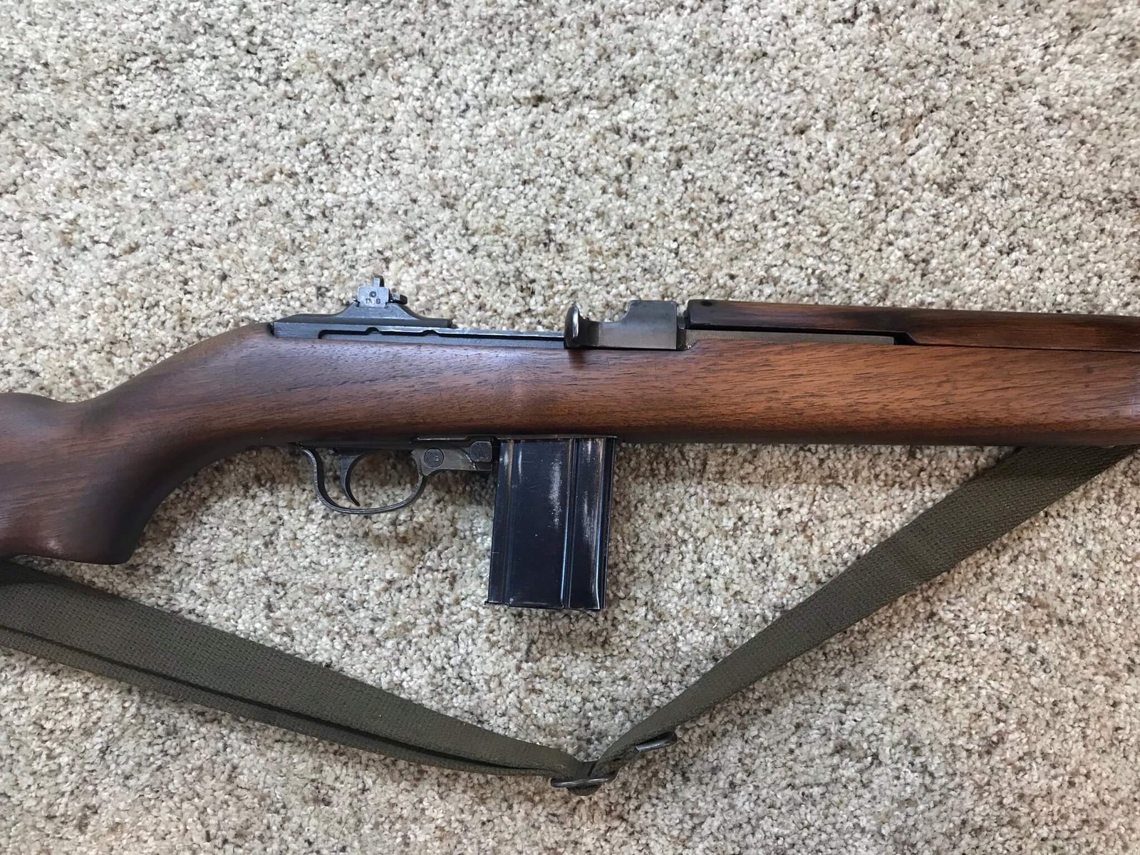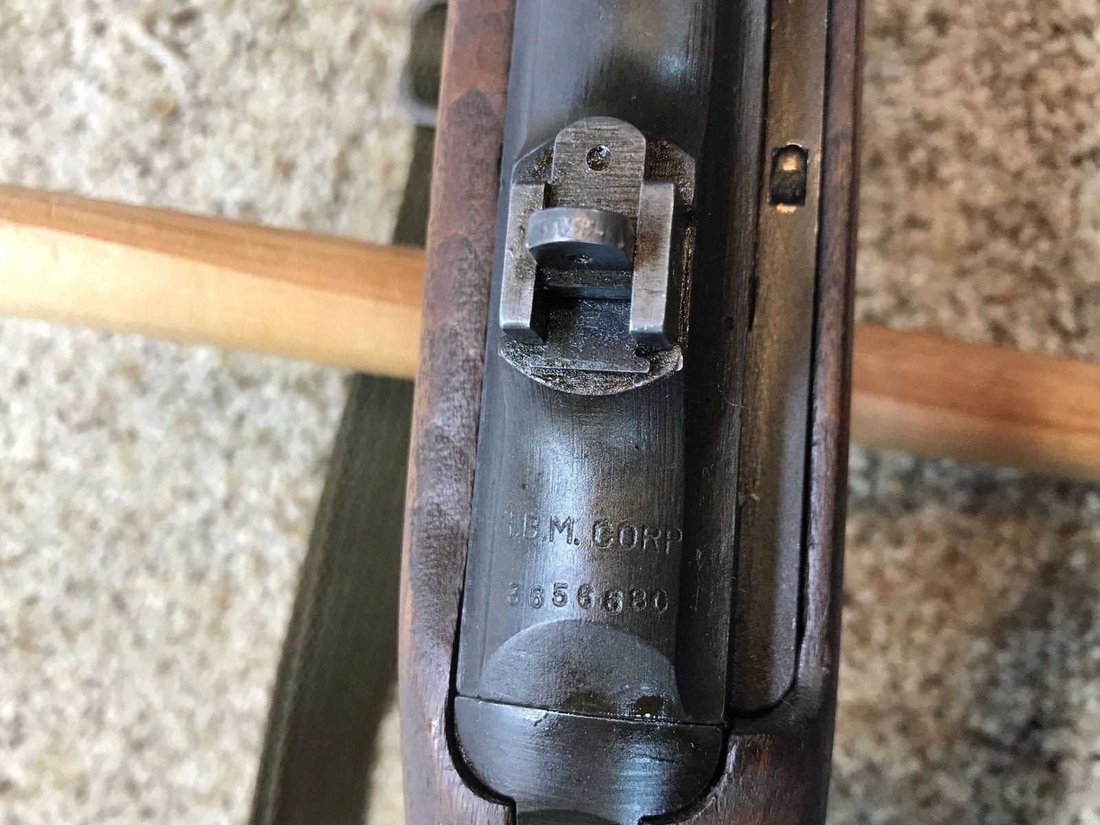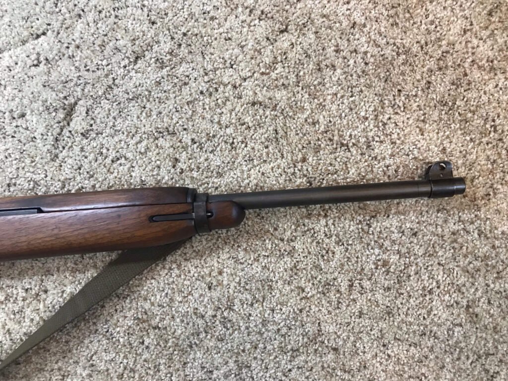 IBM M1 .30 CARBINE TYPE II SEMI AUTO RIFLE, AUG 1943 #3656680, ADJ. TYPE I FLIP REAR SITE MARKED “S”, FABRICATED FRONT SIGHT MARKED “PO B”, FLAT BOLT, TWO RIVOT HAND GUARD, I-CUT HIGH WOOD STOCK, W-CROSSED CANNON PROOFED, IBM BARREL DATED “8-43” WITH “FIRE BOMB” BELOW, NO BAYO-LUG, SLING WELL MARKED “RMC-B”, W/OLIVE DRAB SLING & OILER, EXC BRIGHT BORE, ME-1+, 98%