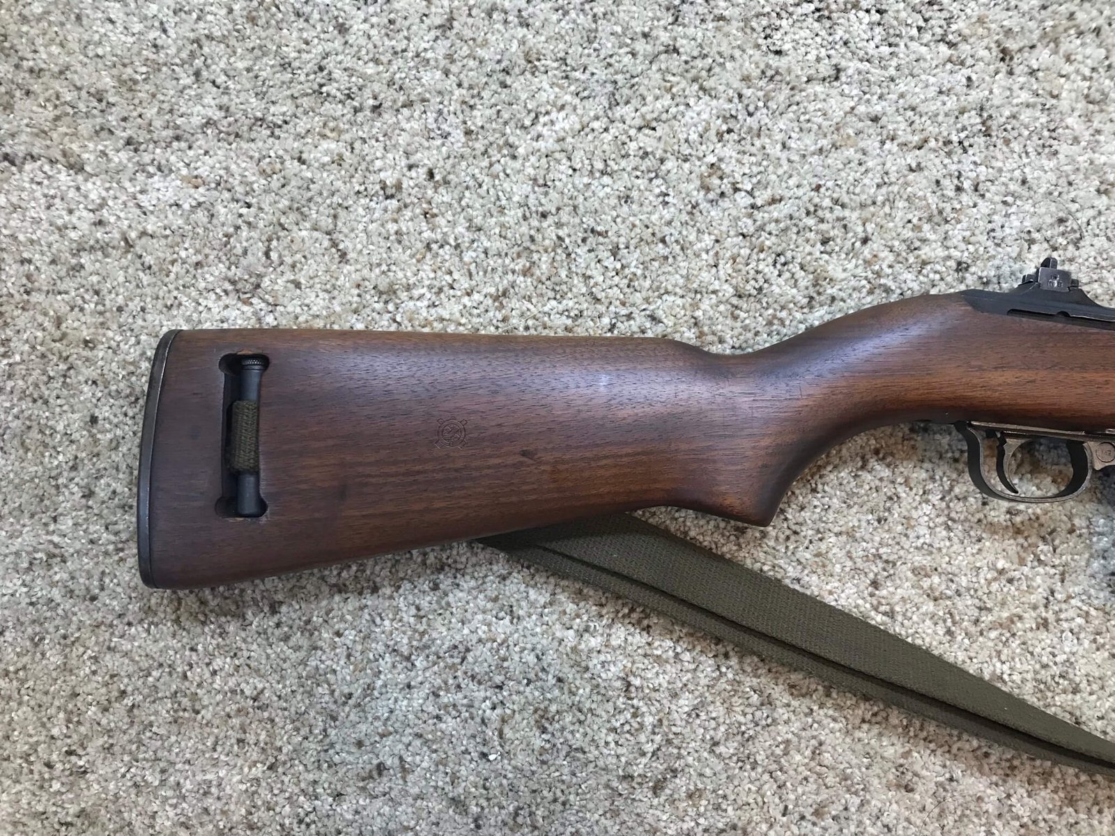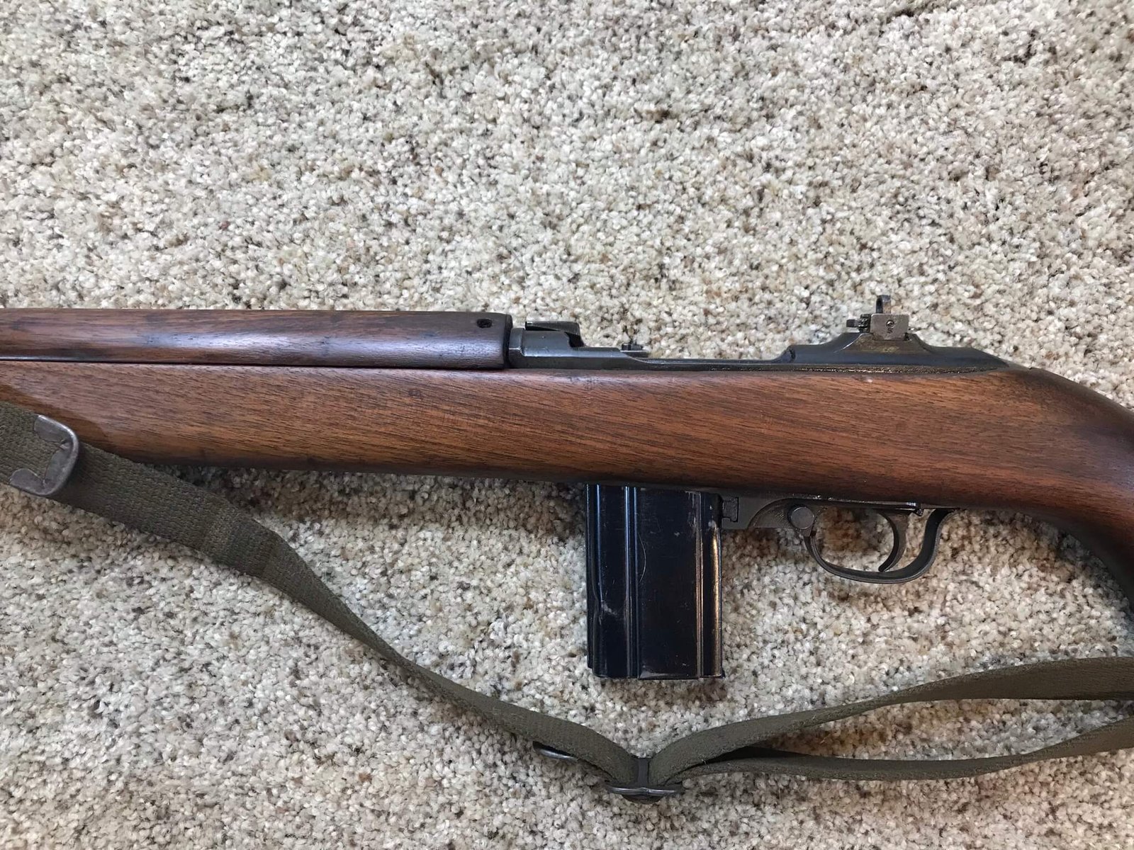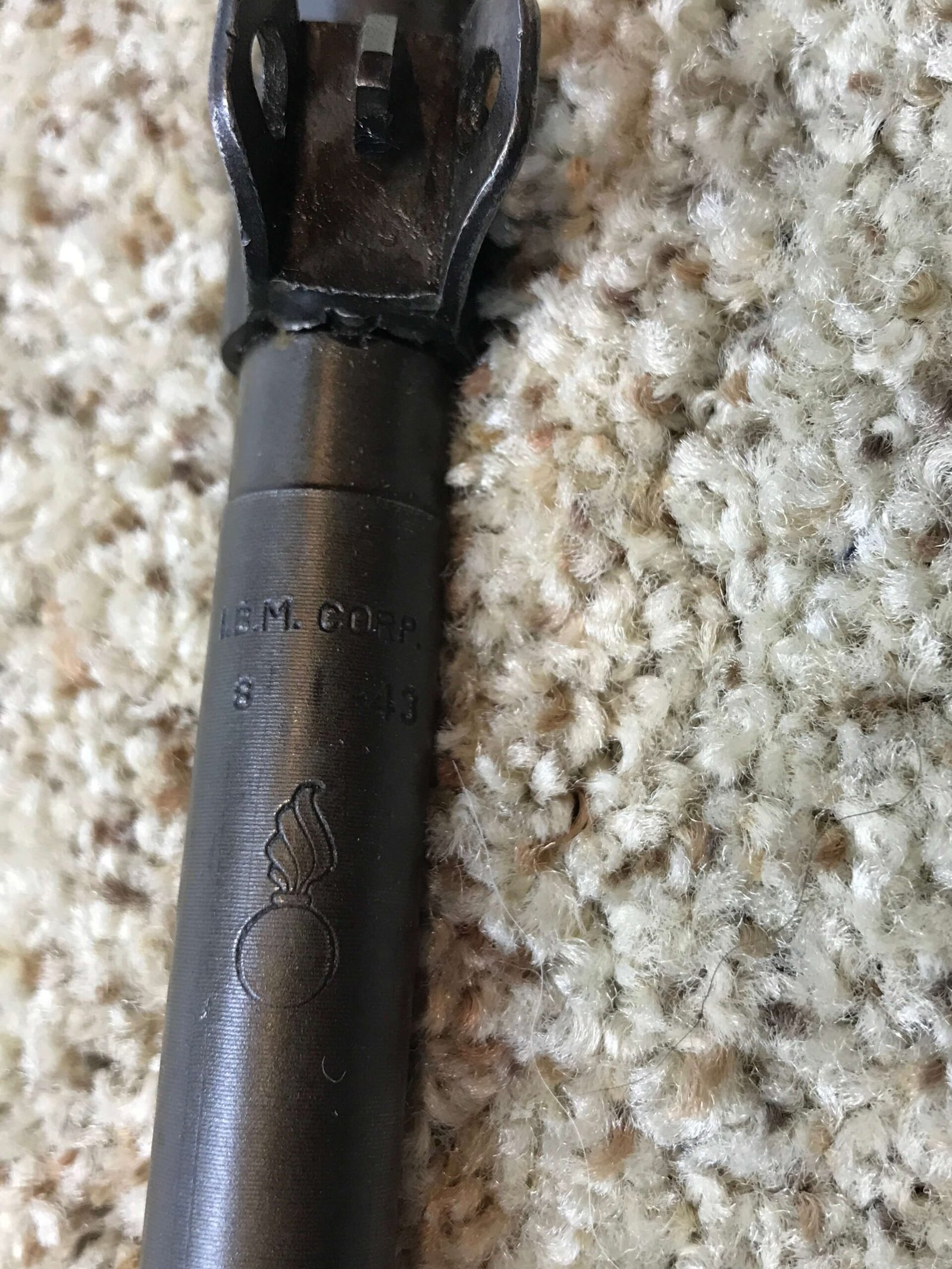 IBM M1 .30 CARBINE TYPE II SEMI AUTO RIFLE, AUG 1943 #3656680, ADJ. TYPE I FLIP REAR SITE MARKED “S”, FABRICATED FRONT SIGHT MARKED “PO B”, FLAT BOLT, TWO RIVOT HAND GUARD, I-CUT HIGH WOOD STOCK, W-CROSSED CANNON PROOFED, IBM BARREL DATED “8-43” WITH “FIRE BOMB” BELOW, NO BAYO-LUG, SLING WELL MARKED “RMC-B”, W/OLIVE DRAB SLING & OILER, EXC BRIGHT BORE, ME-1+, 98%