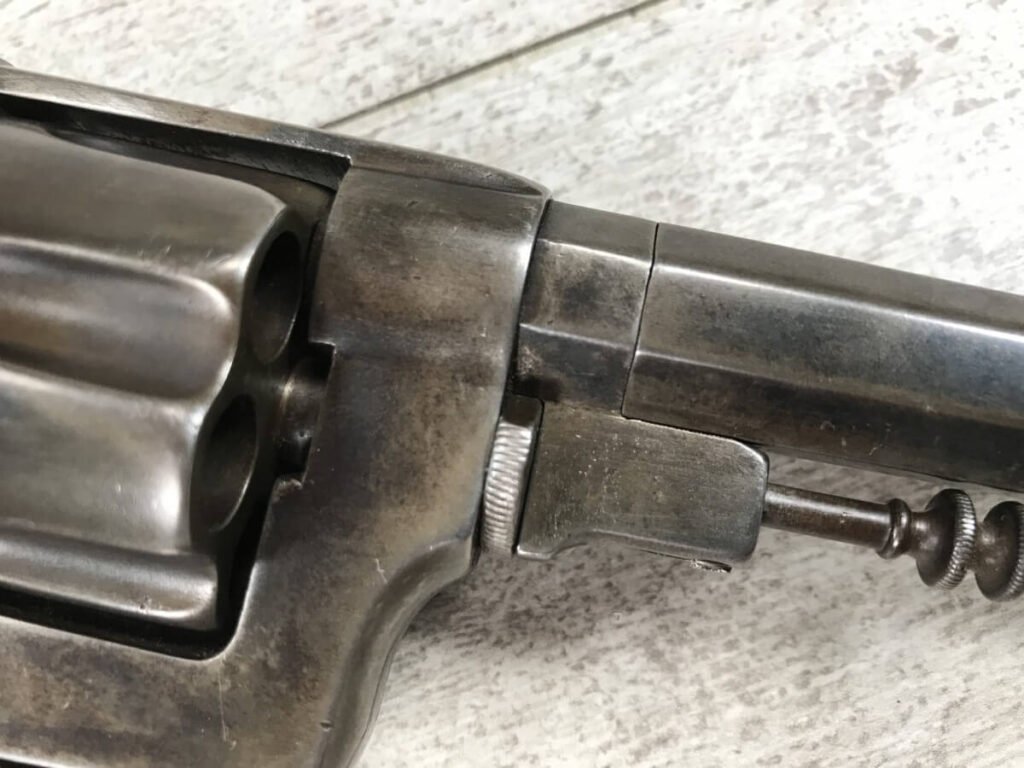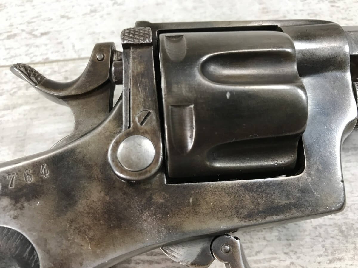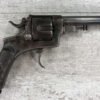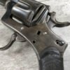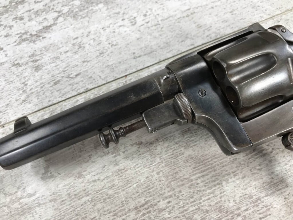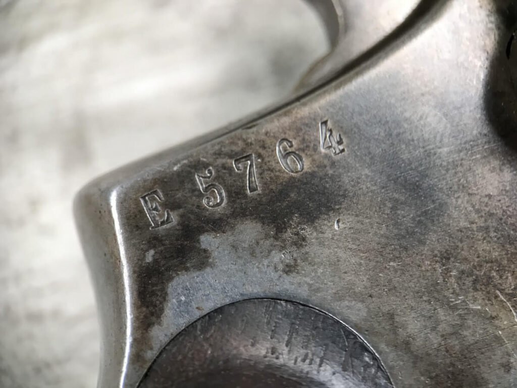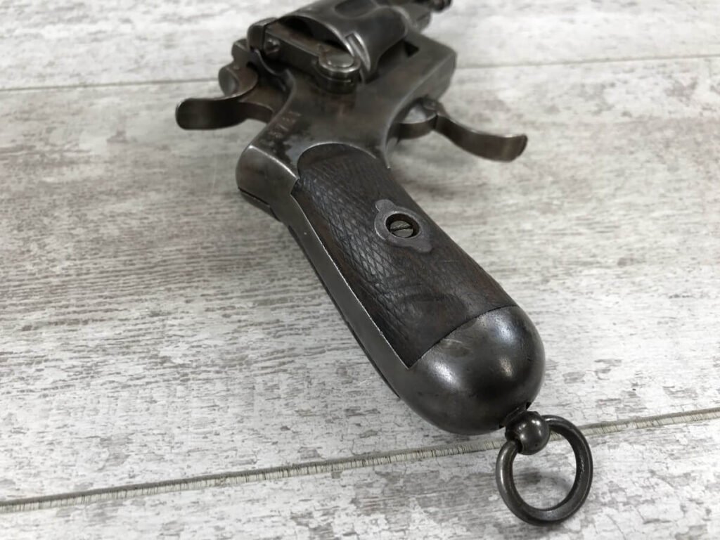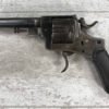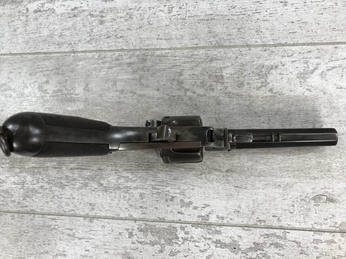 SKU#184 ITALIAN BODEO M1889 REVOLVER #E5765 1927 MFR APPROX, 4.5″ OCTAGON BARREL, 10.4MM CALIBER, FOLDING TRIGGER, FIXED IRON FRONT SIGHT, PLUM PATINA THROUGHOUT, GRIPS WORN BUT IN GOOD CONDITION W/LANYARD RING BELOW, FROSTED BORE, FACTORY CUTOUT BELOW HAMMER (UNSURE WHAT THIS WAS FOR?), GREAT PIECE!!