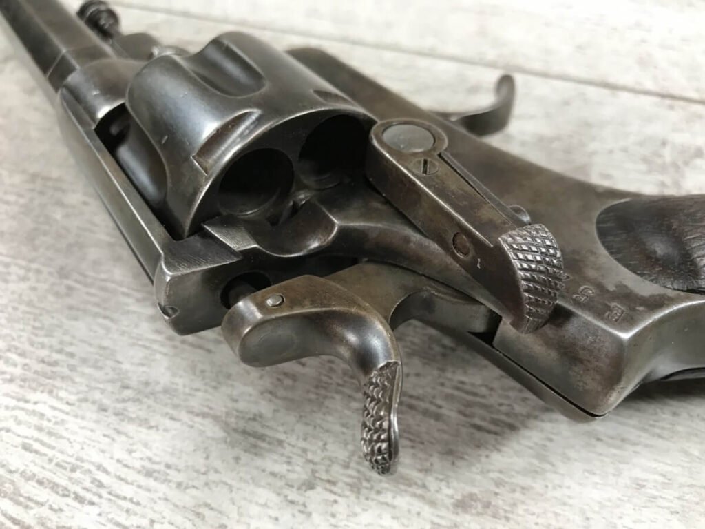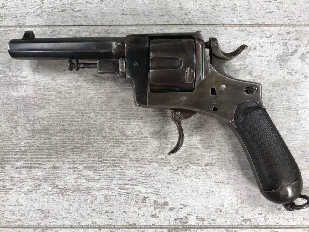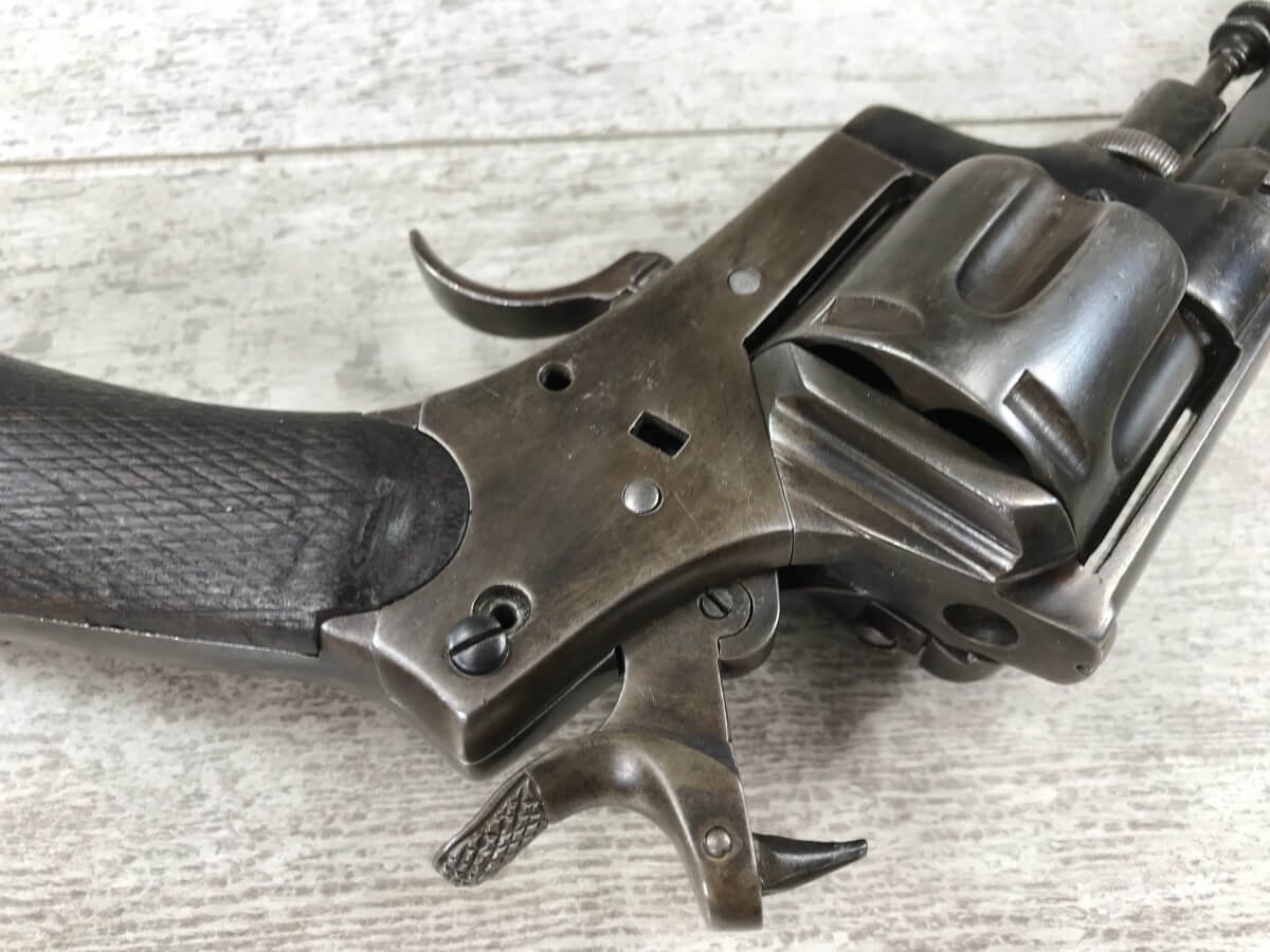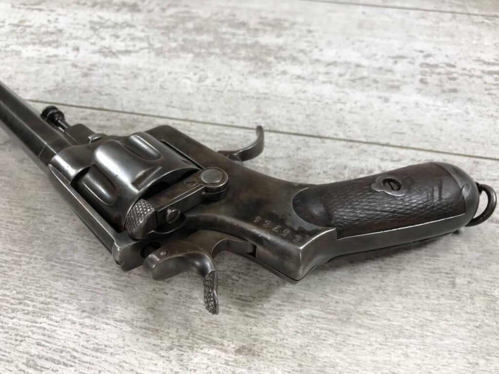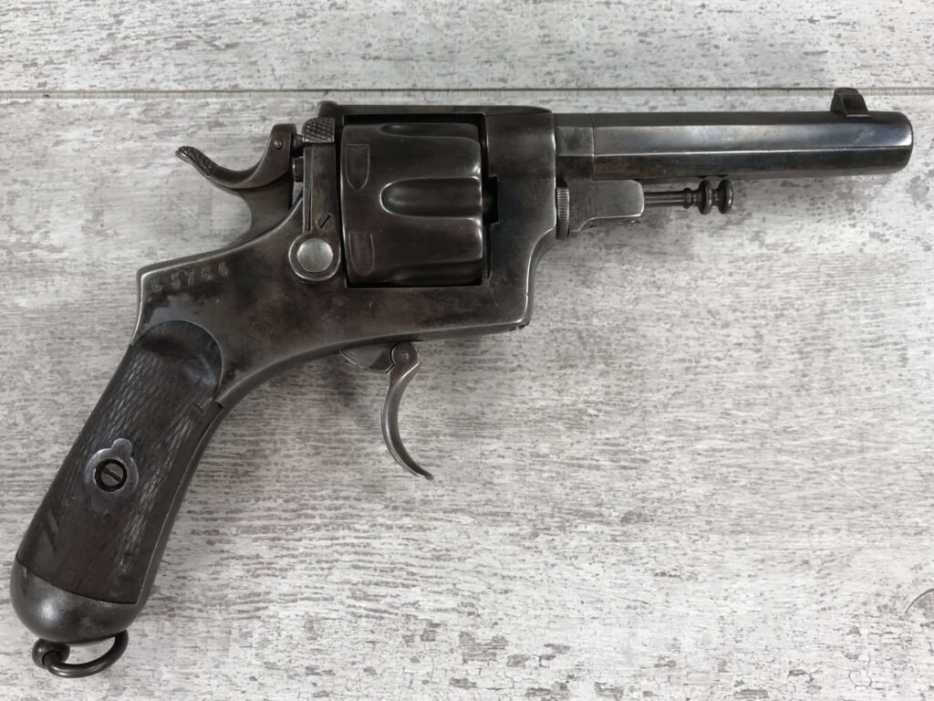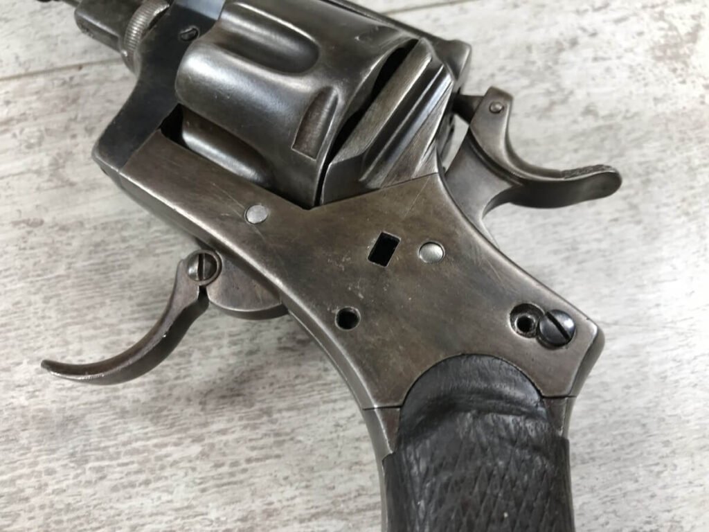 SKU#184 ITALIAN BODEO M1889 REVOLVER #E5765 1927 MFR APPROX, 4.5″ OCTAGON BARREL, 10.4MM CALIBER, FOLDING TRIGGER, FIXED IRON FRONT SIGHT, PLUM PATINA THROUGHOUT, GRIPS WORN BUT IN GOOD CONDITION W/LANYARD RING BELOW, FROSTED BORE, FACTORY CUTOUT BELOW HAMMER (UNSURE WHAT THIS WAS FOR?), GREAT PIECE!!