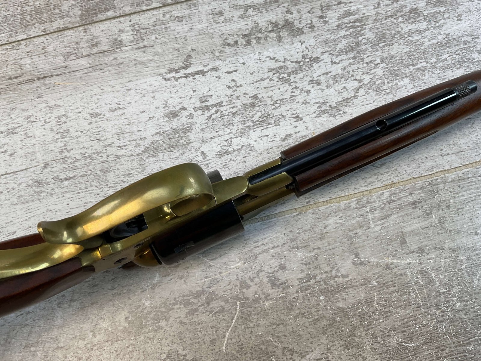 ITALIAN TEXAS CARBINE .22LR REVOLVING RIFLE (1858 REMINGTON), JAMES EARL JONES “FAVORITES” COLLECTION #2969, 21″ BLUED OCTAGON BARREL, EXC BORE & RIFLING, ADJ REAR SIGHTS, BLADE FRONT, BRASS FRAME, TRIGGER GUARD & BUTTPLATE, EXC SMOOTH WALNUT STOCK & FOREARM W/ GROOVE FOR SHELL EXTRACTOR, 6 SHOT CYLINDER, CONDITION AS SHOWN IN PICTURES, FROM THE JAMES EARL JONES “FAVORITES” COLLECTION W/ CERTIFICATE OF AUTHENTICITY.