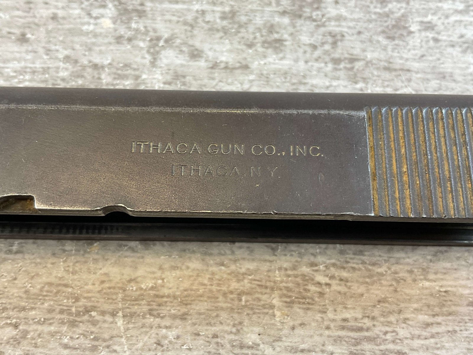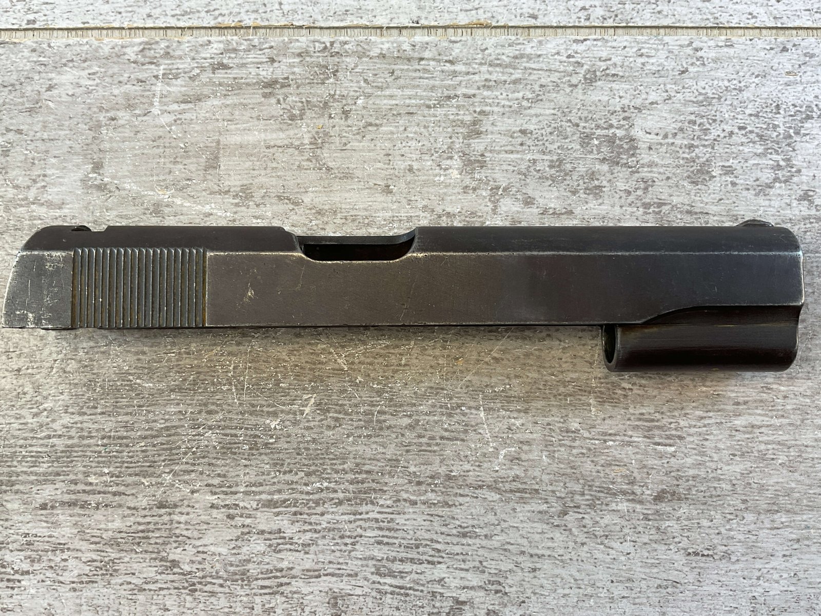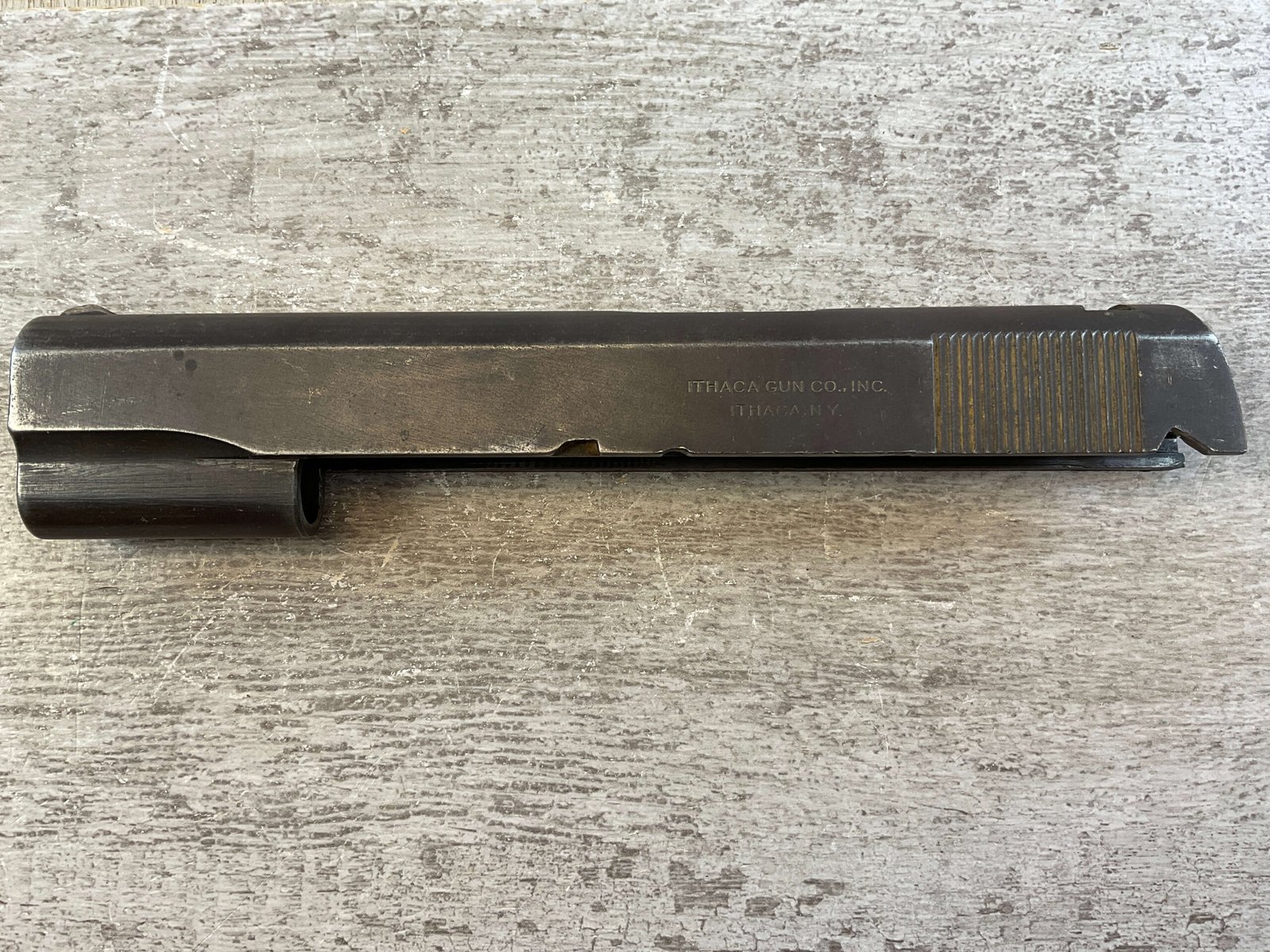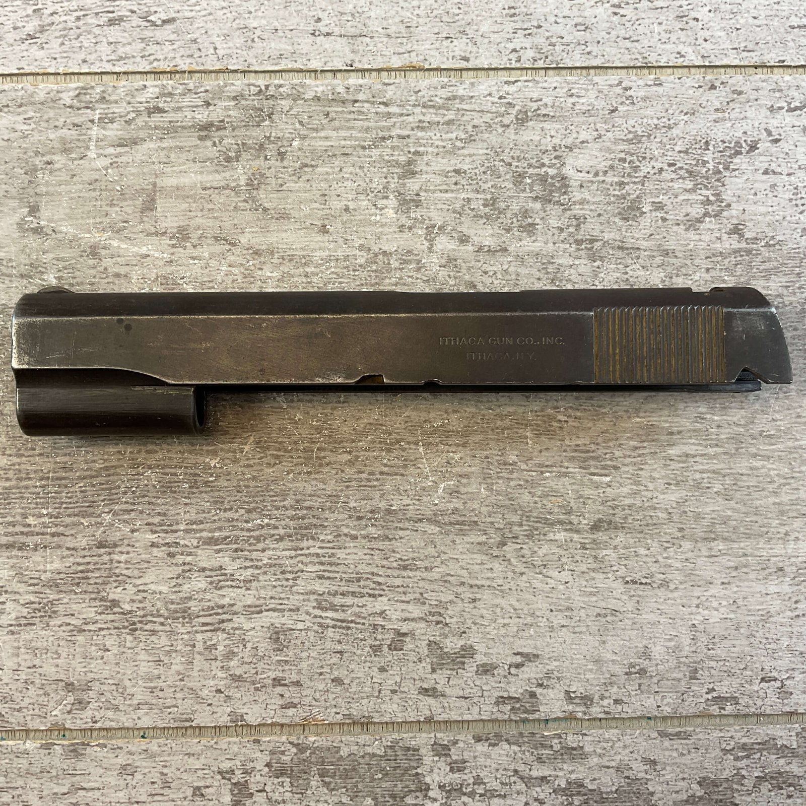 ITHACA PARKERIZED 1911 WWII SLIDE ONLY, NO FIRING PIN, FRONT SIGHT ONLY, WW2, HIGH EDGE WEAR, OVERALL CONDITION AS SEEN IN PHOTOS.