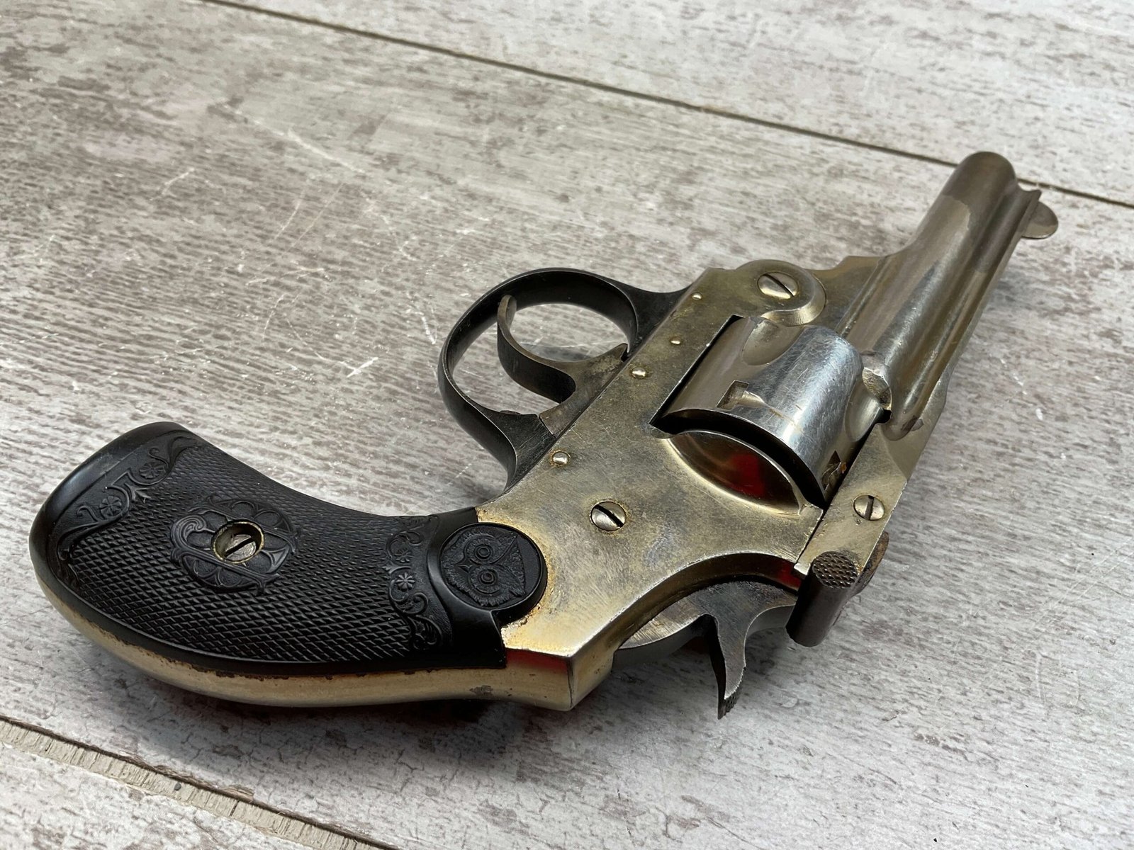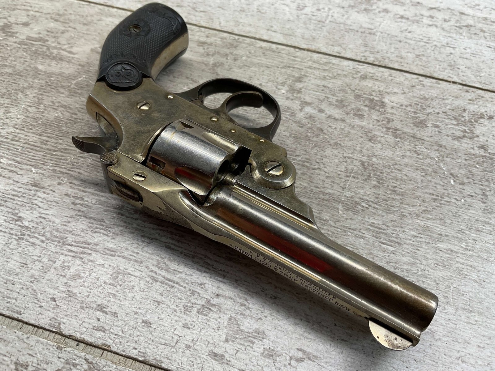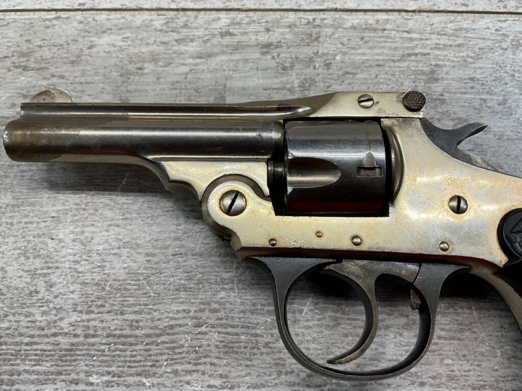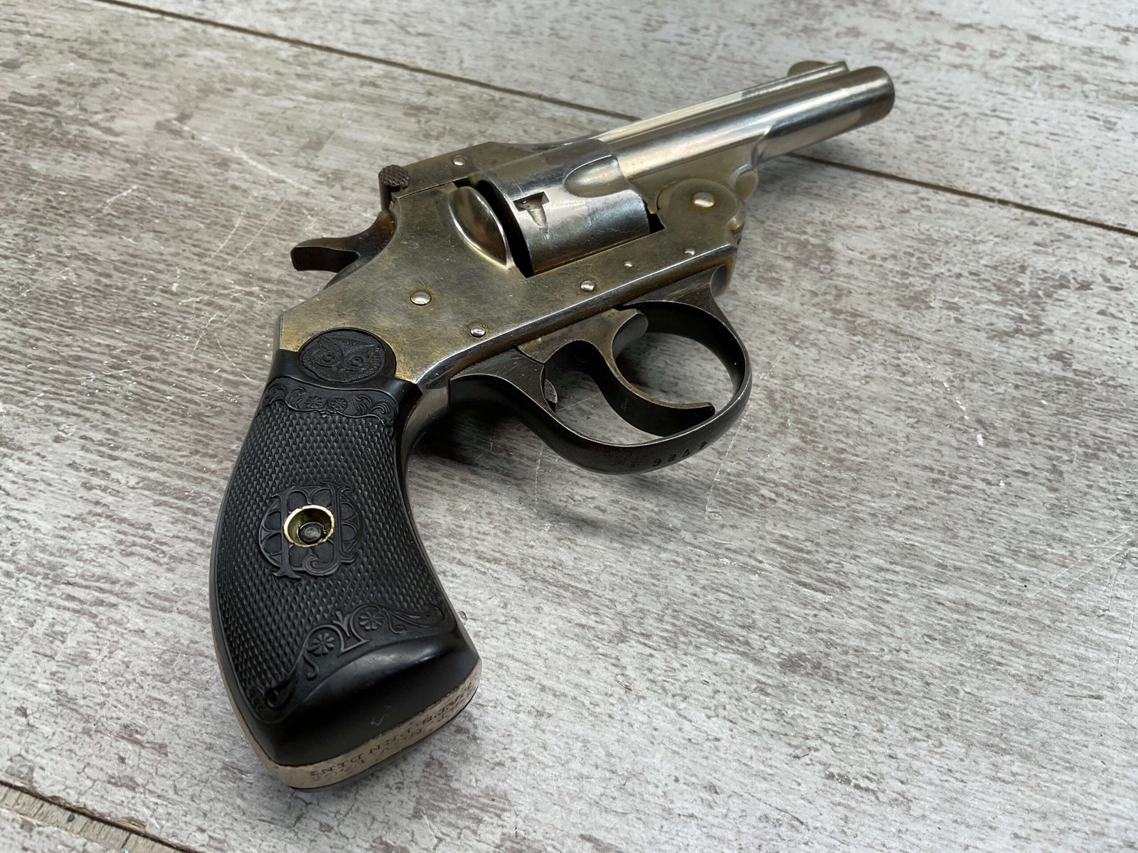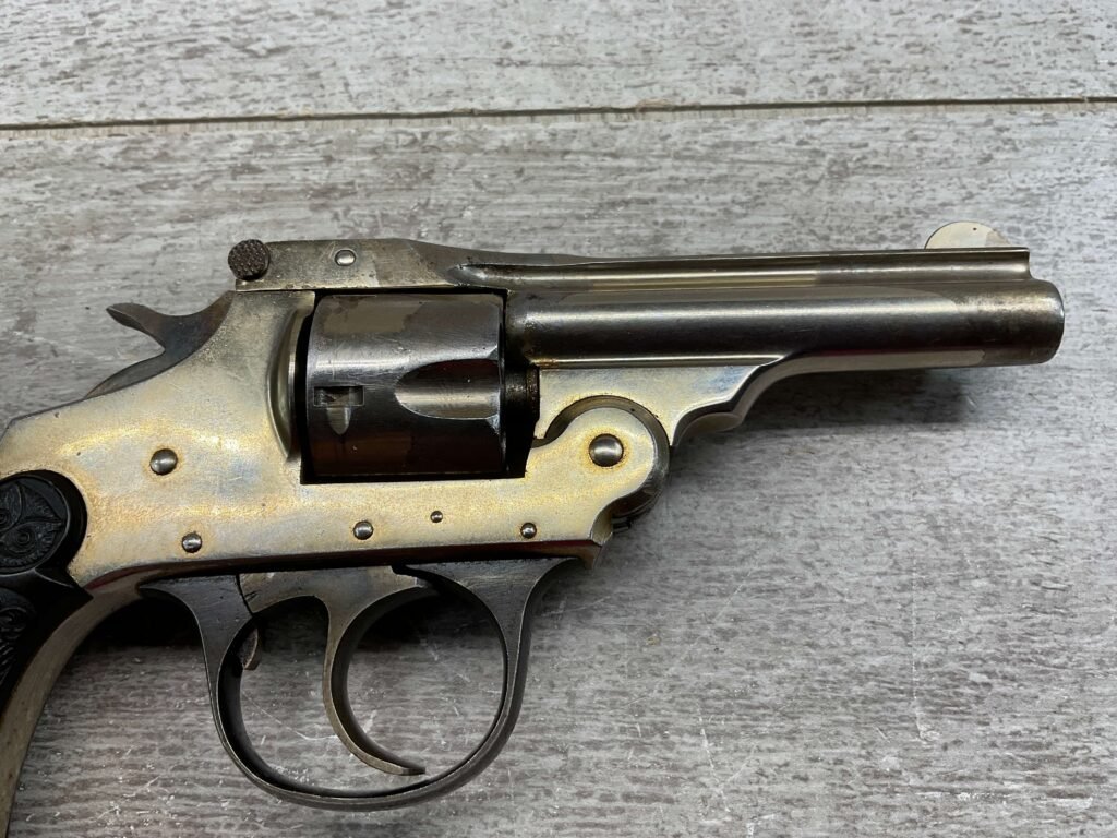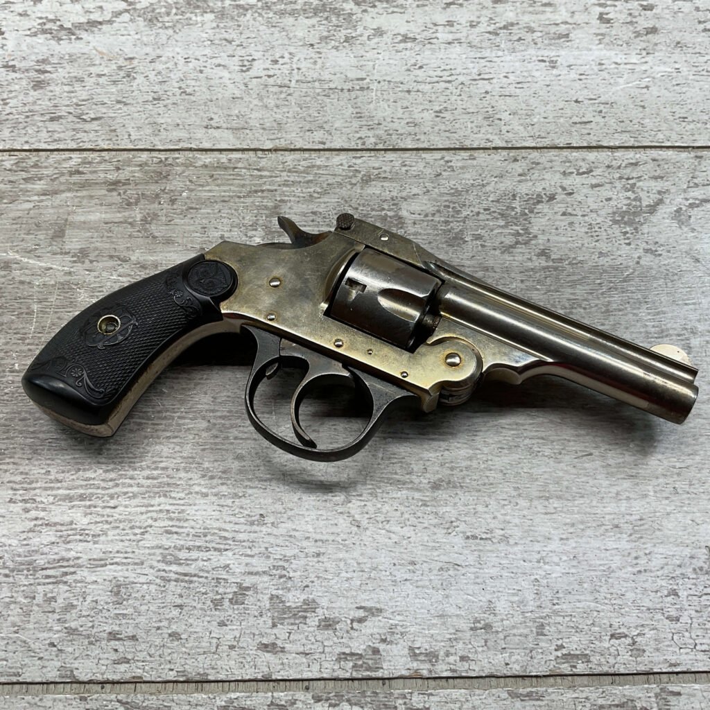 IVER JOHNSON & CYCLE WORKS SECOND MODEL TOP BREAK 32 S&W REVOLVER #4786, 3″BARREL, EXC “OWL” CHECKERED PLASTIC GRIPS, CASE COLOR HARDENED TRIGGER & HAMMER, 5 SHOT CYLINDER, TOP BREAK, SA/DA, GOOD NICKEL FINISH, BRIGHT BORE W/LIGHT FROSTING THROUGHOUT, SMOOTH ACTION, 80%+ OVERALL