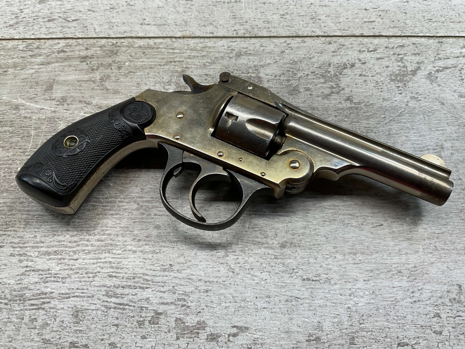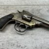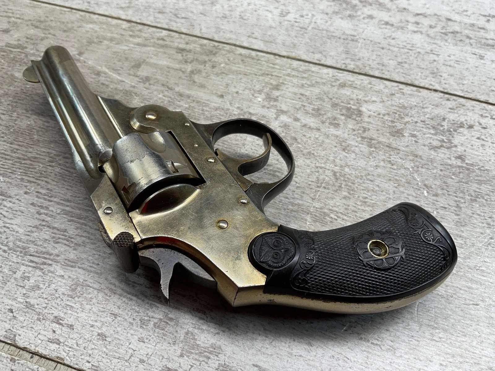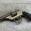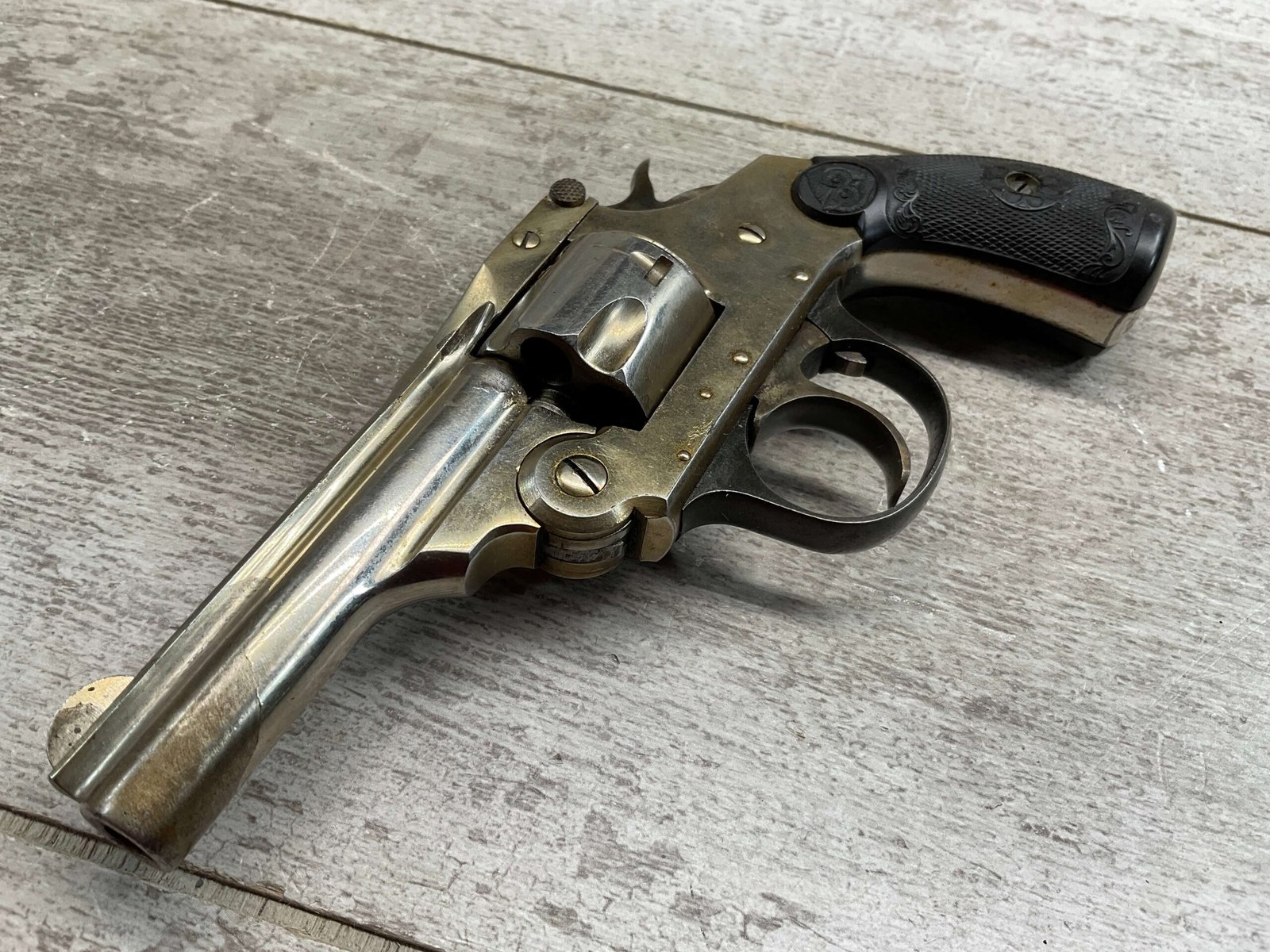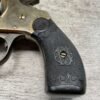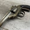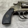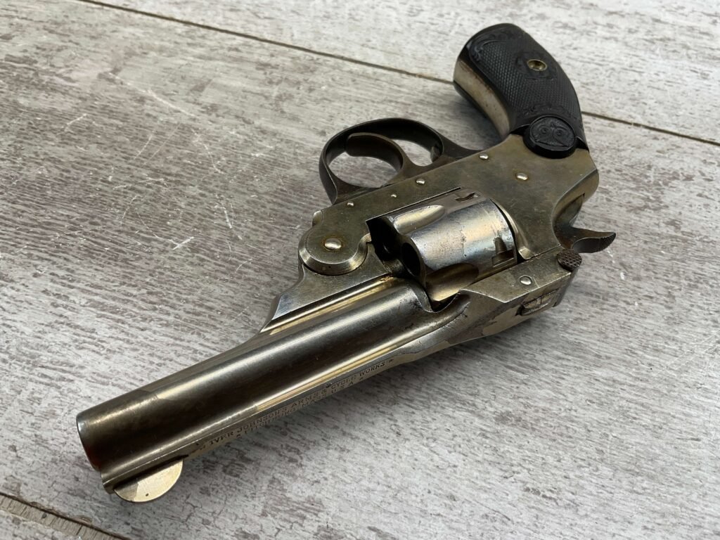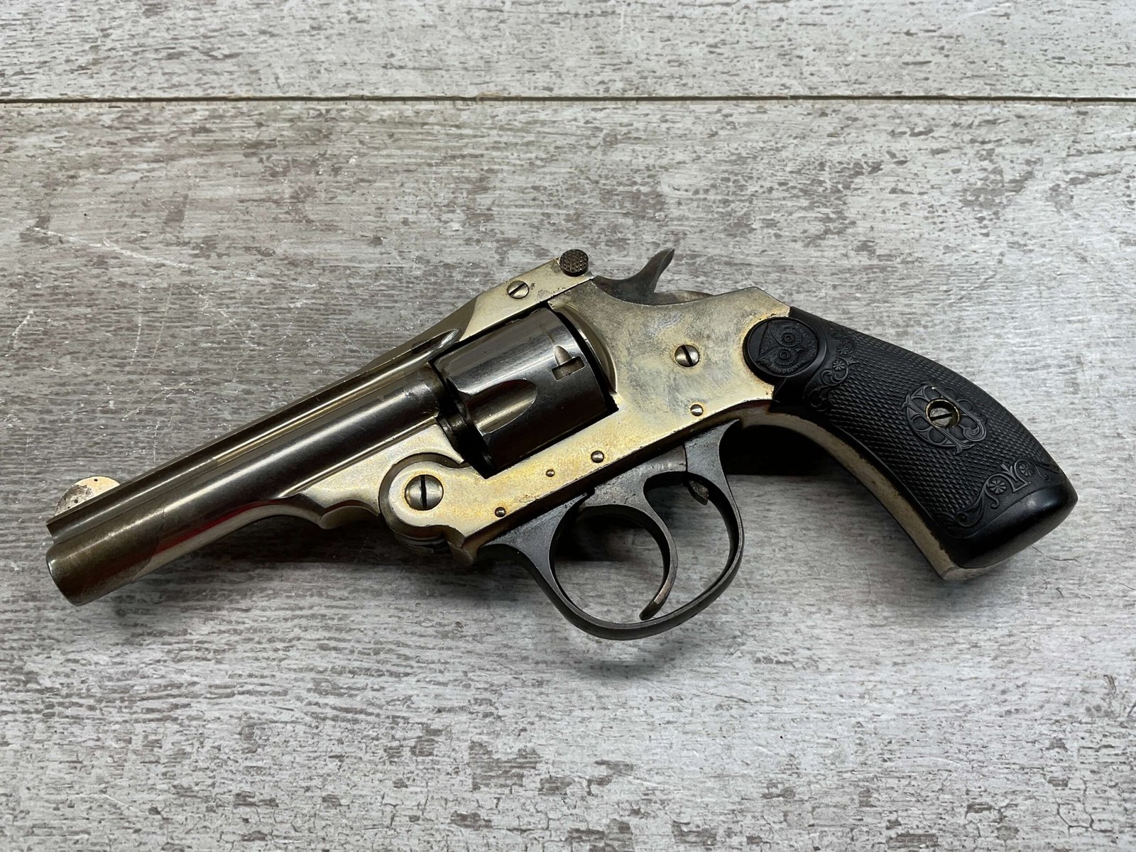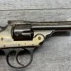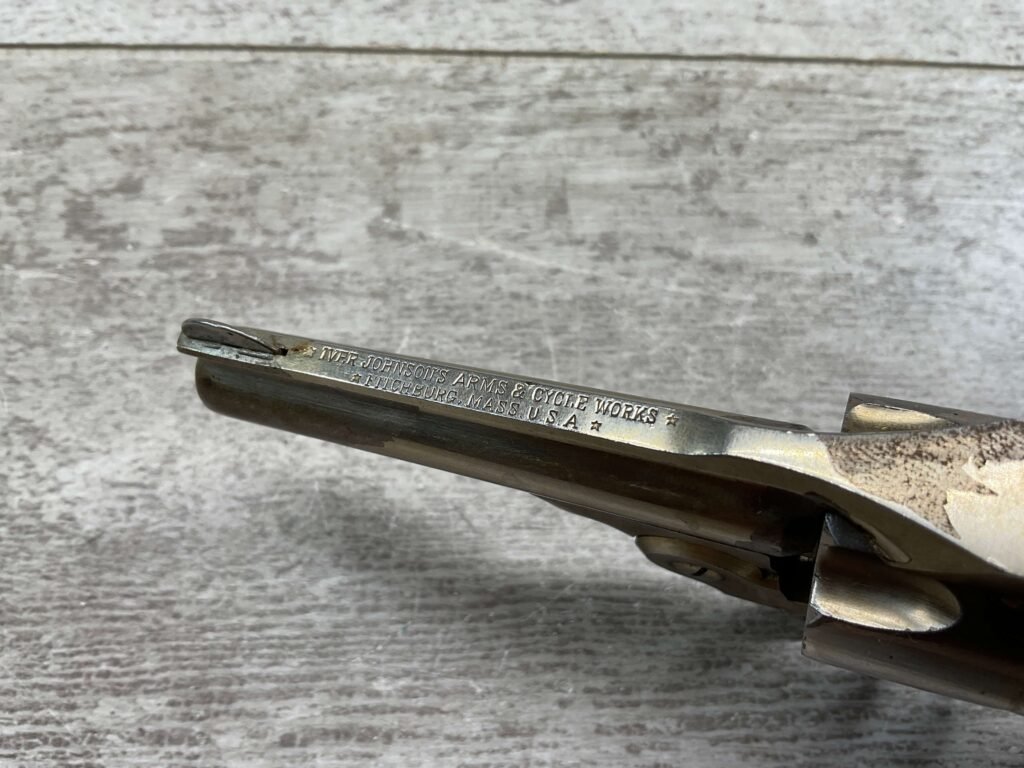 IVER JOHNSON & CYCLE WORKS SECOND MODEL TOP BREAK 32 S&W REVOLVER #4786, 3″BARREL, EXC “OWL” CHECKERED PLASTIC GRIPS, CASE COLOR HARDENED TRIGGER & HAMMER, 5 SHOT CYLINDER, TOP BREAK, SA/DA, GOOD NICKEL FINISH, BRIGHT BORE W/LIGHT FROSTING THROUGHOUT, SMOOTH ACTION, 80%+ OVERALL