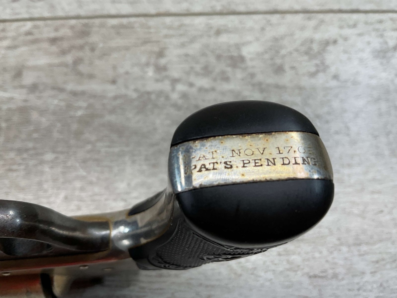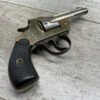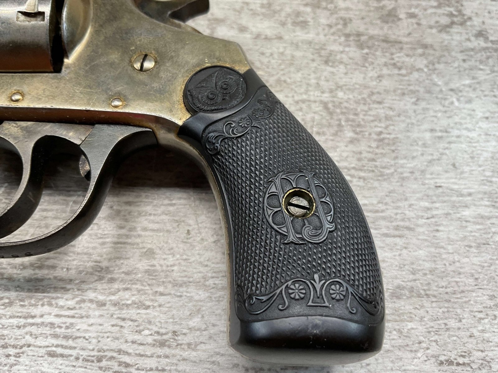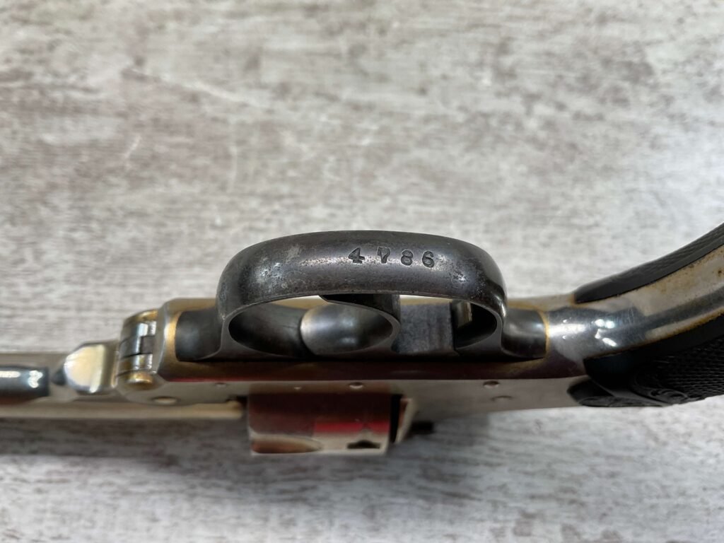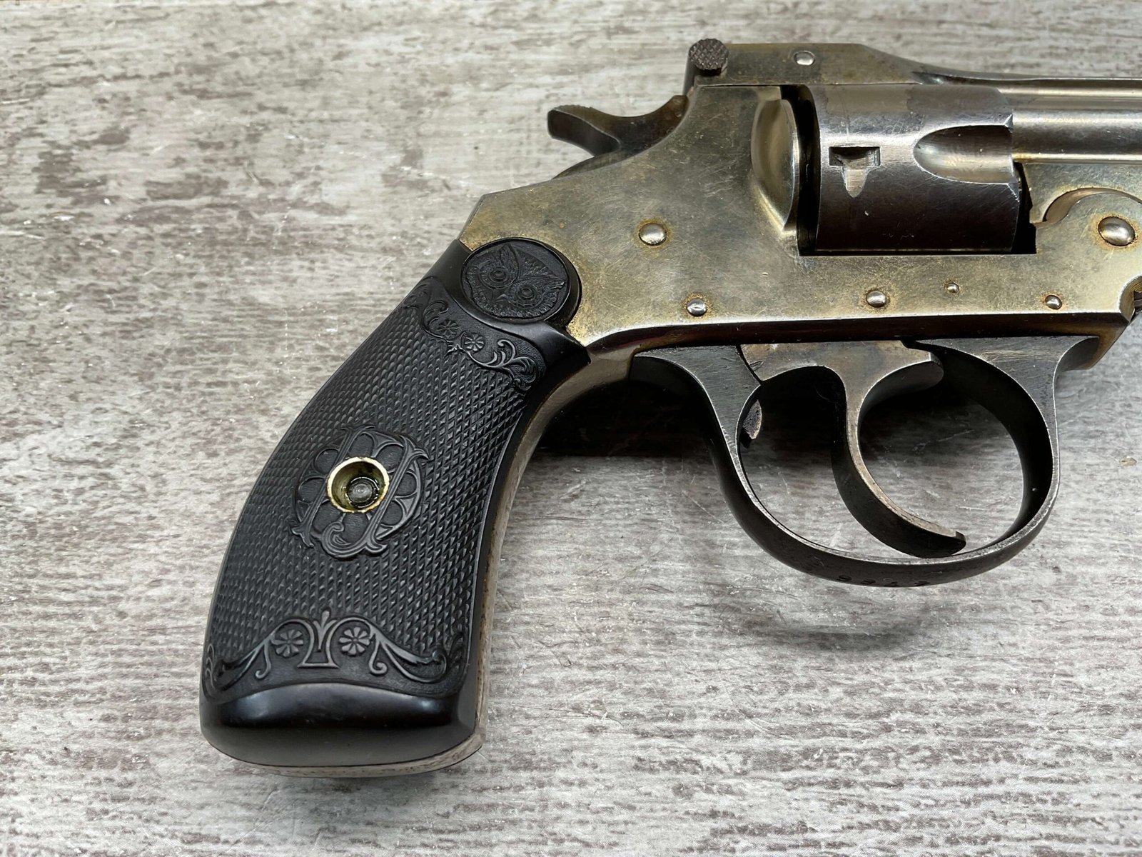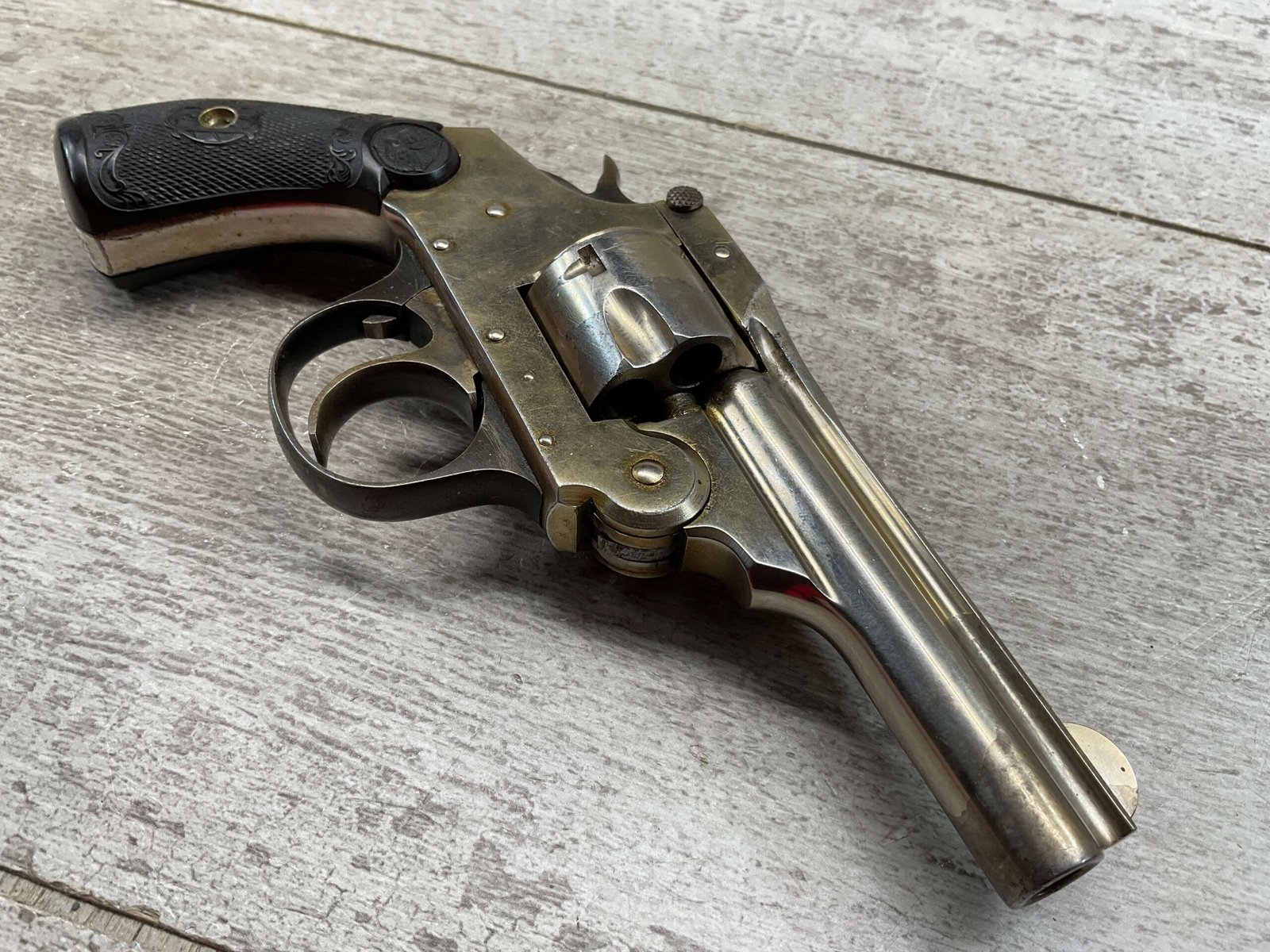 IVER JOHNSON & CYCLE WORKS SECOND MODEL TOP BREAK 32 S&W REVOLVER #4786, 3″BARREL, EXC “OWL” CHECKERED PLASTIC GRIPS, CASE COLOR HARDENED TRIGGER & HAMMER, 5 SHOT CYLINDER, TOP BREAK, SA/DA, GOOD NICKEL FINISH, BRIGHT BORE W/LIGHT FROSTING THROUGHOUT, SMOOTH ACTION, 80%+ OVERALL