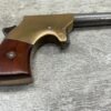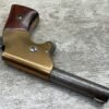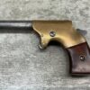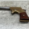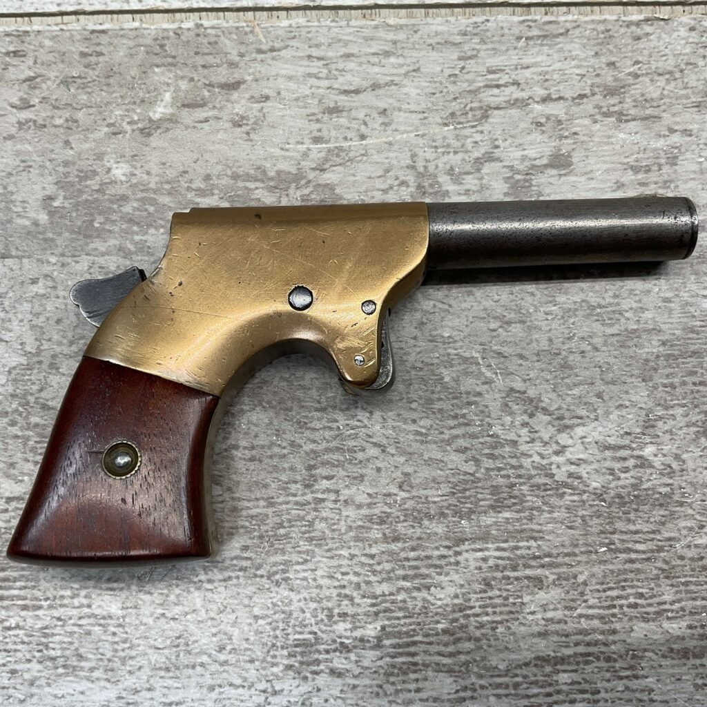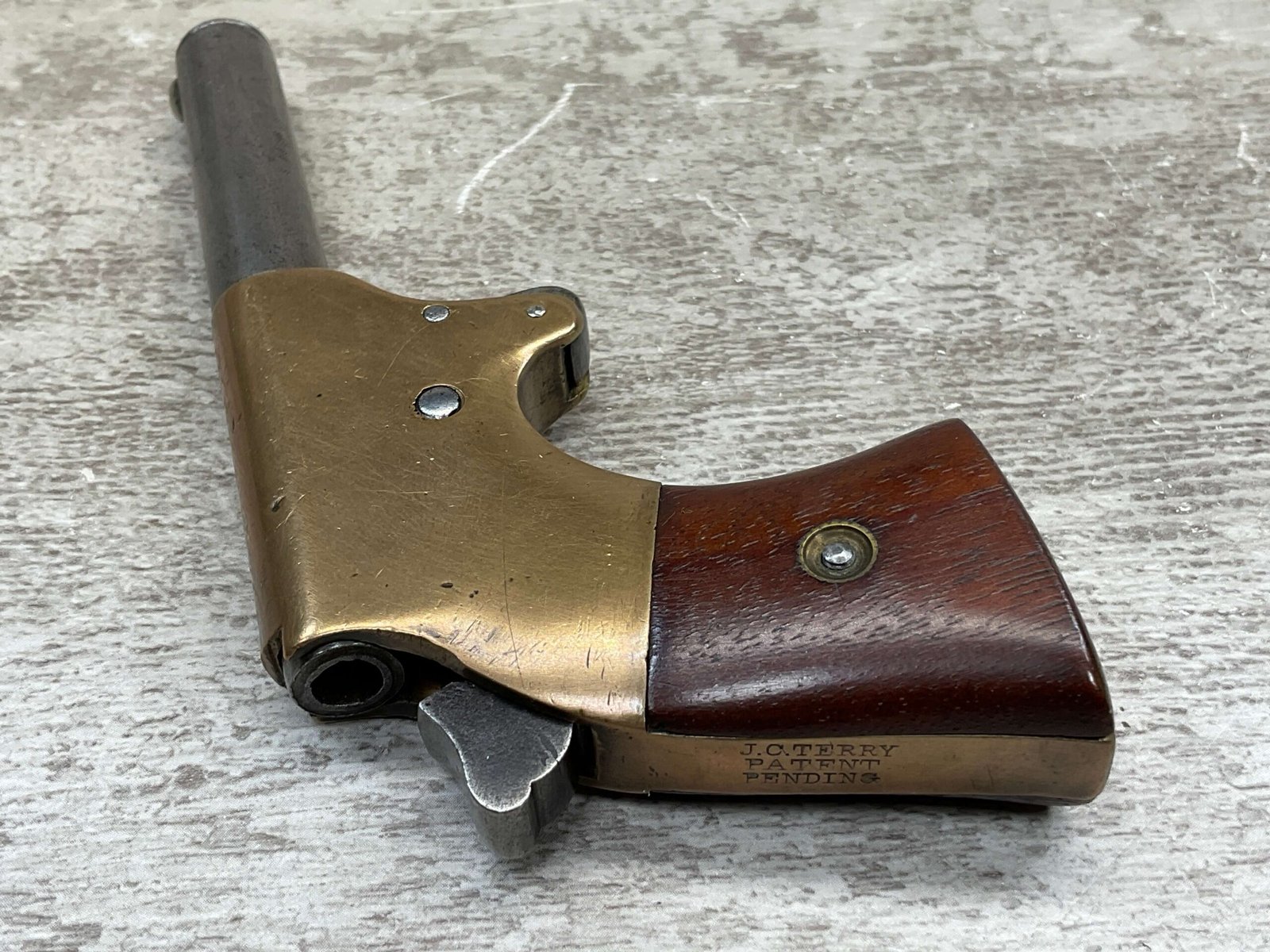 J.C. TERRY DERRINGER SINGLE SHOT POCKET PISTOL, .22 RIMFIRE, #243, 3 3/4″ ROUND BARREL WHICH IS WORN W/ LIGHT PITTING & GOOD RIFLING, “J.C. TERRY / PATENT / PENDING” STAMPED ON BACKSTRAP, EXC BRASS FRAME, EXC MATCHING SMOOTH ROSEWOOD GRIPS, “243” SERIAL ON FROM OF GRIP FRAME, BARREL UNSCREWS FROM THE FRAME, VERY COOL DESIGN, NOT A REPRODUCTION, OVERALL CONDITION AS SEEN IN PHOTOS