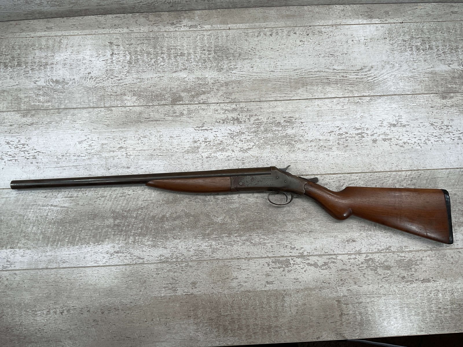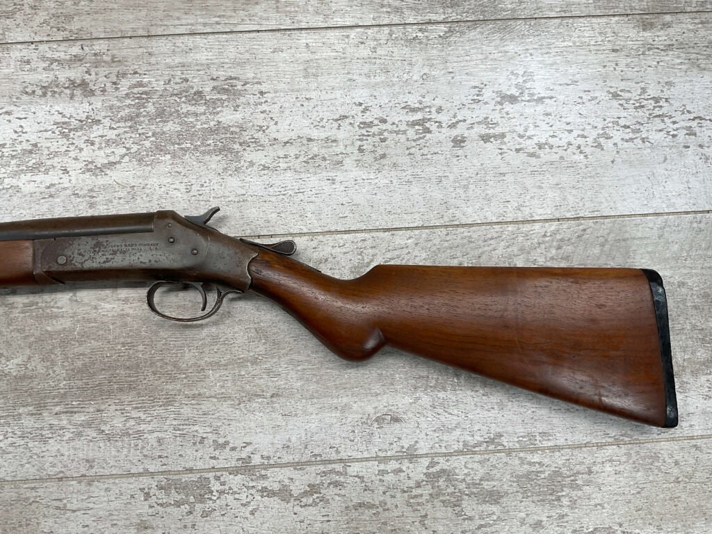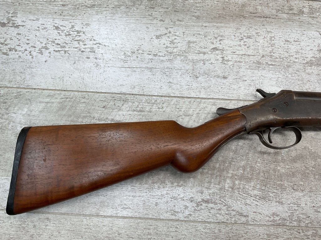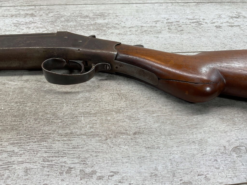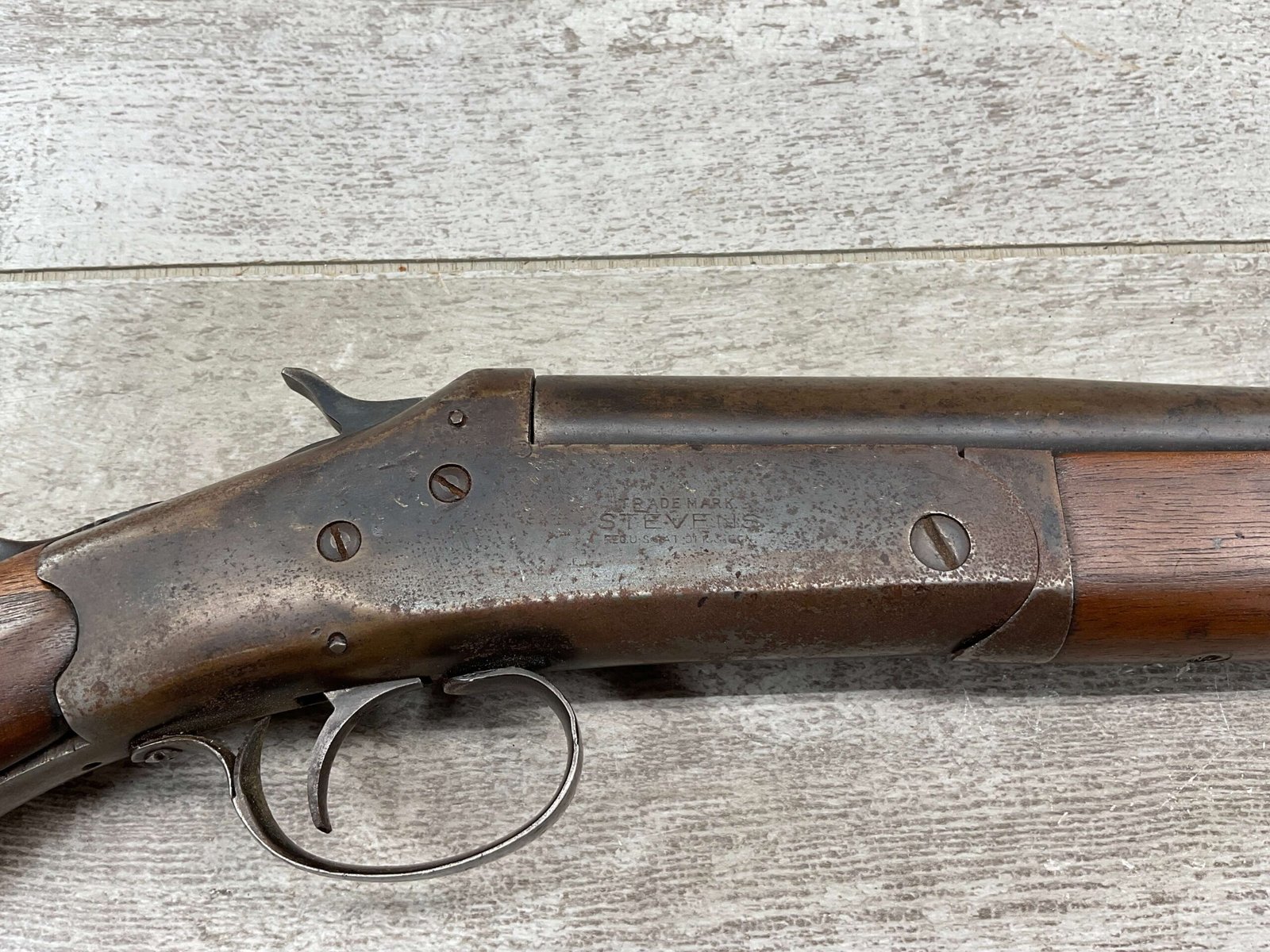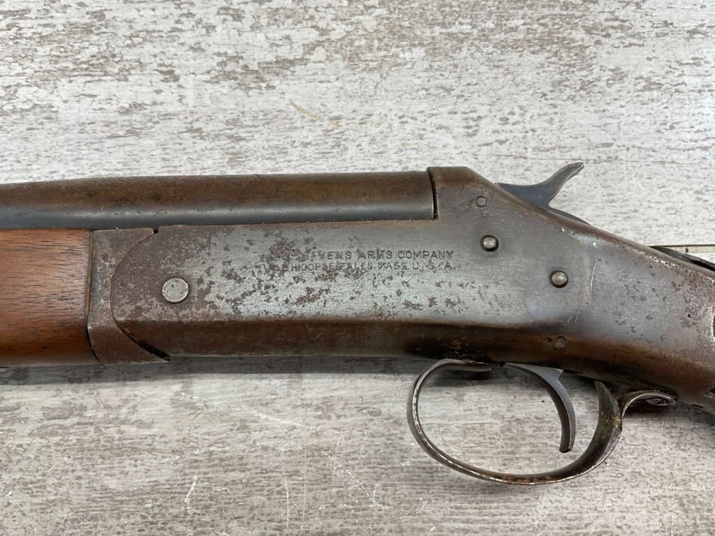 J. STEVENS SINGLE-SHOT 12 GA BREAK ACTION SHOTGUN, NSN, 22″ BBL, BRIGHT BORE WITH LIGHT PITTING THROUGHOUT, LIGHT RUST AND PITTING THROUGHOUT THE EXTERIOR METAL, TOP OF THE BBL IS STAMPED WITH “PATENTED AUGUST 12 1913”, LEFT SIDE OF THE RECIEVER IS STAMPED “J. STEVENS ARMS COMPANY” OVER “CHICOPEE FALLS, MASS, USA” PLASTIC BUTTPLATE WITH “STEVENS” STAMP. FAIR-GOOD CONDITION.