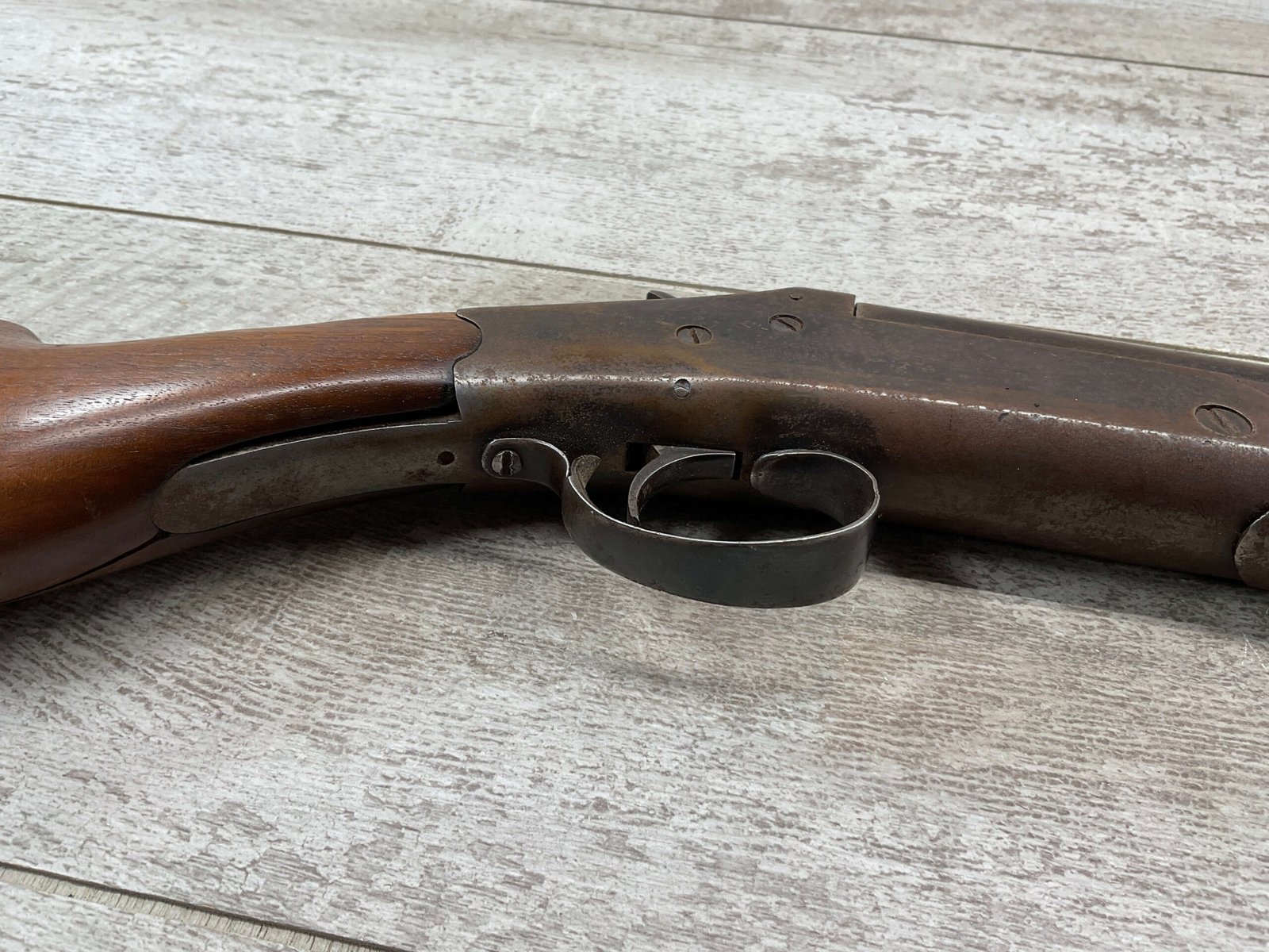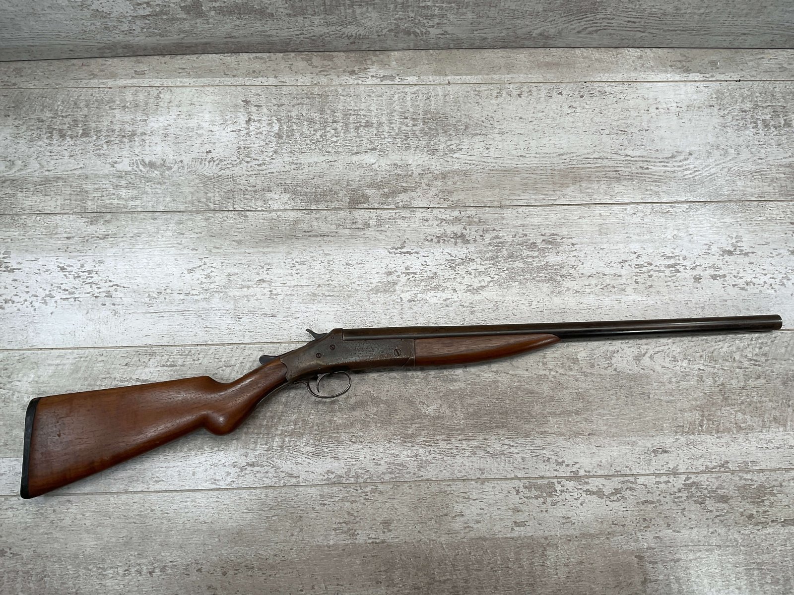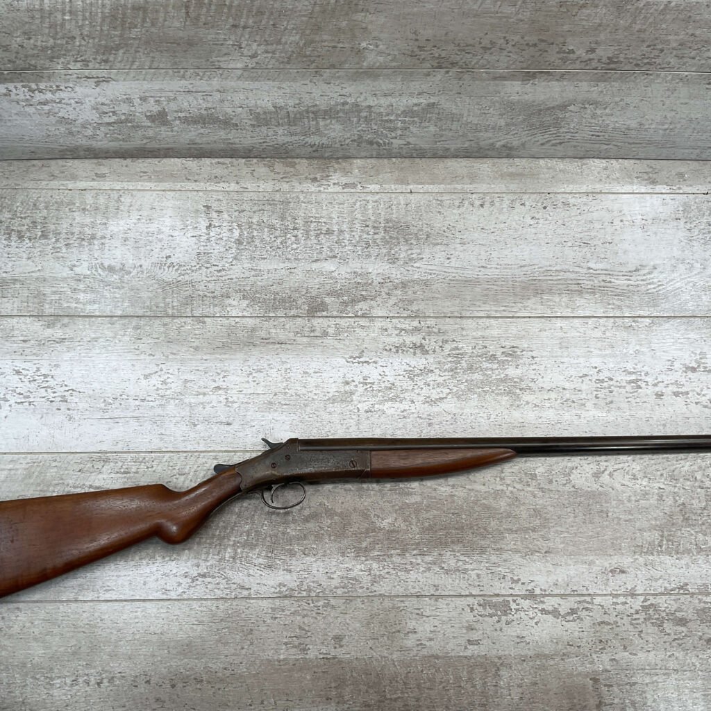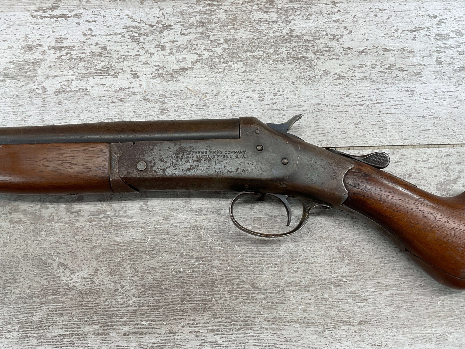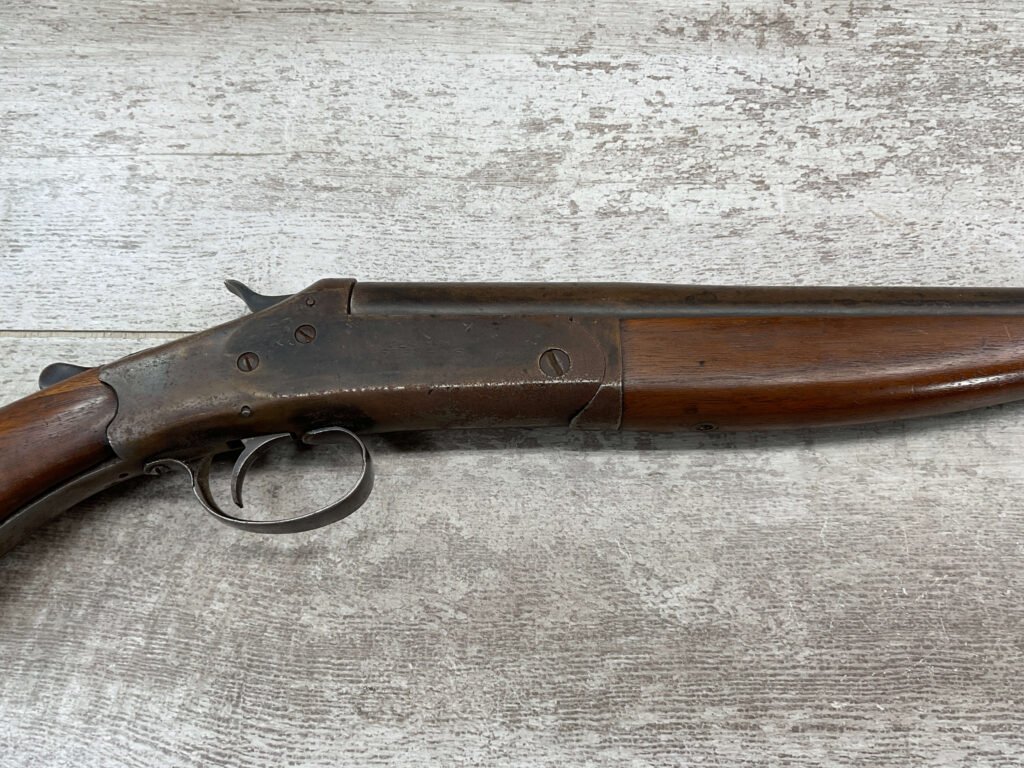 J. STEVENS SINGLE-SHOT 12 GA BREAK ACTION SHOTGUN, NSN, 22″ BBL, BRIGHT BORE WITH LIGHT PITTING THROUGHOUT, LIGHT RUST AND PITTING THROUGHOUT THE EXTERIOR METAL, TOP OF THE BBL IS STAMPED WITH “PATENTED AUGUST 12 1913”, LEFT SIDE OF THE RECIEVER IS STAMPED “J. STEVENS ARMS COMPANY” OVER “CHICOPEE FALLS, MASS, USA” PLASTIC BUTTPLATE WITH “STEVENS” STAMP. FAIR-GOOD CONDITION.