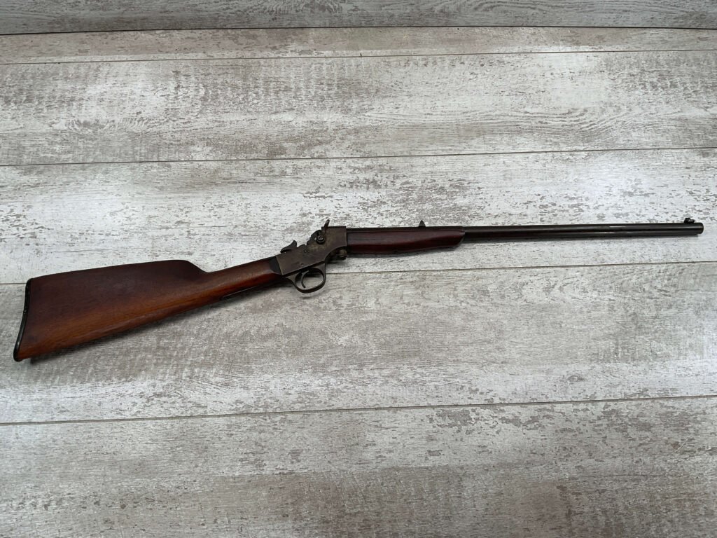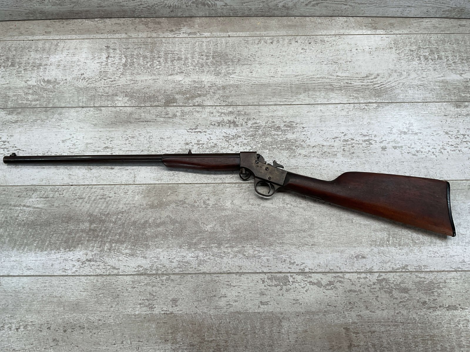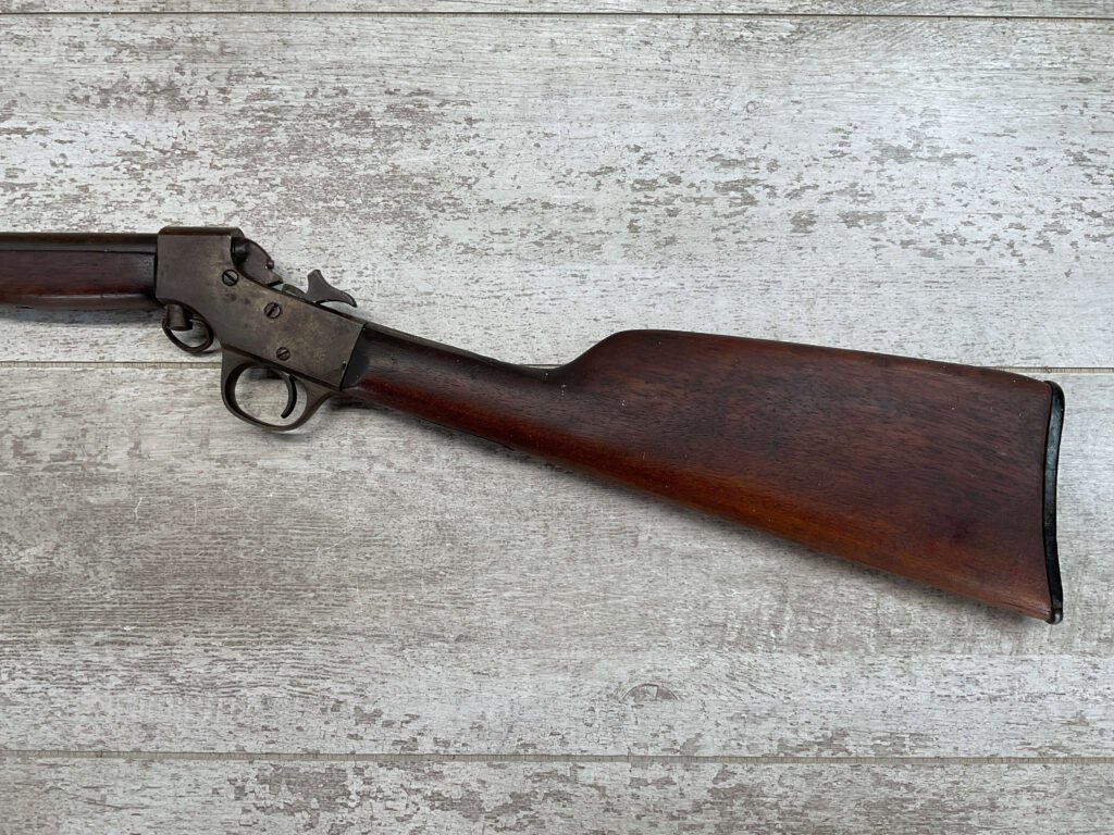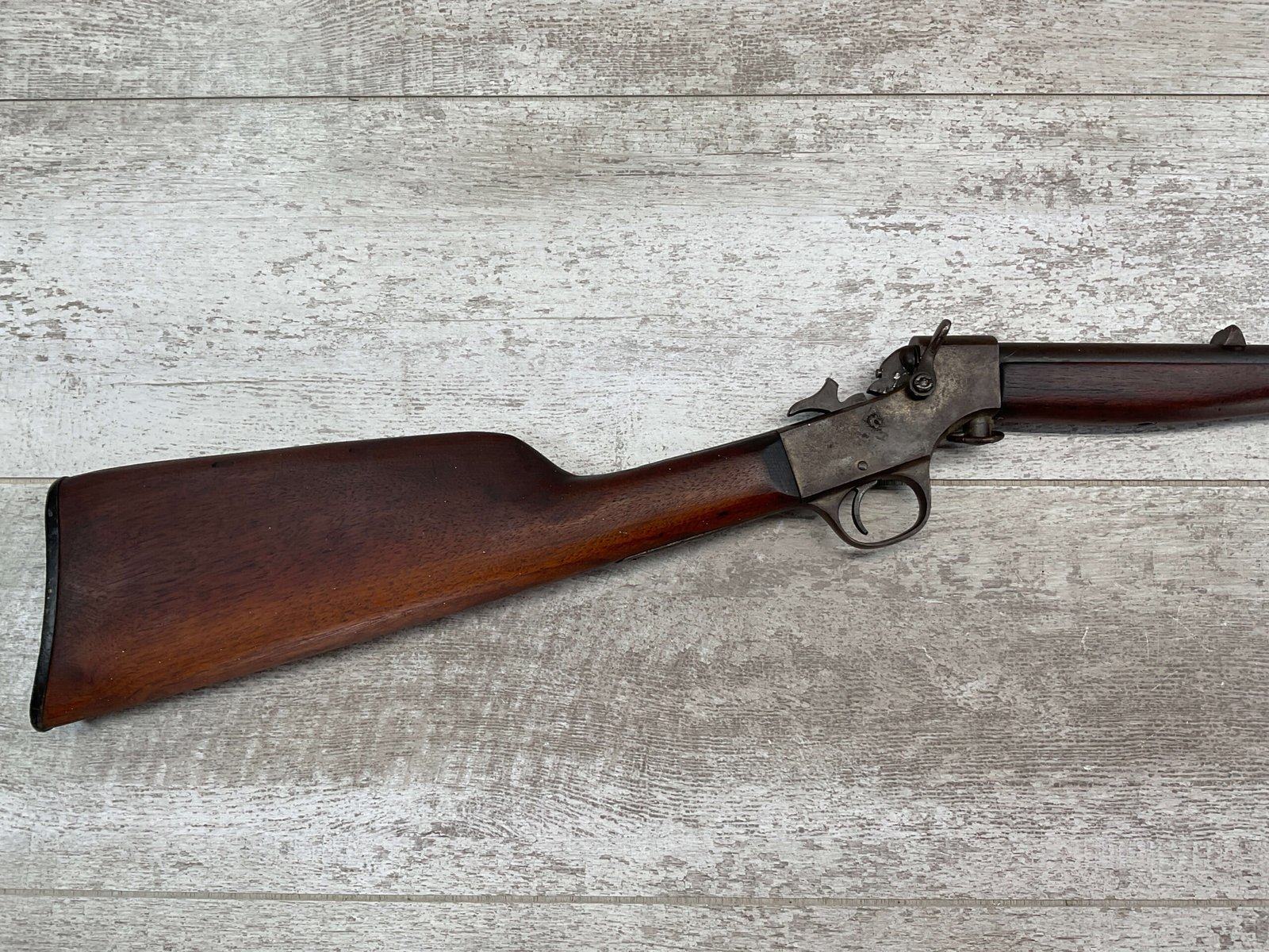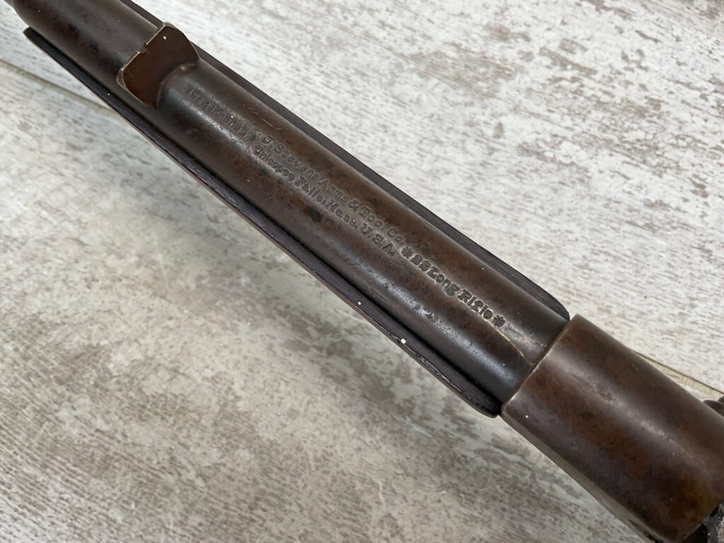 J STEVENS CRACKSHOT .22LR SINGLE SHOT FALLING BLOCK RIFLE #K 707, 20″ ROUND BARREL, TAKEDOWN, GREY/BROWN PATINA, MECHANICALLY FUNTIONS EXCELLENT, PLASTIC BUTT PLATE, VG WALNUT WOOD W/NORMAL NICKS & DINGS FROM AGE, EARLY SERIAL NUMBER, GREAT ADDITION TO THE SINGLE SHOT COLLECTION!!