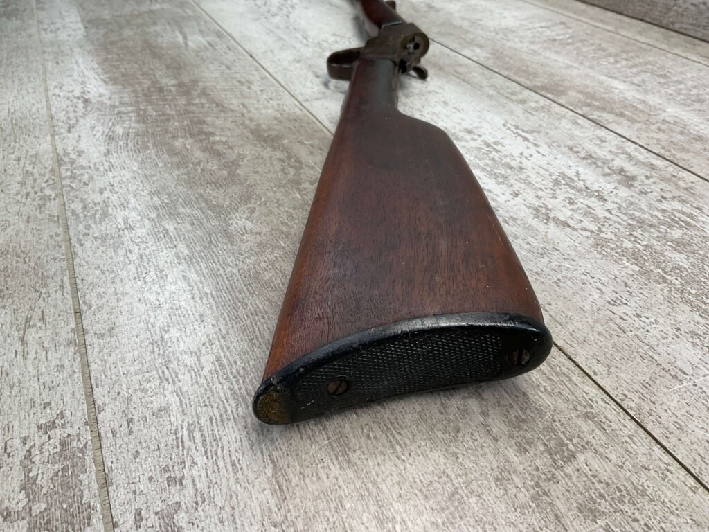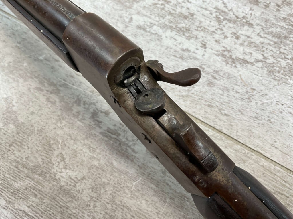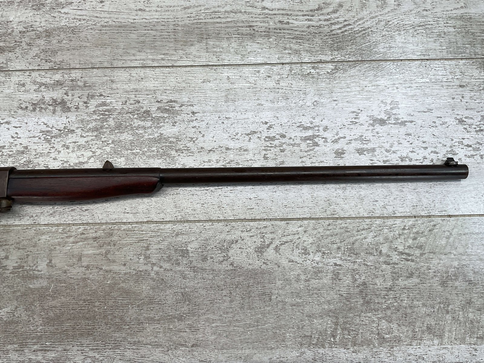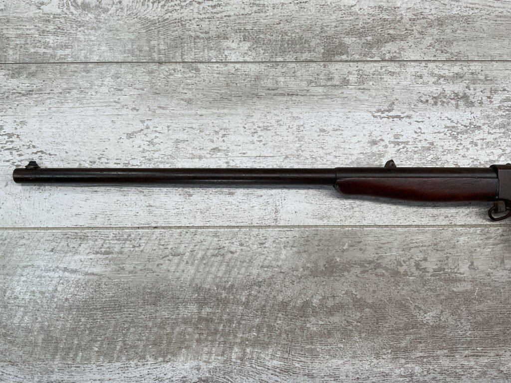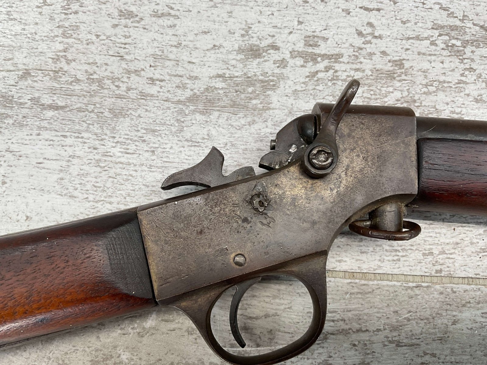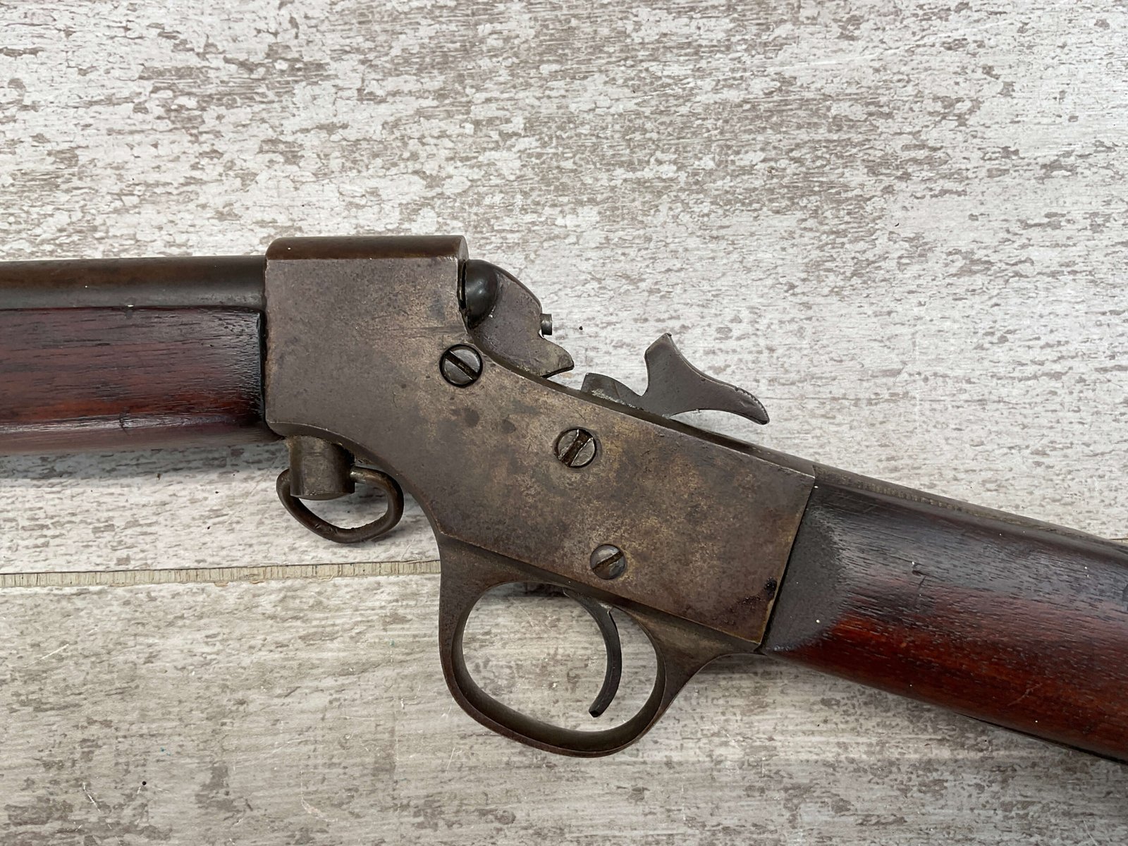 J STEVENS CRACKSHOT .22LR SINGLE SHOT FALLING BLOCK RIFLE #K 707, 20″ ROUND BARREL, TAKEDOWN, GREY/BROWN PATINA, MECHANICALLY FUNTIONS EXCELLENT, PLASTIC BUTT PLATE, VG WALNUT WOOD W/NORMAL NICKS & DINGS FROM AGE, EARLY SERIAL NUMBER, GREAT ADDITION TO THE SINGLE SHOT COLLECTION!!