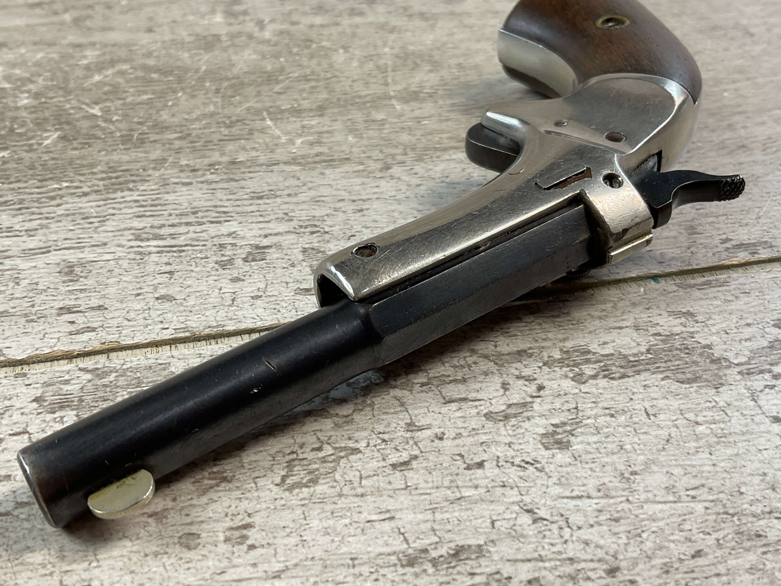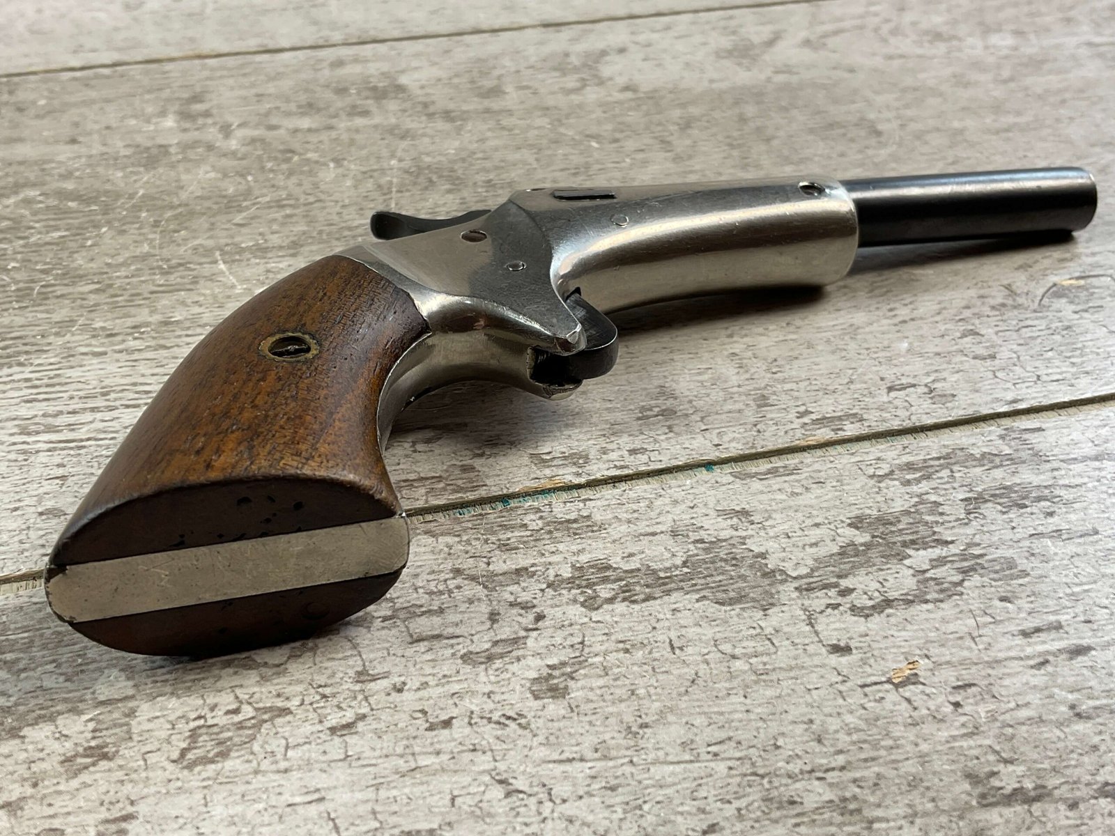 J. STEVENS MODEL 41 TIP UP .22LR SINGLE SHOT PISTOL, JAMES EARL JONES COLLECTION #77290, 3.5″ BARREL, EXC MIRROR BORE & RIFLING, VG-EXC ORIGINAL NICKEL FINISH W/ EXC MATCHING SMOOTH WALNUT GRIPS, EXTRACTOR, BLUED TRIGGER & HAMMER, MECHANICALLY EXCELLENT, CONDITION AS SHOWN IN PICTURES, FROM THE JAMES EARL JONES “FAVORITES” COLLECTION W/ CERTIFICATE OF AUTHENTICITY.